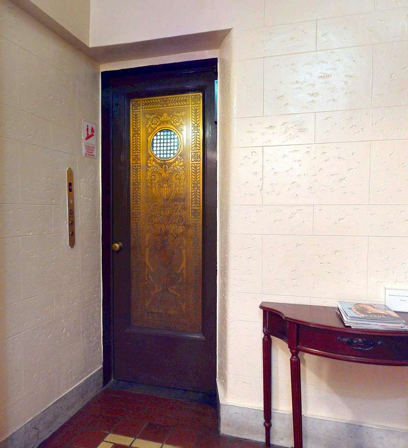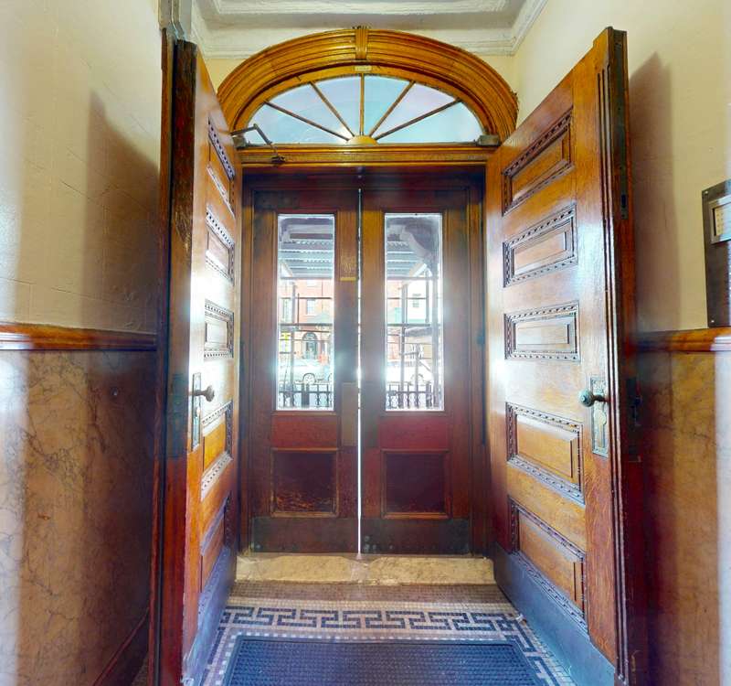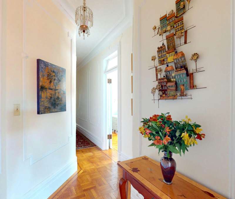 The apartment has an abundance of prewar details including glass French doors, high ceilings, glass transoms, vintage chandeliers, bordered original hardwood flooring and original moldings and millwork throughout.