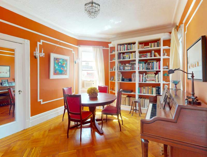 You enter this 10 unit self-managed cooperative through the original oak double doors and ride a keyed elevator up to the top (5th) floor. As you arrive in apartment 5W, you are struck by the ambiance of this truly special home which is flooded with light. The North facing living room has 3 windows with original wood shutters, a lovely decorative fireplace and mantle and a gorgeous wood sliding pocket door leading to the beautiful Formal Dining Room with built in floor to ceiling book/display cases. These rooms provide a distinctive place for relaxing and entertaining. Here you will enjoy intimate gatherings, or for special occasions you can invite over a large group of friends and relatives.