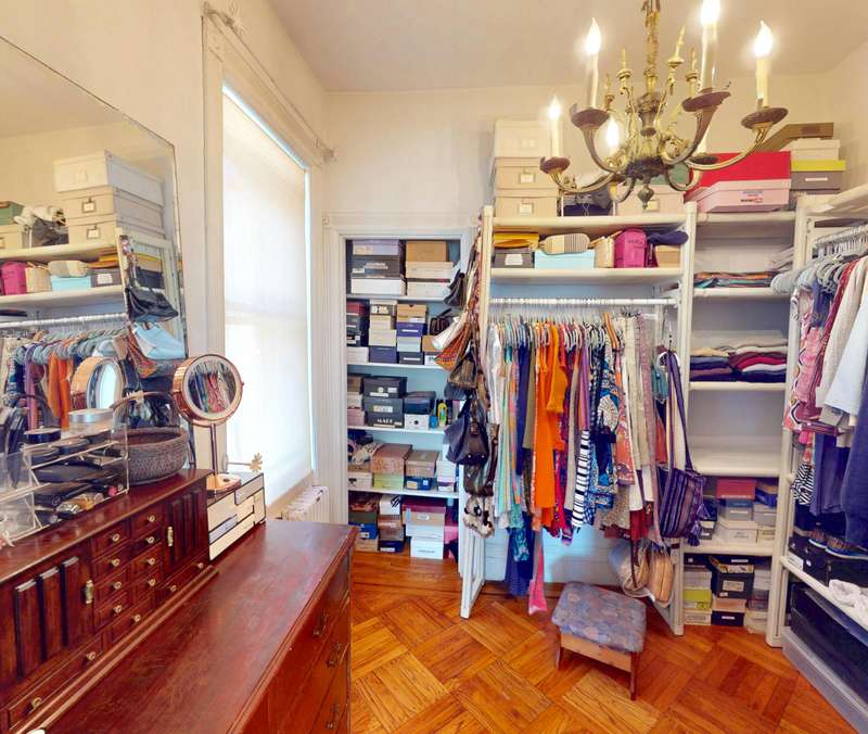 The Primary bedroom with another decorative fireplace and mantle is large enough to accommodate a reading area and a desk. Its windows face South and have lovely white shutters. There are 2 built-in corner display cabinets which add prewar charm to the space. If you have ever longed for a closet/dressing room with enough space for all your clothes, no need to wish any longer. Here is, yes, a third walk-in closet and one of the best you will find in NYC!