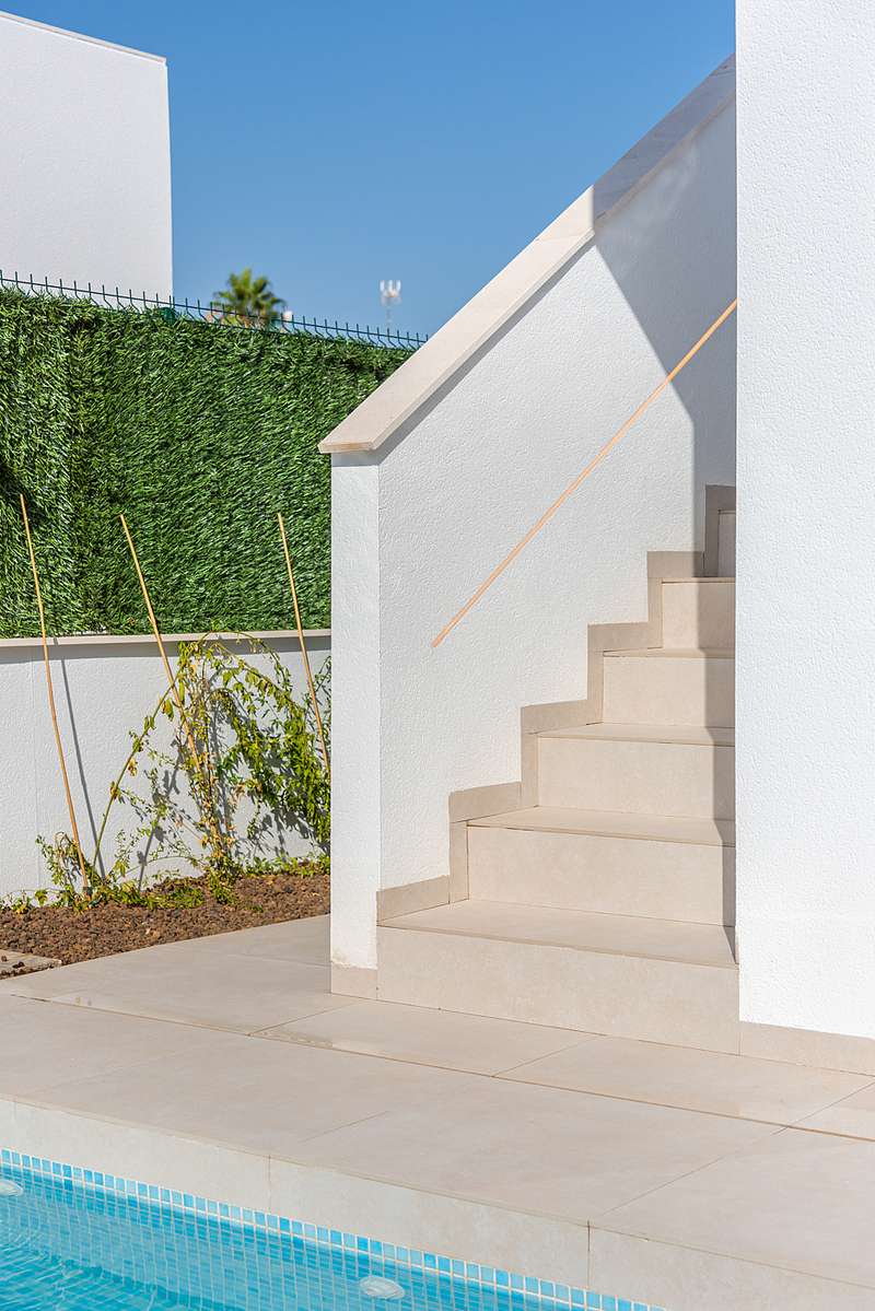 The villas for sale in Los Alcazares Spain are within walking distance from daily amenities, 2,3 km from the picturesque Playa de la Concha beach, 2,7 km from the lush 18-hole La Serena golf course, 13 km from the popular Dos Mares shopping center, 22 km from the port of San Pedro home to several luxury cruises, and just 34 km from the international airport of Murcia.