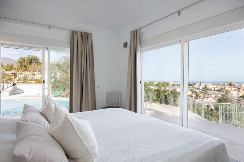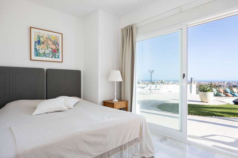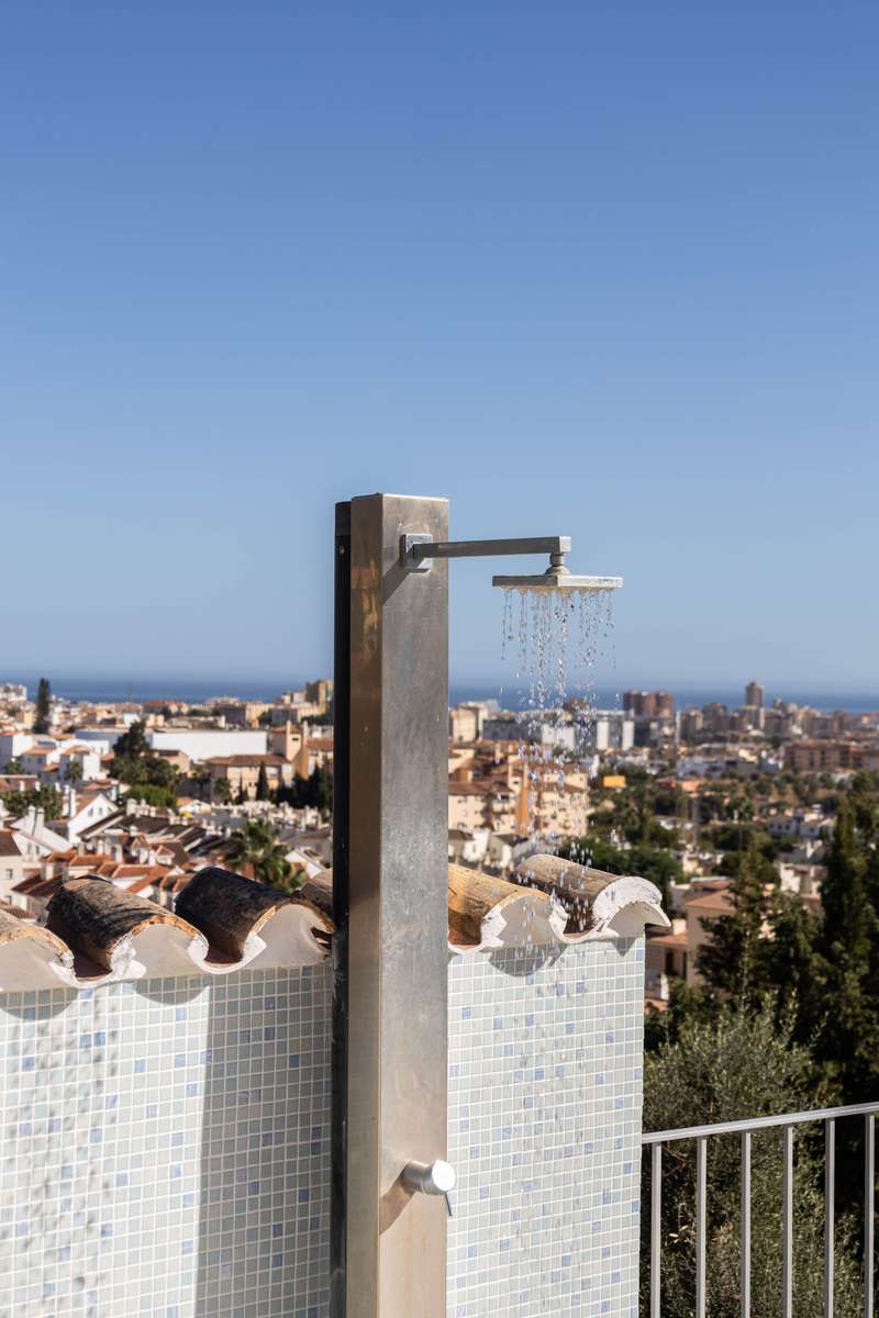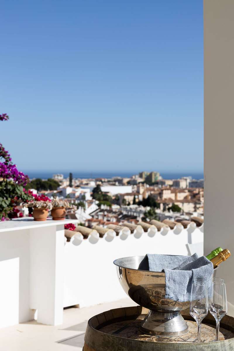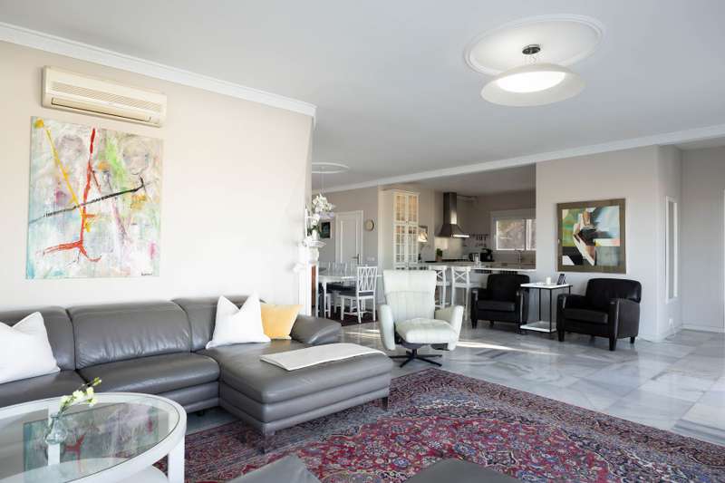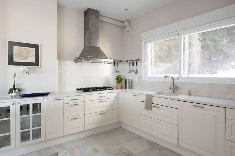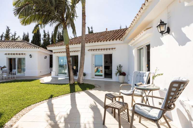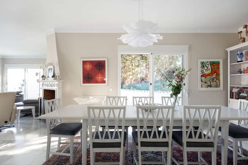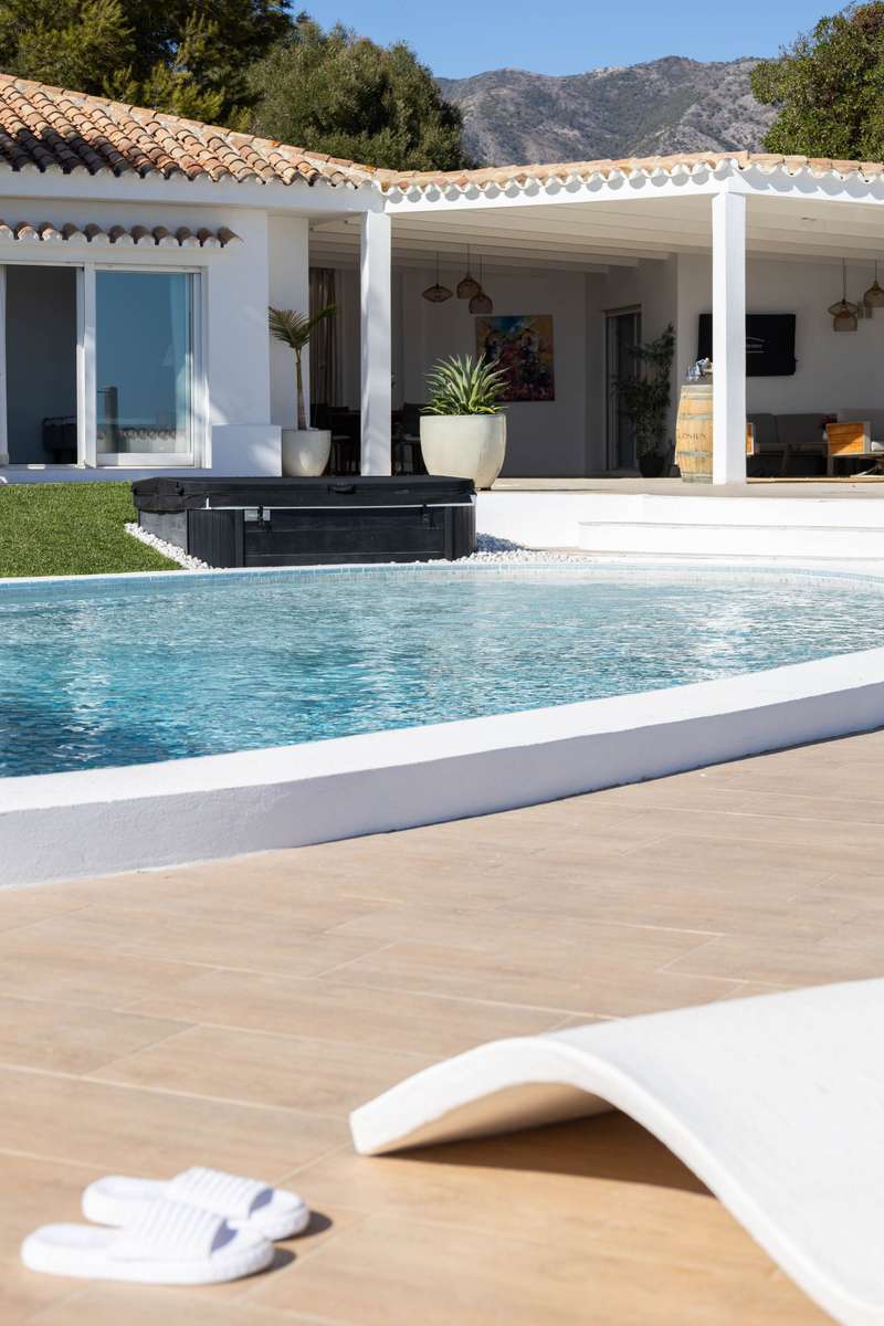 Welcome to this stunning, fully renovated villa in Mijas just a short walk from Fuengirola Centre and the beach. This exceptional home perfectly blends space, style, and comfort, offering the essence of the Costa del Sol lifestyle. Located near all amenities in Las Lagunas, including shops, schools, restaurants, and sports facilities, and just minutes from several of the area’s most prestigious golf courses, this property enjoys a truly privileged setting. With a generous built area, the villa has been beautifully modernized throughout and features a garage for two cars plus a carport for three more. Inside, you are greeted by a spacious, light-filled living room with large glass doors opening onto the terrace and pool area. The elegant design, generous layout, and cozy fireplace create a warm and inviting atmosphere. A guest toilet adds convenience on this level. The living area flows seamlessly into a modern open-plan kitchen, finished in marble and equipped with top-of-the-line