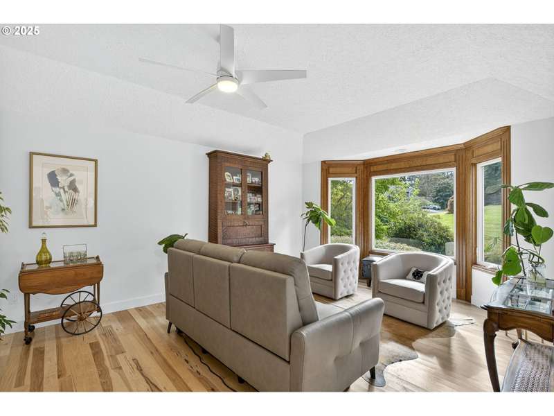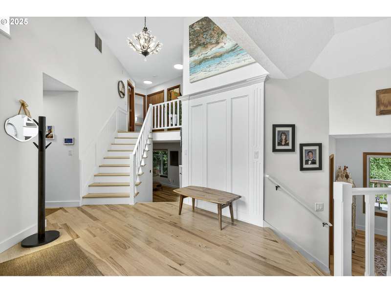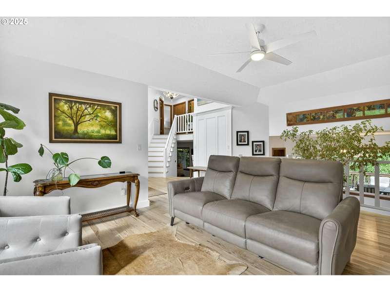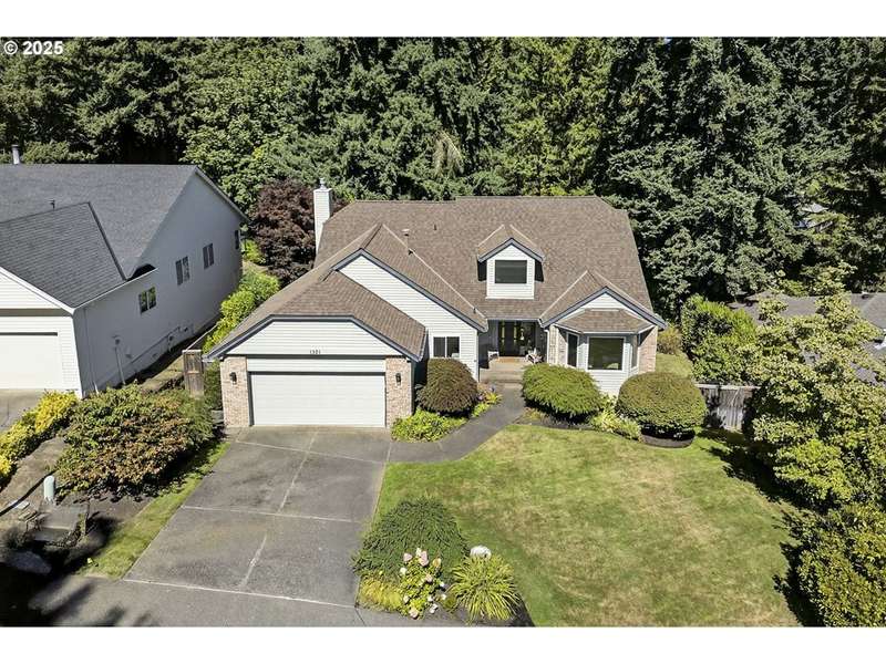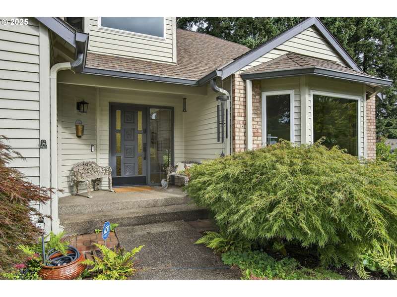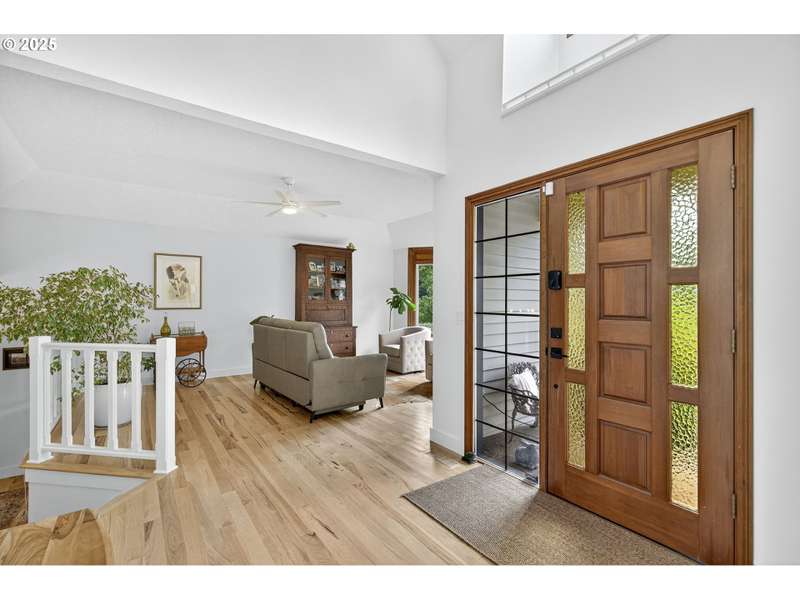 This beautifully updated custom West Linn home combines warmth, privacy, and modern comfort in a prime location. Across from Skyline Ridge Park with tennis and playground, and near the neighborhood pool, it offers both convenience and community. Inside, the light-filled living room features picture and casement windows with views of manicured green space. The double-height entry creates a bright, welcoming first impression, while hickory hardwood floors bring warmth throughout. The open kitchen connects seamlessly to the family room, with a wall of windows and a pass-through to the wood deck overlooking a fully fenced backyard. Mature landscaping includes evergreens, flowering shrubs, fruit trees, and raised garden beds—perfect for entertaining or quiet retreat. The family room centers on a cozy gas fireplace, while the primary suite offers a soaking tub with views of the private garden. Triple-pane windows ensure year-round comfort, complemented by modern lighting, electrical updates, and outdoor automation systems. Additional highlights include ample storage in a lighted attic, exterior crawlspace, and under-stair “Harry Potter” closet, plus a dog door, sprinkler system, and lighted walkways. Centrally located, the home provides easy access to parks, trails, shopping, dining, and freeways—and is served by the highly rated West Linn School District.