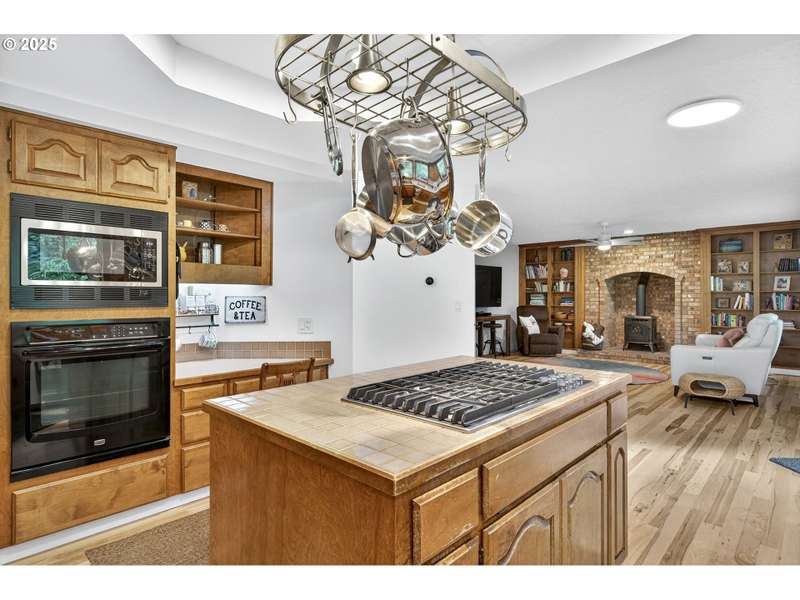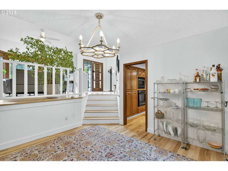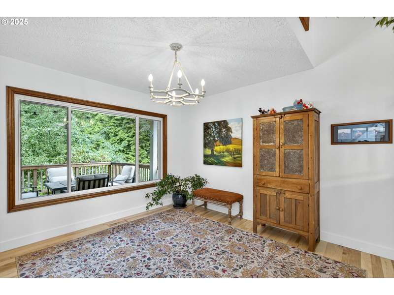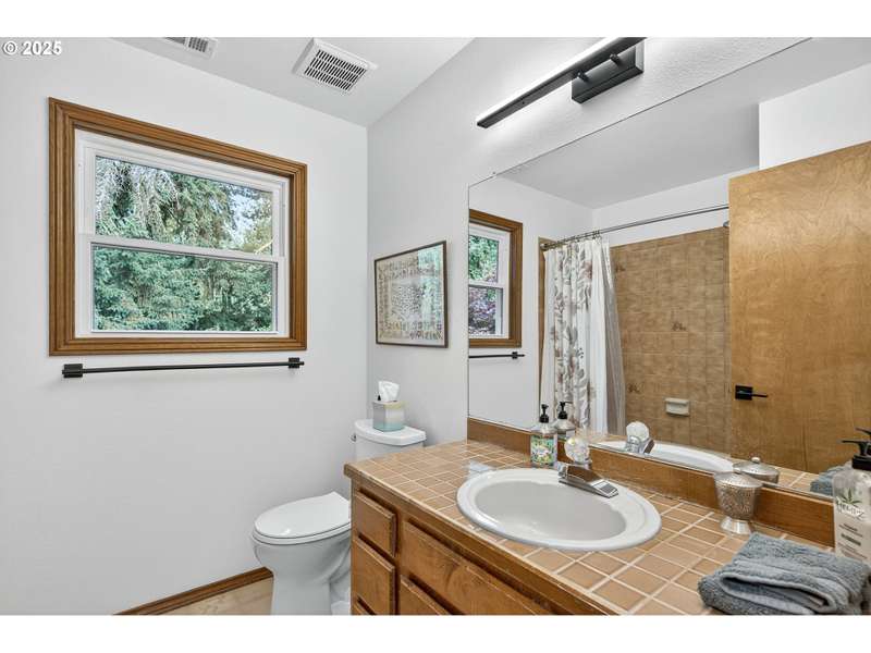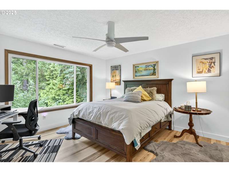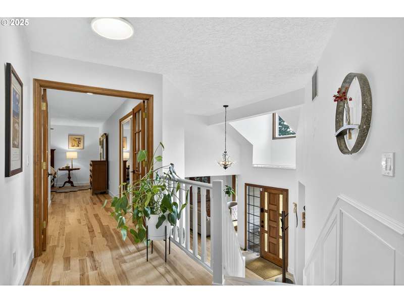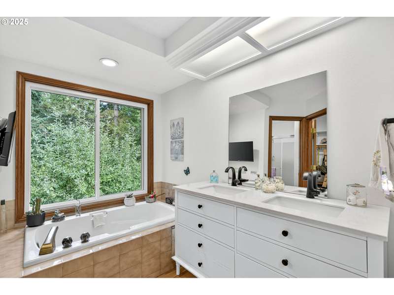 This beautifully updated custom West Linn home combines warmth, privacy, and modern comfort in a prime location. Across from Skyline Ridge Park with tennis and playground, and near the neighborhood pool, it offers both convenience and community. Inside, the light-filled living room features picture and casement windows with views of manicured green space. The double-height entry creates a bright, welcoming first impression, while hickory hardwood floors bring warmth throughout. The open kitchen connects seamlessly to the family room, with a wall of windows and a pass-through to the wood deck overlooking a fully fenced backyard. Mature landscaping includes evergreens, flowering shrubs, fruit trees, and raised garden beds—perfect for entertaining or quiet retreat. The family room centers on a cozy gas fireplace, while the primary suite offers a soaking tub with views of the private garden. Triple-pane windows ensure year-round comfort, complemented by modern lighting, electrical updates, and outdoor automation systems. Additional highlights include ample storage in a lighted attic, exterior crawlspace, and under-stair “Harry Potter” closet, plus a dog door, sprinkler system, and lighted walkways. Centrally located, the home provides easy access to parks, trails, shopping, dining, and freeways—and is served by the highly rated West Linn School District.