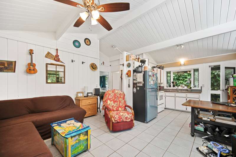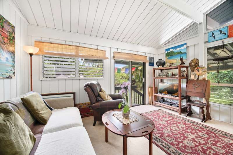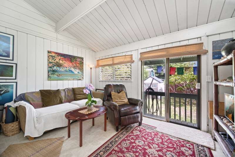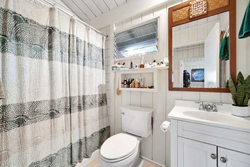 The front cottage has 907 square feet under roof, including 616 square feet of living area and a covered 291-square-foot lanai featuring a vibrant mountain view - an ideal spot for morning coffee or evening relaxation. The back cottage offers 800 square feet under roof, including 616 square feet of living space and a covered 184-square-foot lanai overlooking the garden, and a deep carport. Both cottages capture the natural light with their vaulted ceilings and numerous windows, creating a bright, airy atmosphere. The crisp white interiors beautifully contrast with the green views of the surrounding gardens, providing a tranquil and inviting environment. Each cottage has its own private yard separated by mature landscaping, ensuring privacy for each dwelling. Additionally, each cottage has its own outdoor shower area for rinsing off after a day at the beach as well as separate laundry areas for added convenience.