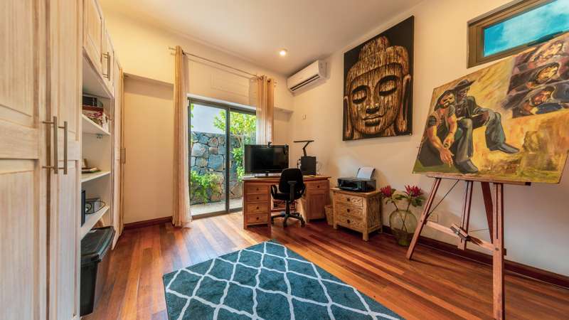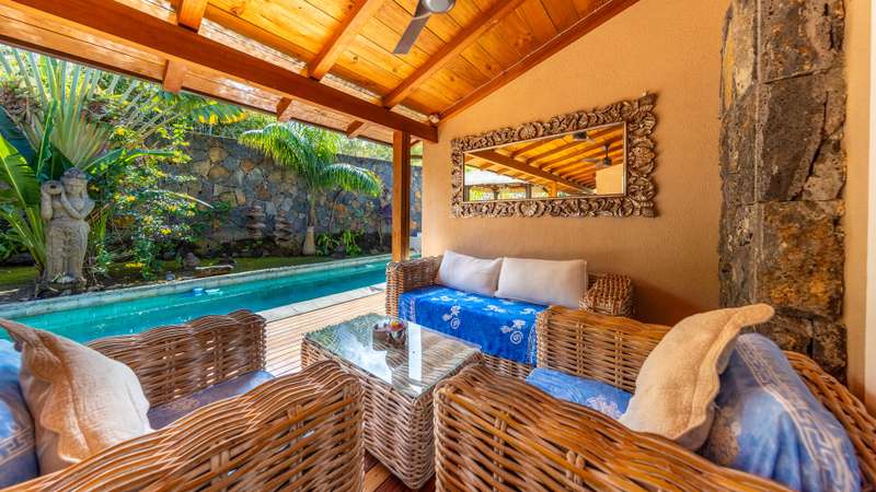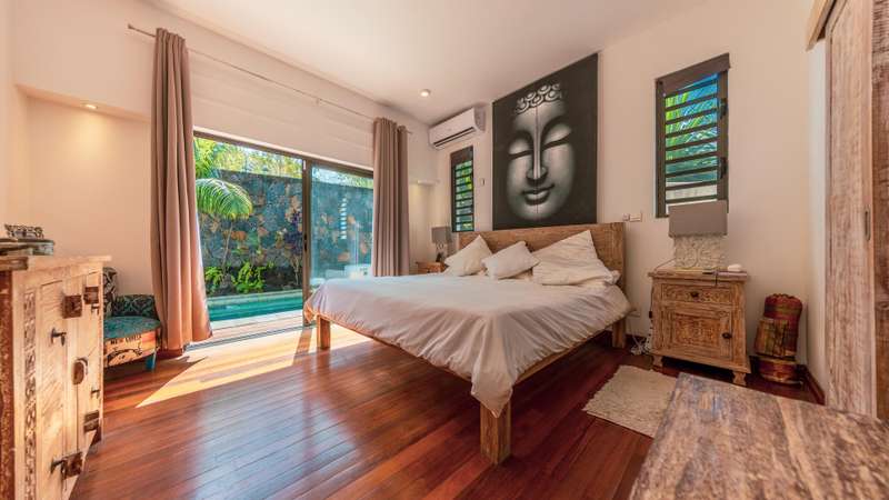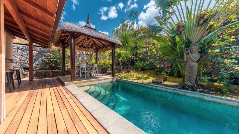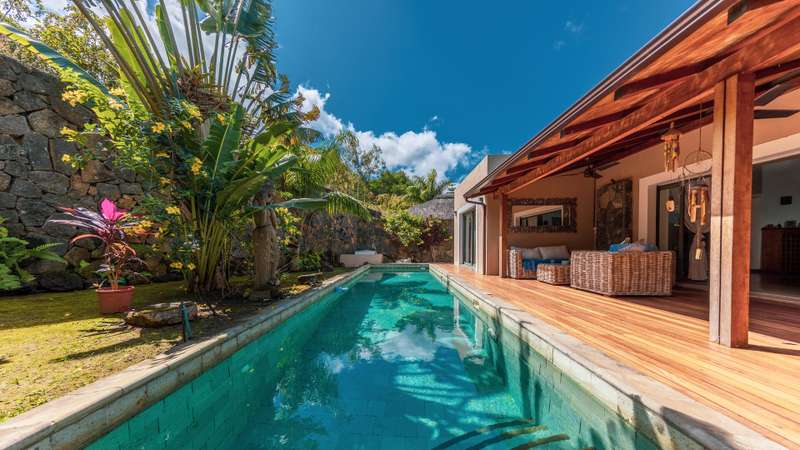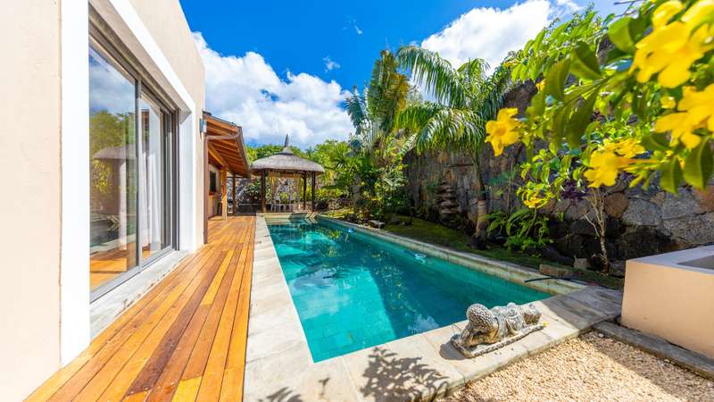 This Bali-inspired villa is located in a secure RES development in Black River, offering an elegant blend of tropical design and modern comfort. With its warm wooden interior features, the property exudes character and charm while providing all the conveniences of contemporary living. The villa includes 3 spacious bedrooms and 3 bathrooms, ensuring privacy and comfort for all. The living space extends seamlessly to a covered terrace, perfect for relaxing outdoors in any season. Beyond, the long swimming pool is bordered by a landscaped garden and a kiosk, creating an inviting atmosphere for both quiet moments and entertaining. Additional features include a closed garage and storage space, adding practicality to the lifestyle on offer. Its location is another highlight—close to the Black River Gorges National Park, yet only minutes from the coast, shops, and restaurants. This villa is a rare opportunity to enjoy the tranquility of nature while benefiting from the advantages of an RES scheme in one of Mauritius’ most desirable areas.