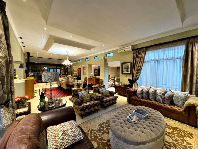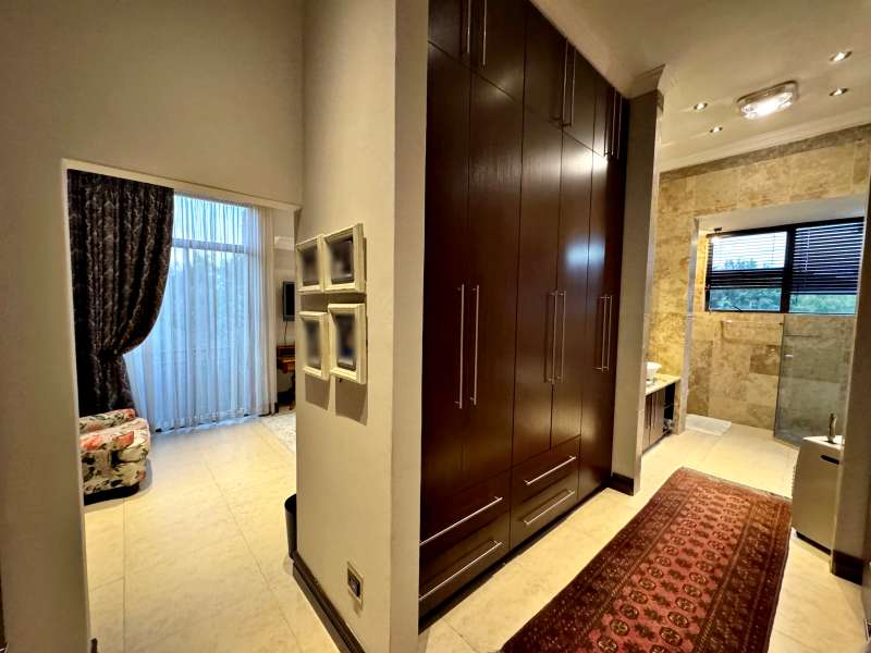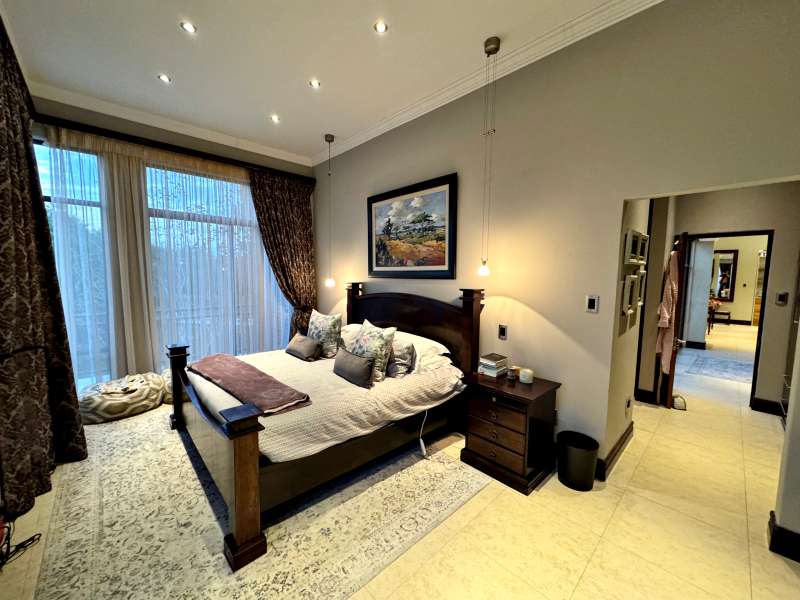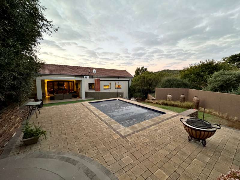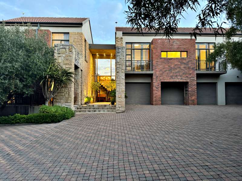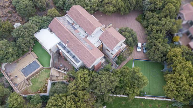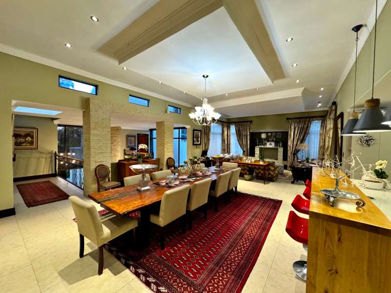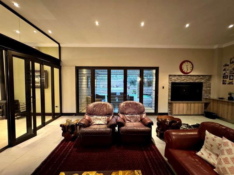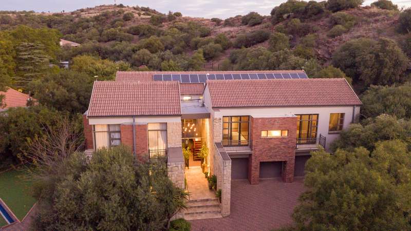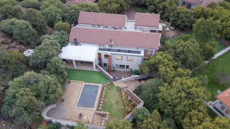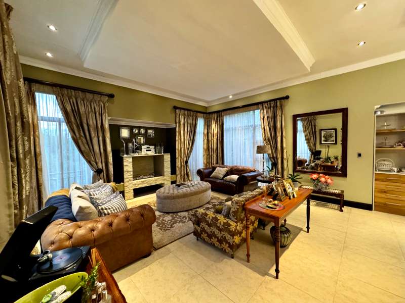 Welcome to an exquisite luxury residence nestled within a secure and prestigious estate, offering the epitome of elegance and modern convenience. Step into a grand foyer that sets the tone for this magnificent home, featuring a cosy lounge area and a convenient kitchenette. A spacious guest bedroom with an en-suite bathroom is ideal for visitors or extended family. Ascend to the upper level where you'll find a luxurious formal lounge designed for comfort and style. The open-plan dining and kitchen area is perfect for entertaining guests and the kitchen is fully equipped with modern amenities, including a separate scullery and laundry room. The separate braai room, equipped with a built-in braai and a cosy fireplace, seamlessly connects to the outdoor patio through stack-up doors. The patio, with its louvre roof and built-in braai, overlooks a pristine swimming pool with a Bauma and a lush green area, offering the best of indoor-outdoor living. In addition to the bedroom on the ground level, the property boasts four additional luxurious bedrooms, each a private retreat with its own en-suite bathroom. The dedicated study provides a quiet environment for work or study. Additional features include a kiddies astro court, three garages for ample parking and storage, comfortable domestic quarters and environmentally friendly solar panels enhancing the home's sustainability. This property perfectly blends luxury, comfort and modern amenities, ensuring a lifestyle of unparalleled sophistication in a secure and serene environment.