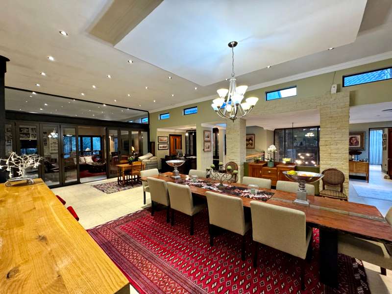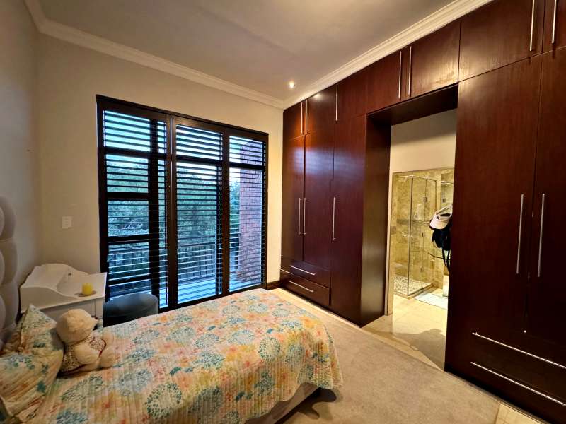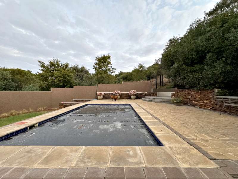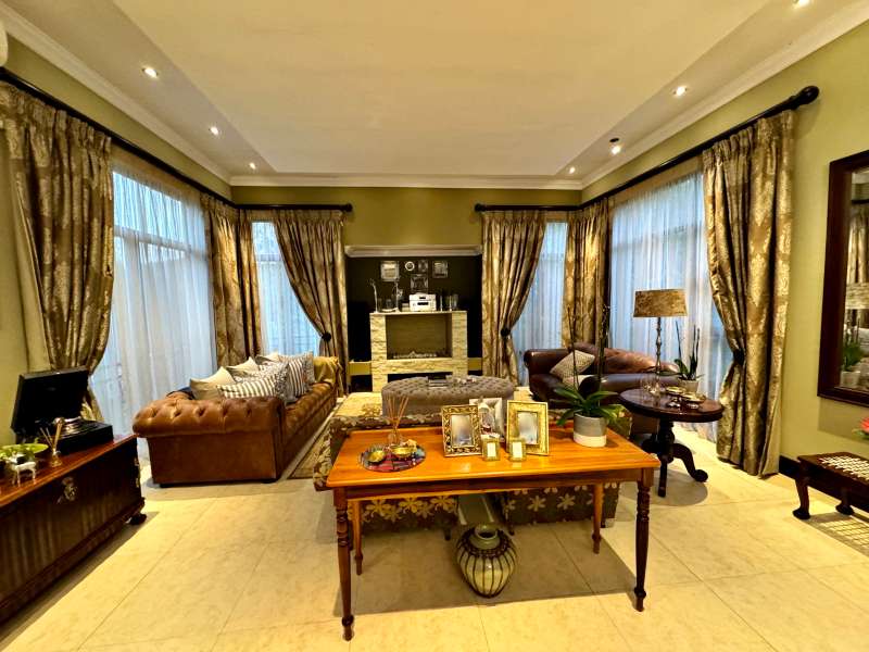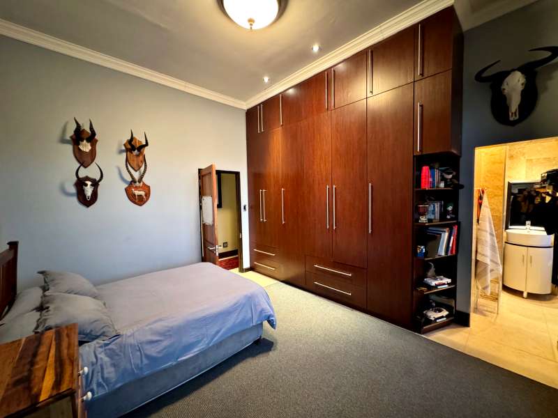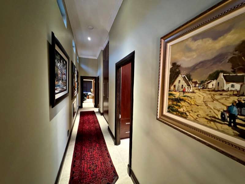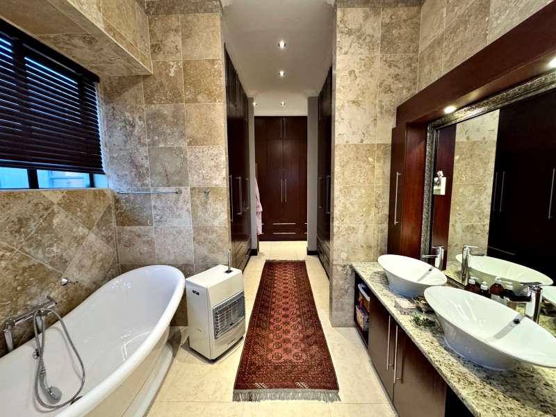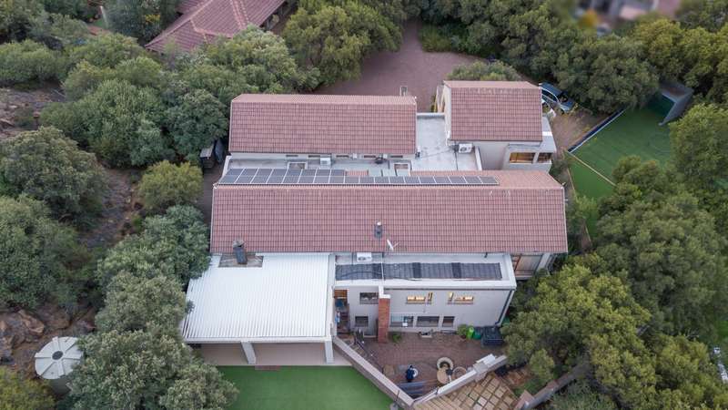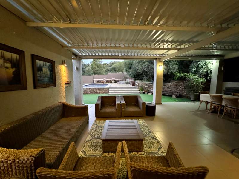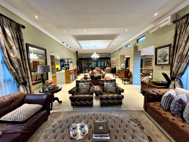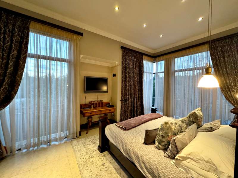 Welcome to an exquisite luxury residence nestled within a secure and prestigious estate, offering the epitome of elegance and modern convenience. Step into a grand foyer that sets the tone for this magnificent home, featuring a cosy lounge area and a convenient kitchenette. A spacious guest bedroom with an en-suite bathroom is ideal for visitors or extended family. Ascend to the upper level where you'll find a luxurious formal lounge designed for comfort and style. The open-plan dining and kitchen area is perfect for entertaining guests and the kitchen is fully equipped with modern amenities, including a separate scullery and laundry room. The separate braai room, equipped with a built-in braai and a cosy fireplace, seamlessly connects to the outdoor patio through stack-up doors. The patio, with its louvre roof and built-in braai, overlooks a pristine swimming pool with a Bauma and a lush green area, offering the best of indoor-outdoor living. In addition to the bedroom on the ground level, the property boasts four additional luxurious bedrooms, each a private retreat with its own en-suite bathroom. The dedicated study provides a quiet environment for work or study. Additional features include a kiddies astro court, three garages for ample parking and storage, comfortable domestic quarters and environmentally friendly solar panels enhancing the home's sustainability. This property perfectly blends luxury, comfort and modern amenities, ensuring a lifestyle of unparalleled sophistication in a secure and serene environment.