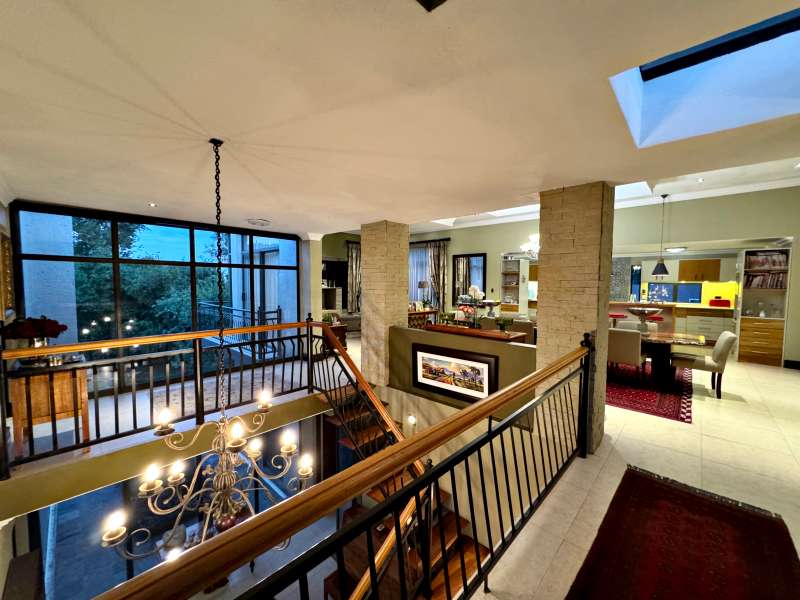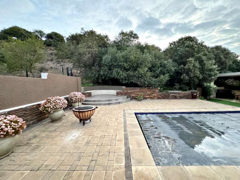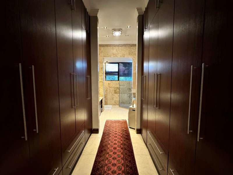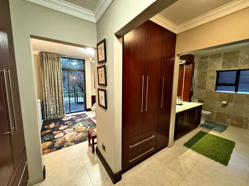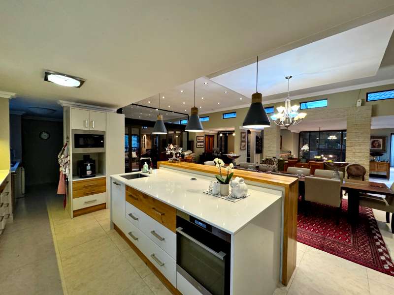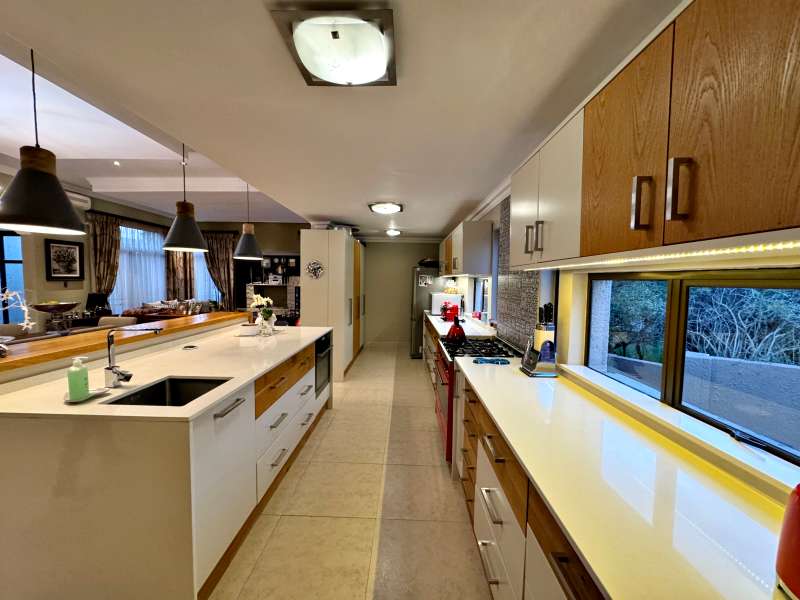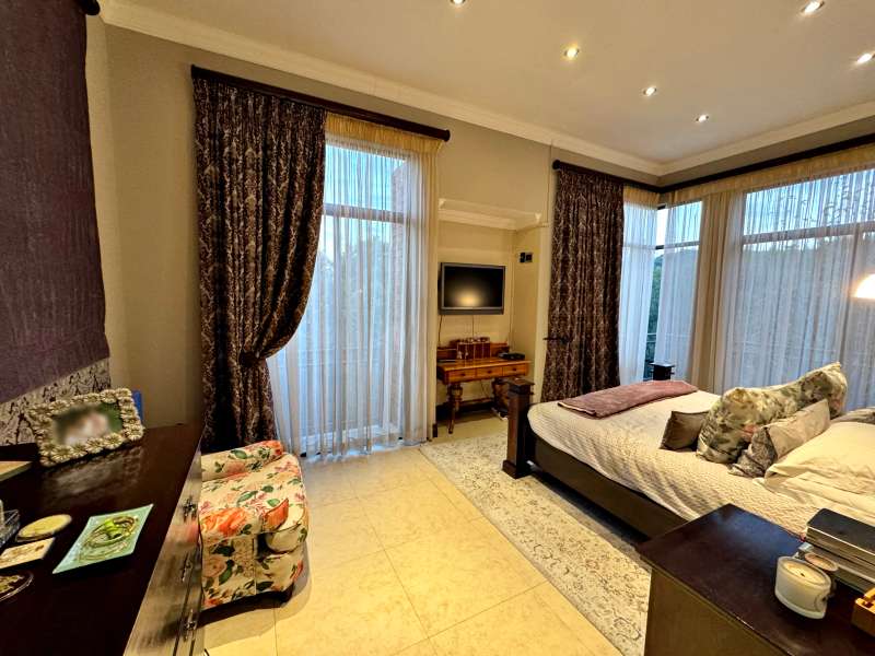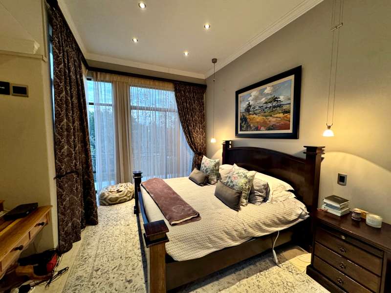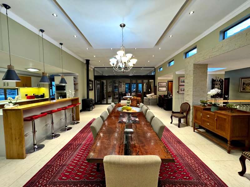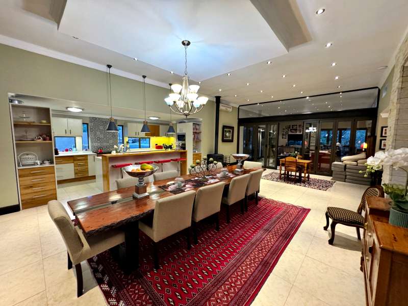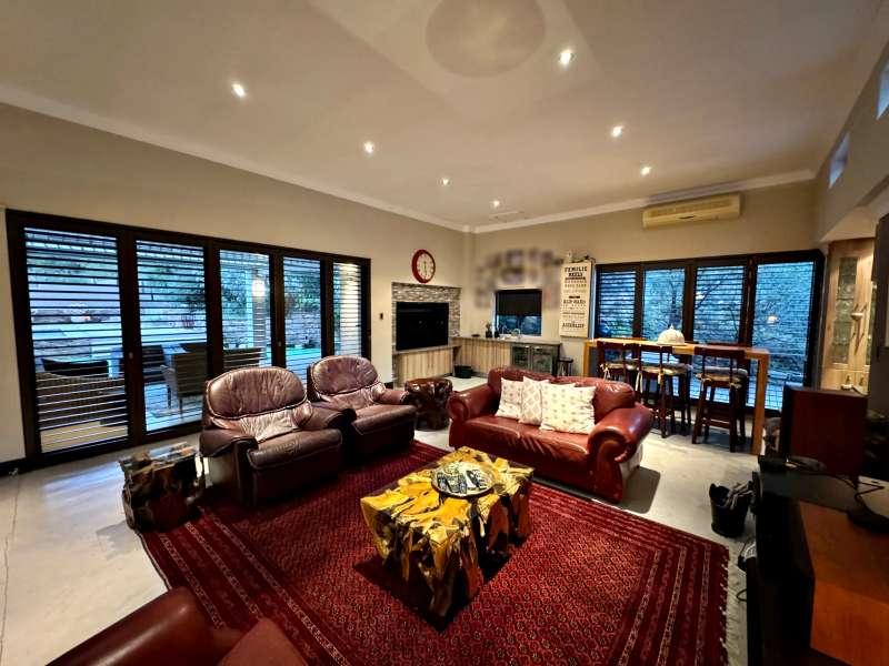 Welcome to an exquisite luxury residence nestled within a secure and prestigious estate, offering the epitome of elegance and modern convenience. Step into a grand foyer that sets the tone for this magnificent home, featuring a cosy lounge area and a convenient kitchenette. A spacious guest bedroom with an en-suite bathroom is ideal for visitors or extended family. Ascend to the upper level where you'll find a luxurious formal lounge designed for comfort and style. The open-plan dining and kitchen area is perfect for entertaining guests and the kitchen is fully equipped with modern amenities, including a separate scullery and laundry room. The separate braai room, equipped with a built-in braai and a cosy fireplace, seamlessly connects to the outdoor patio through stack-up doors. The patio, with its louvre roof and built-in braai, overlooks a pristine swimming pool with a Bauma and a lush green area, offering the best of indoor-outdoor living. In addition to the bedroom on the ground level, the property boasts four additional luxurious bedrooms, each a private retreat with its own en-suite bathroom. The dedicated study provides a quiet environment for work or study. Additional features include a kiddies astro court, three garages for ample parking and storage, comfortable domestic quarters and environmentally friendly solar panels enhancing the home's sustainability. This property perfectly blends luxury, comfort and modern amenities, ensuring a lifestyle of unparalleled sophistication in a secure and serene environment.