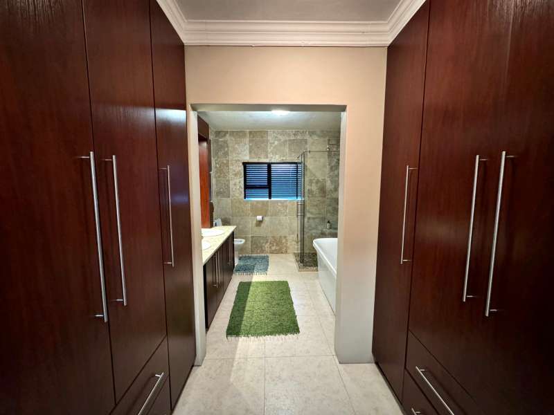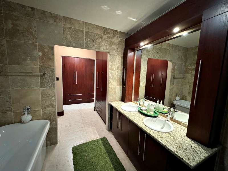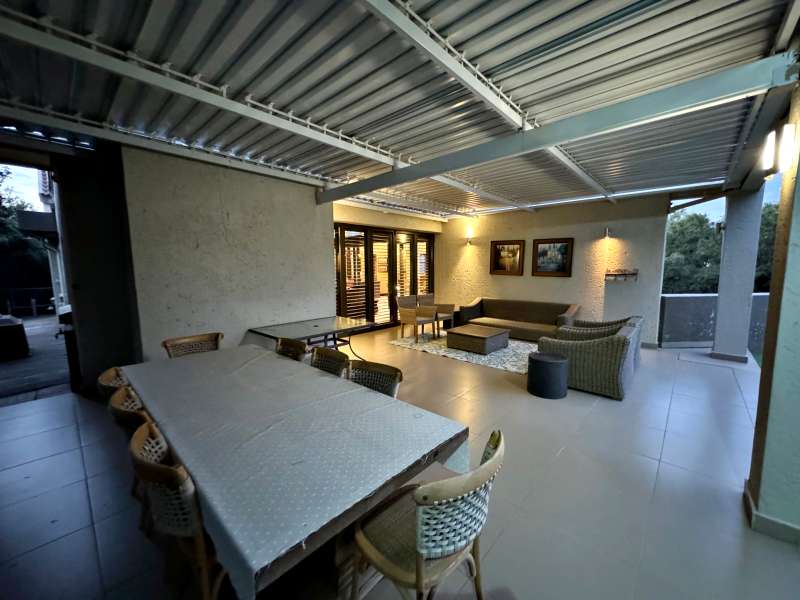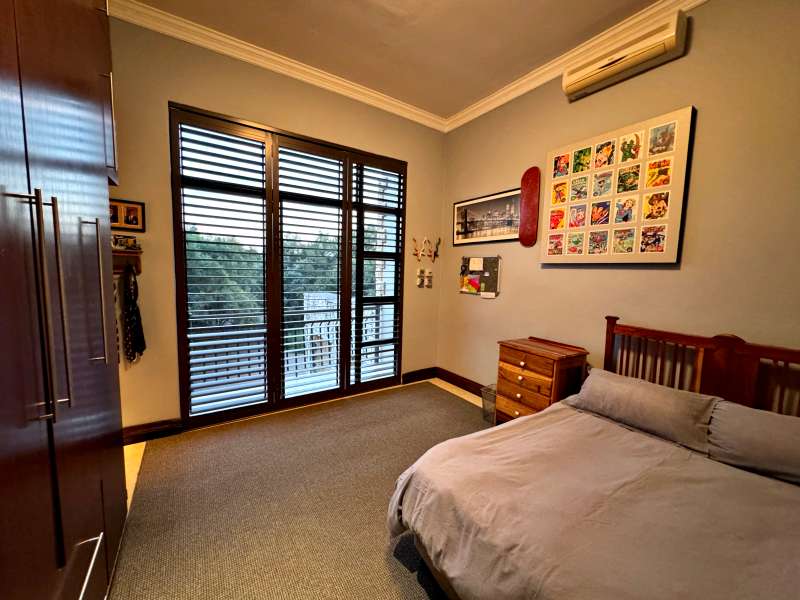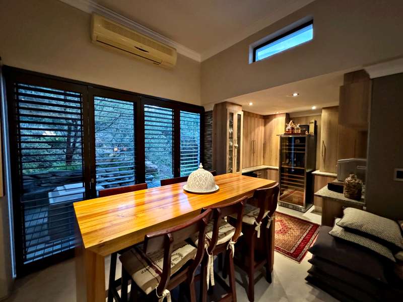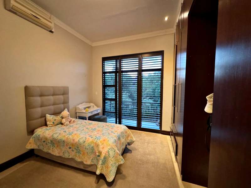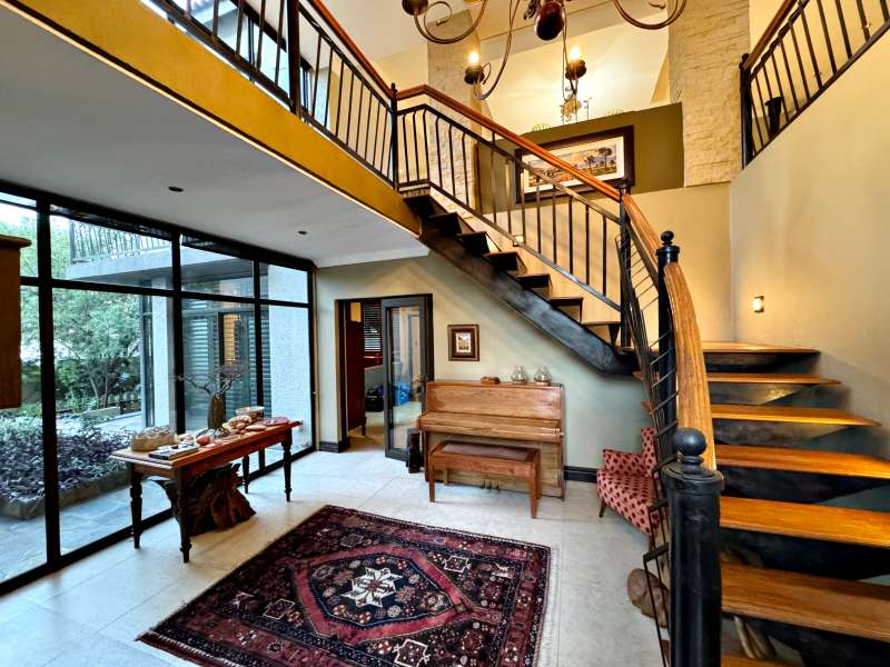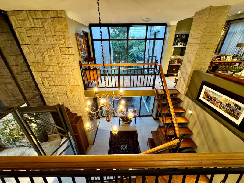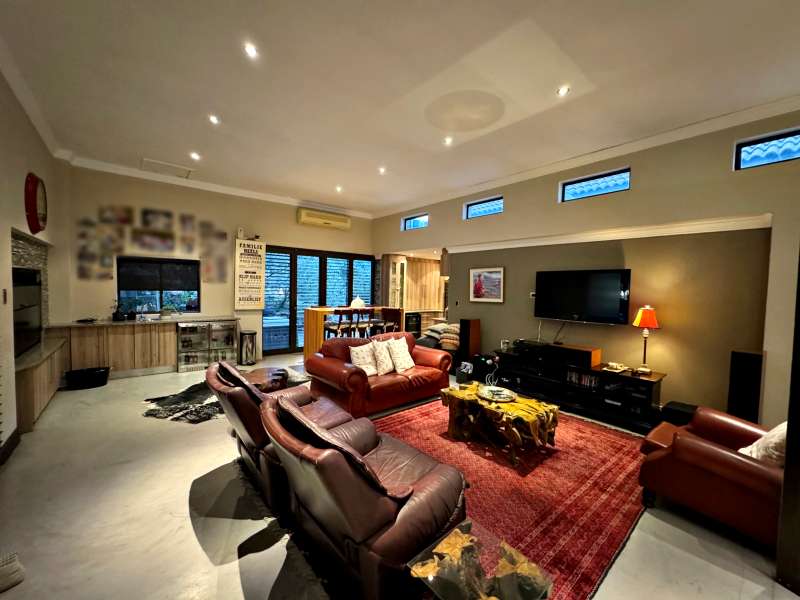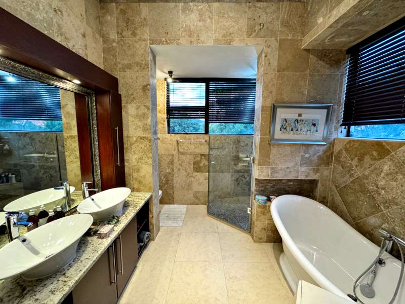 Welcome to an exquisite luxury residence nestled within a secure and prestigious estate, offering the epitome of elegance and modern convenience. Step into a grand foyer that sets the tone for this magnificent home, featuring a cosy lounge area and a convenient kitchenette. A spacious guest bedroom with an en-suite bathroom is ideal for visitors or extended family. Ascend to the upper level where you'll find a luxurious formal lounge designed for comfort and style. The open-plan dining and kitchen area is perfect for entertaining guests and the kitchen is fully equipped with modern amenities, including a separate scullery and laundry room. The separate braai room, equipped with a built-in braai and a cosy fireplace, seamlessly connects to the outdoor patio through stack-up doors. The patio, with its louvre roof and built-in braai, overlooks a pristine swimming pool with a Bauma and a lush green area, offering the best of indoor-outdoor living. In addition to the bedroom on the ground level, the property boasts four additional luxurious bedrooms, each a private retreat with its own en-suite bathroom. The dedicated study provides a quiet environment for work or study. Additional features include a kiddies astro court, three garages for ample parking and storage, comfortable domestic quarters and environmentally friendly solar panels enhancing the home's sustainability. This property perfectly blends luxury, comfort and modern amenities, ensuring a lifestyle of unparalleled sophistication in a secure and serene environment.