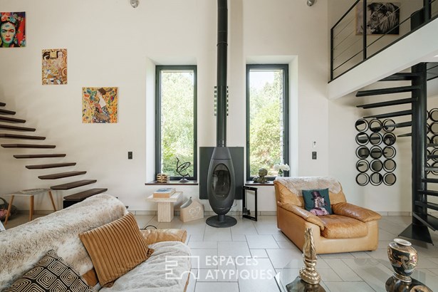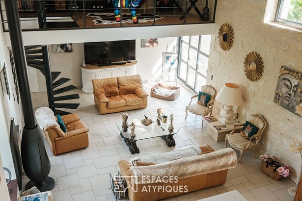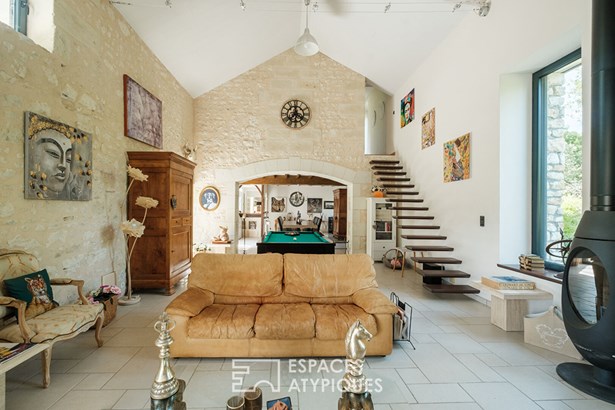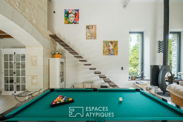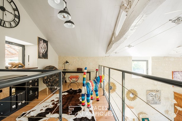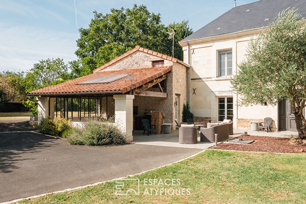 Close to the Loire Valley, it seduces with its peaceful, private setting, the quality of its interior fittings, and the charm of its outbuildings. Upon entering, the eye is drawn to a vast living room, enhanced by a cathedral-like height and a wood-burning stove, inviting conviviality. A mezzanine overlooks this living space, adding a touch of originality.