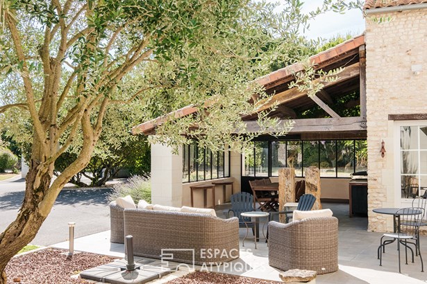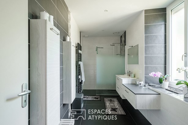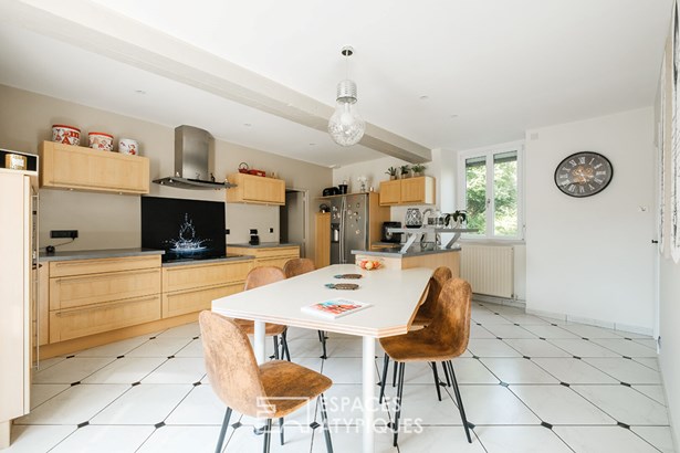 The equipped kitchen, open to the outdoors, naturally connects to a terrace and a summer kitchen, facilitating shared moments in all seasons. In addition, a multipurpose room and an office that can be used as a bedroom offer flexible spaces. Upstairs, three bedrooms, one with a dressing room, ensure optimal comfort.