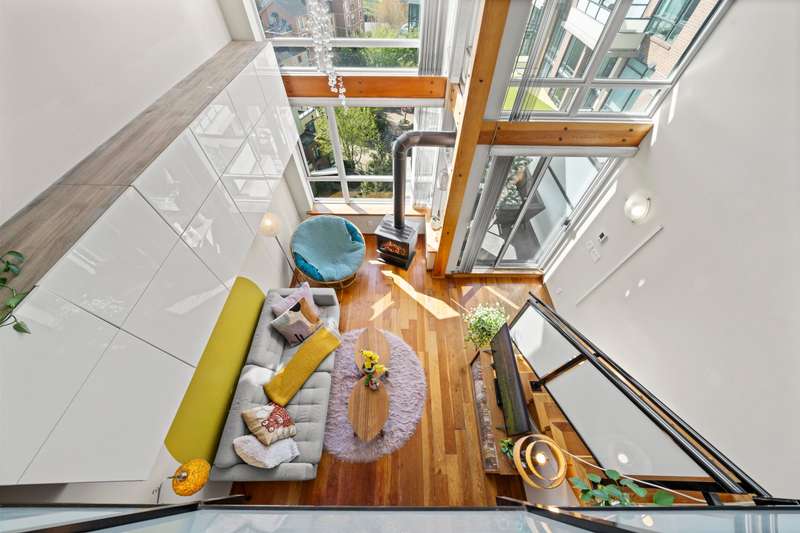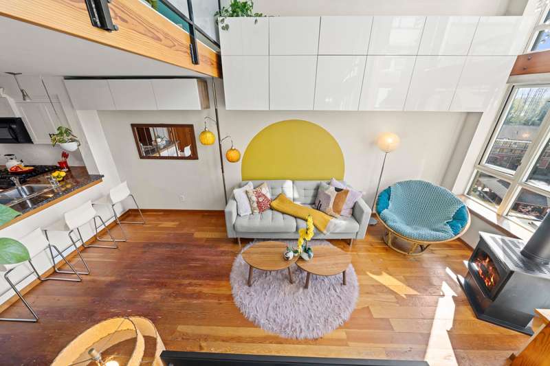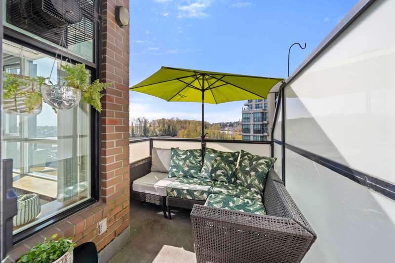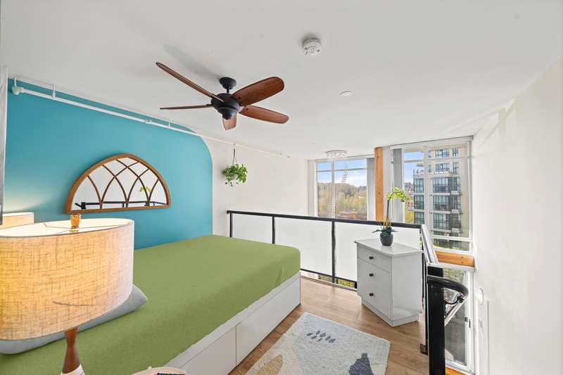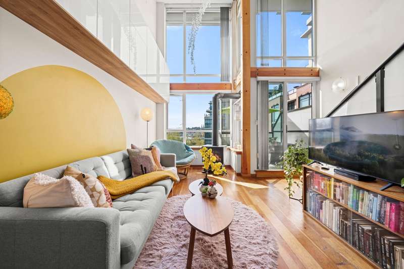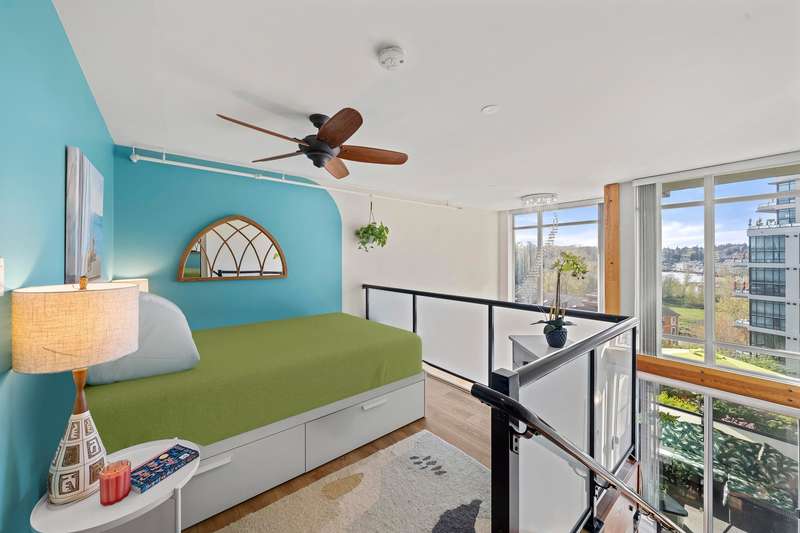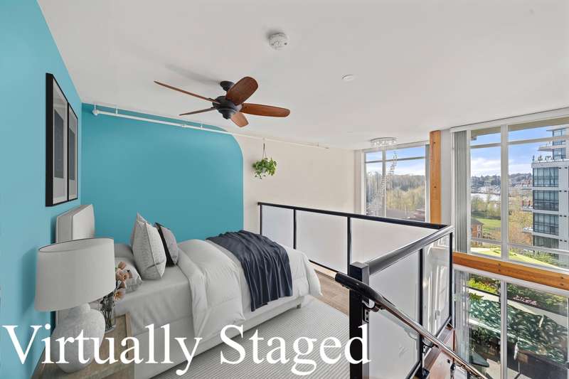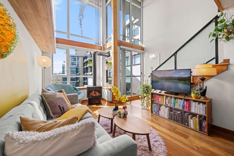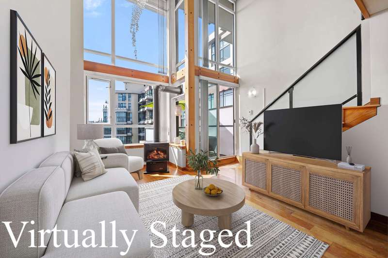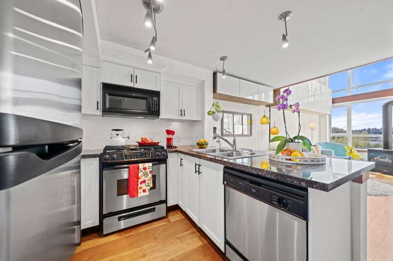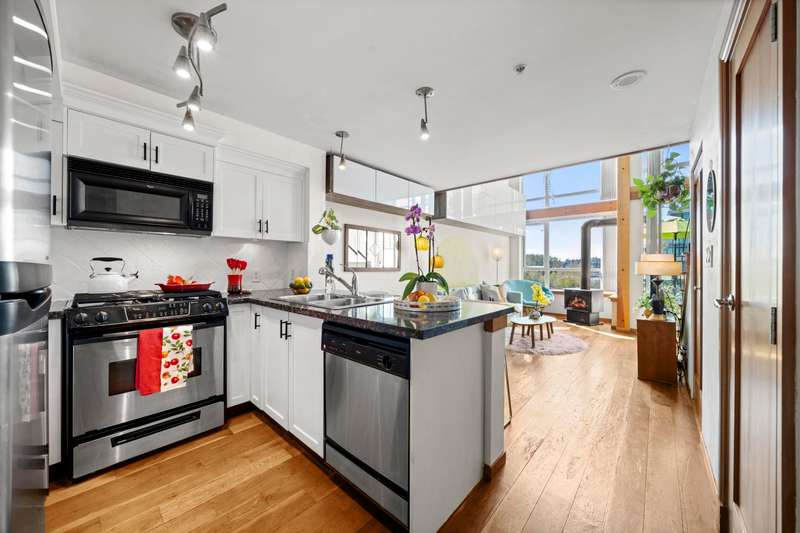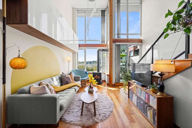 Welcome to the Murano Lofts – where urban elegance meets serene waterfront living! Perched on the 5th floor of a solid concrete building, this quiet & spacious west-facing loft offers stunning sunsets & year-round water views. Thoughtfully designed living space, open-concept home w/soaring 16.5' floor-to-ceiling windows, filling the home with natural light. A stylish blend of Fir & updated laminate flooring, a chef-inspired kitchen w/ granite countertops, gas range, bar seating, & refreshed shaker cabinets. The inviting living area boasts a cozy gas fireplace, perfect for relaxing or entertaining. Enjoy the convenience of a guest powder room, in-suite storage, in-suite washer/dryer and a private balcony to soak in the view. Perfect for couples, professionals, downsizers, or investors!