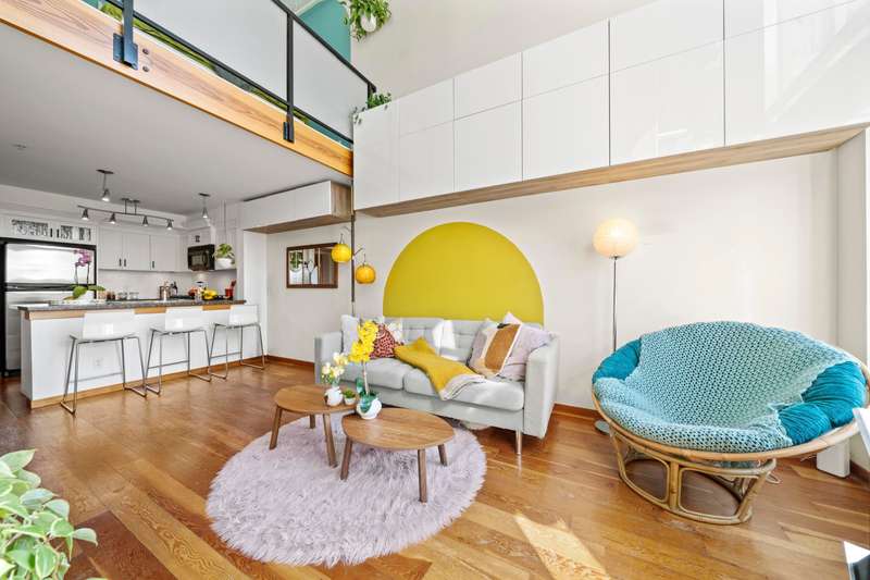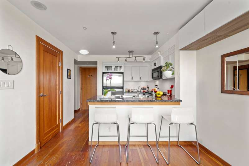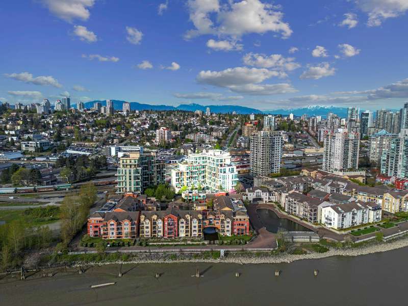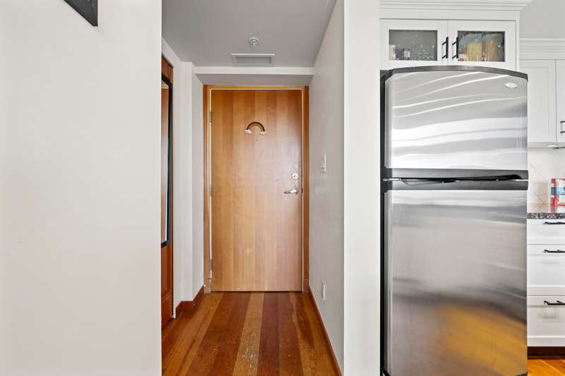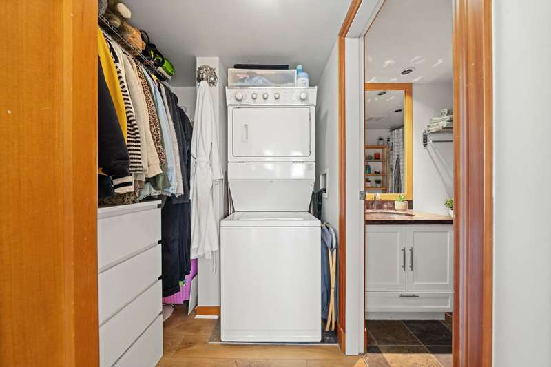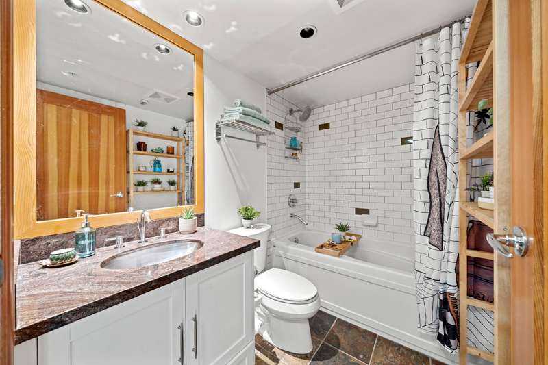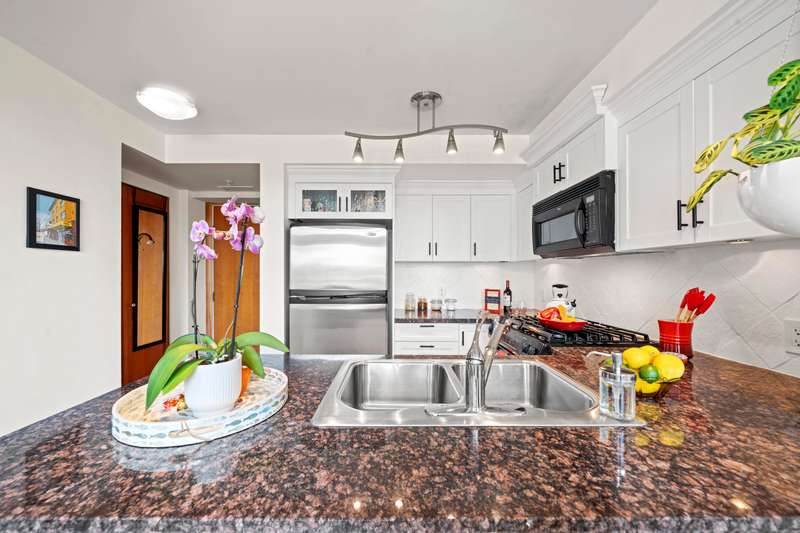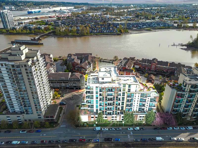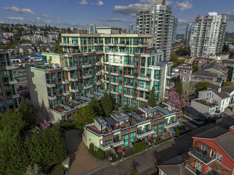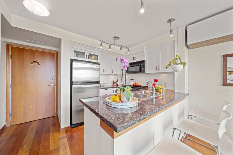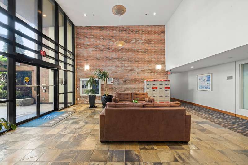 Welcome to the Murano Lofts – where urban elegance meets serene waterfront living! Perched on the 5th floor of a solid concrete building, this quiet & spacious west-facing loft offers stunning sunsets & year-round water views. Thoughtfully designed living space, open-concept home w/soaring 16.5' floor-to-ceiling windows, filling the home with natural light. A stylish blend of Fir & updated laminate flooring, a chef-inspired kitchen w/ granite countertops, gas range, bar seating, & refreshed shaker cabinets. The inviting living area boasts a cozy gas fireplace, perfect for relaxing or entertaining. Enjoy the convenience of a guest powder room, in-suite storage, in-suite washer/dryer and a private balcony to soak in the view. Perfect for couples, professionals, downsizers, or investors!