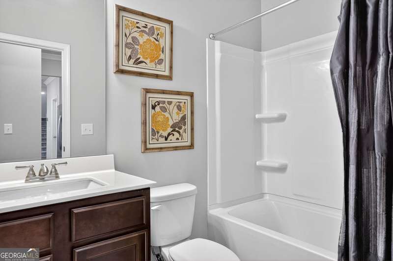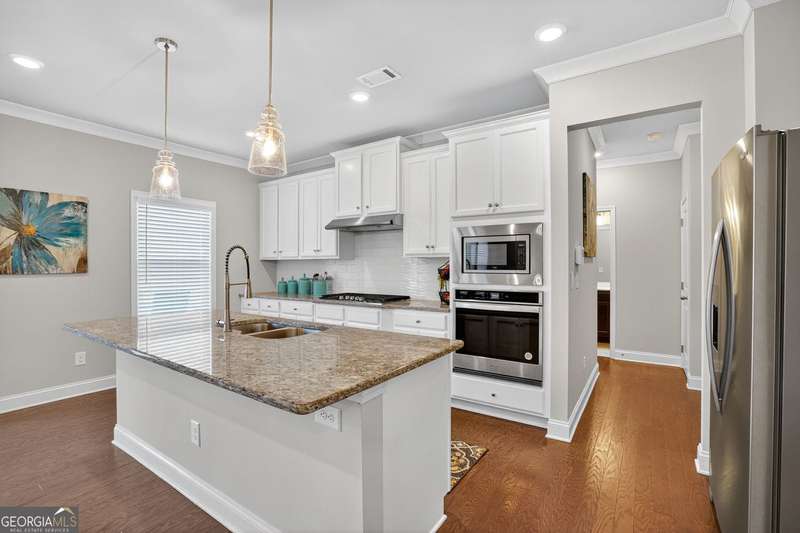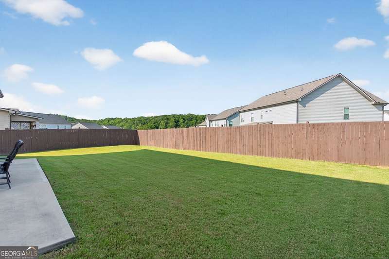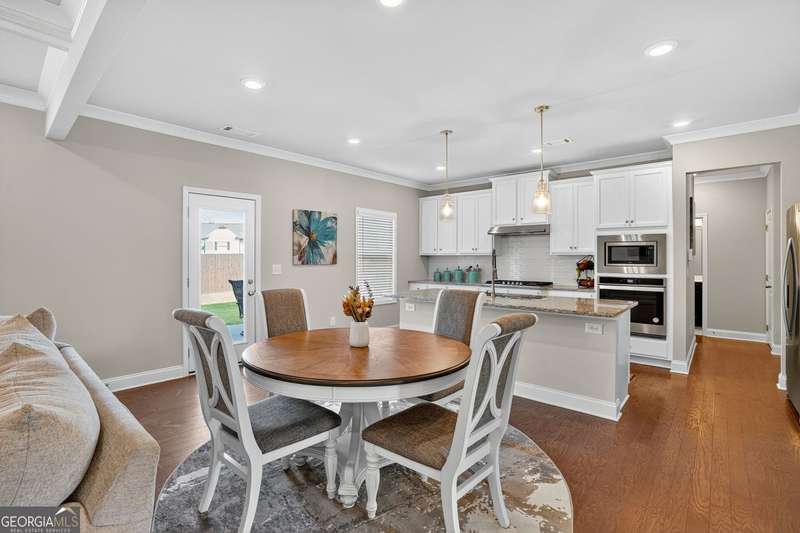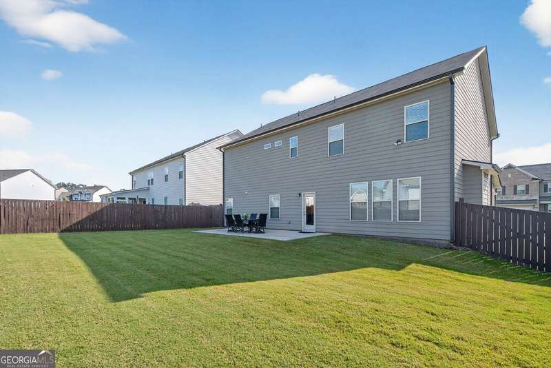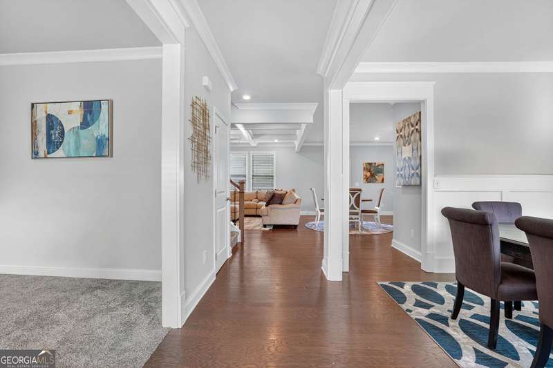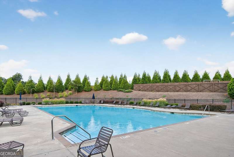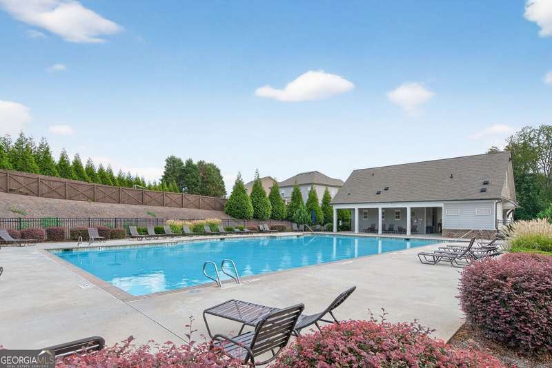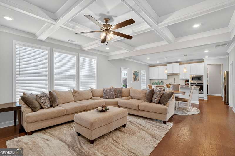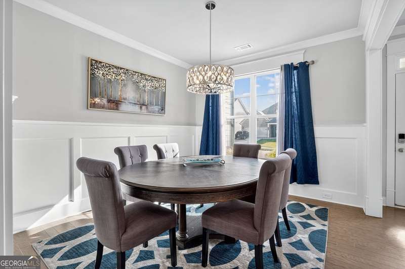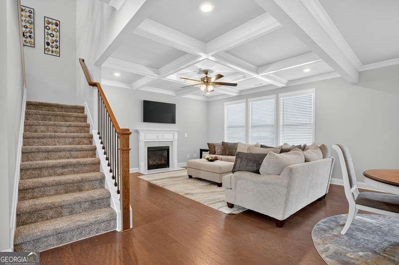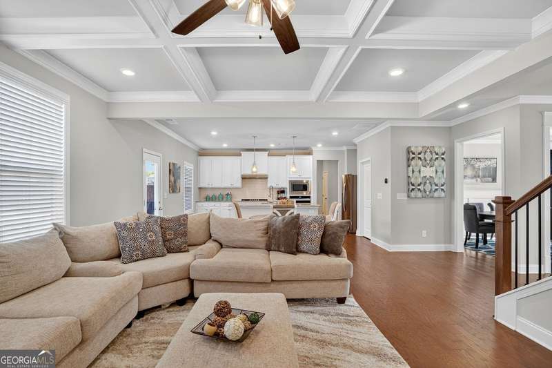 This gorgeous move in ready and like new home for sale in Flowery Branch welcomes you with warmth and character! Facing East, you'll enjoy the abundance of natural light flowing through this impeccable home. Step inside to an elegant entrance foyer with a formal living and dining room adjacent. The versatile living room is highlighted by a custom accent wall with detailed millwork and designer paint, making it a perfect space for a home office or study. A glamorous formal dining room with wainscotting is ready for your next dinner party. Hardwood floors flow effortlessly from the foyer into the kitchen and family room, where classic coffered ceilings and a warm fireplace set a welcoming tone. The family room opens to a chef's kitchen, featuring a large center island with granite countertops and chic white cabinets that complement the elegant millwork throughout. A guest bedroom and a full bath complete the convenient main level. Step outside to the oversized patio and a well-manicured, level, fenced backyard; an ideal spot for enjoying a cup of tea in the morning or watching the sunset in the evening. Upstairs, a spacious open loft provides the perfect space for a media room, workspace, or play area. Retreat to the very comfortable master suite, which boasts elegant trey ceilings and a luxurious spa-like bath with an oversized shower and built-in shelving. The roomy master closet offers plenty of space. Two additional bedrooms and a full bath complete the upper level. Located in Lancaster, a lively neighborhood with a community pool, this home offers easy access to shopping, dining, and I-985. You're also just minutes from popular area attractions, including the Mall of Georgia, Chateau Elan, and Lake Lanier Islands. Don't miss the chance to own this lovely home in a great location and neighborhood!