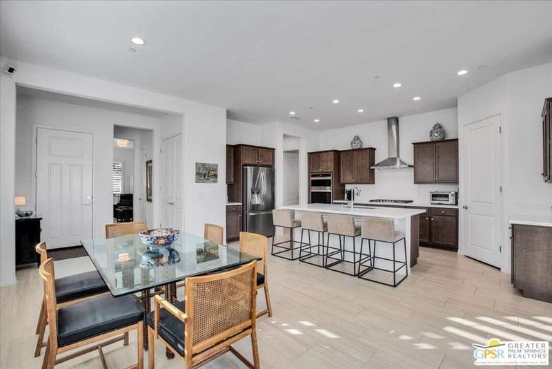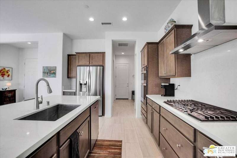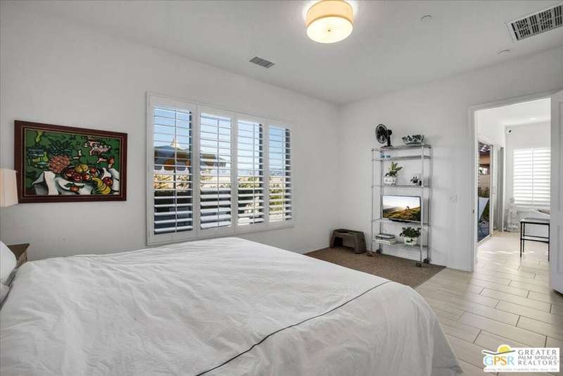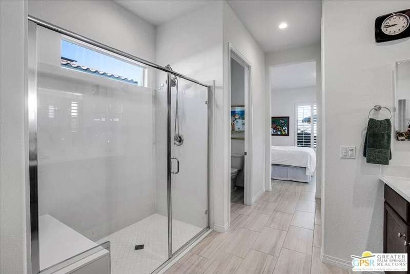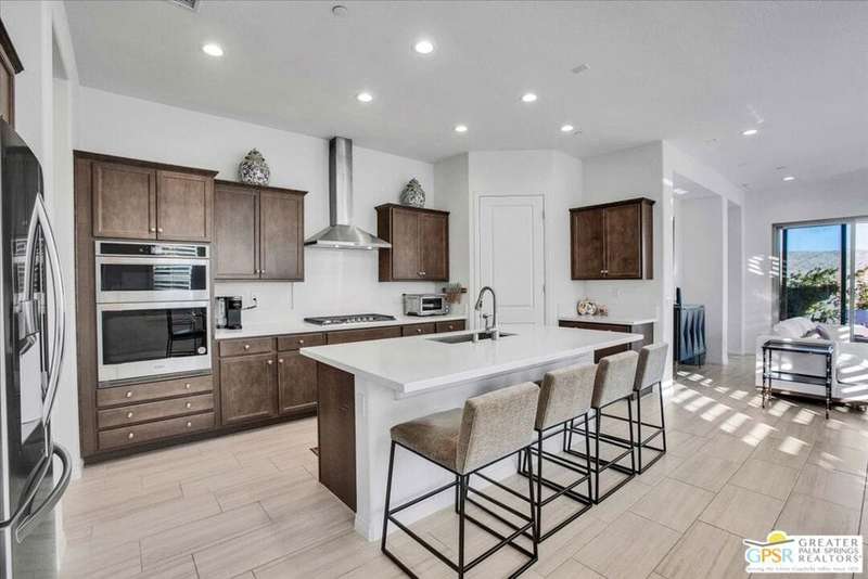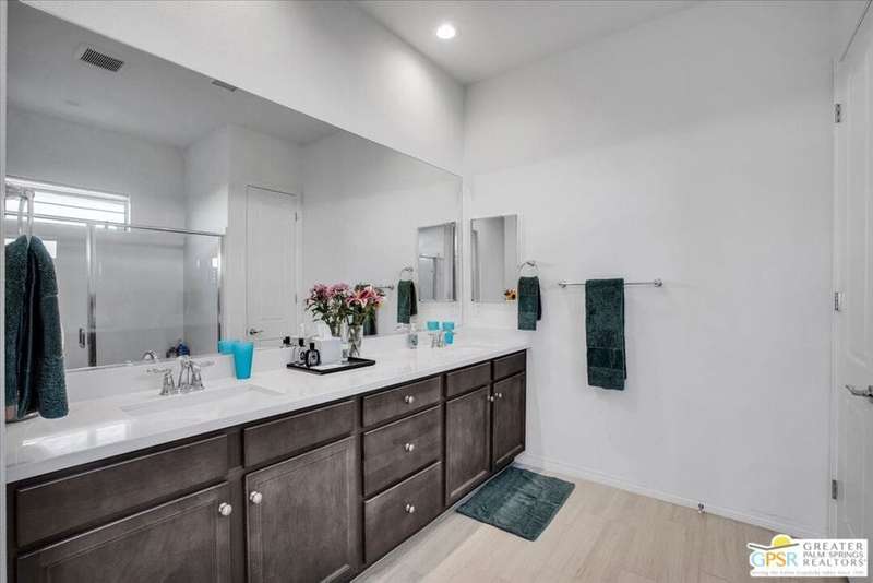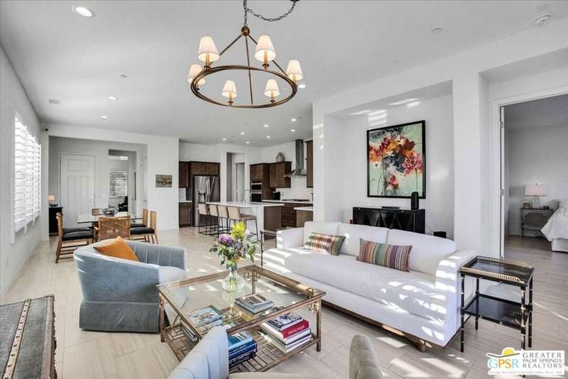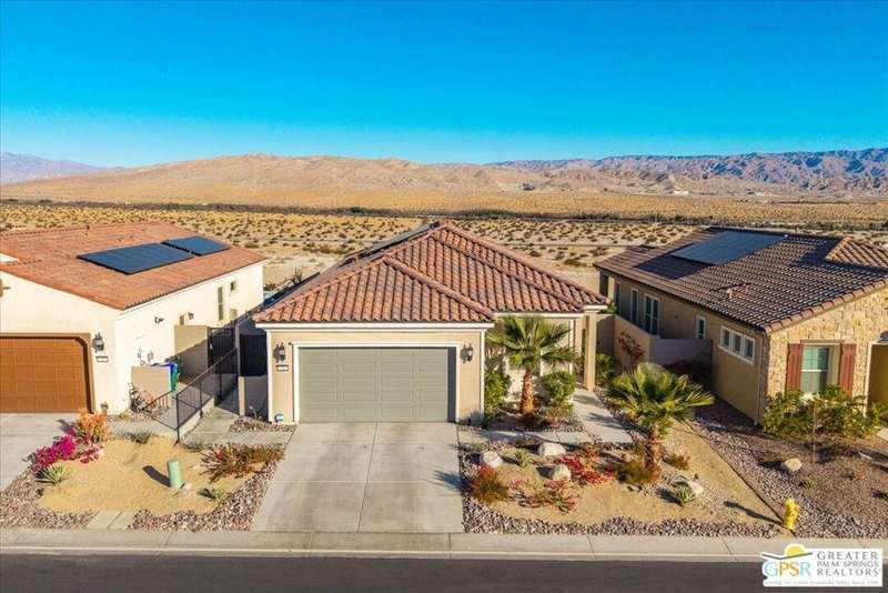 Welcome to luxury living at Del Webb Rancho Mirage's 55+ community. Nestled in phase 6, this upgraded Expedition Model Home offers a truly exceptional living experience. Step into this stunning one-level home built in 2023 and be greeted by 10-foot ceilings and panoramic mountain views. This spacious, 1770 square foot residence features two large bedrooms, two baths, and a den, providing ample space for living, relaxation and entertainment. The interior of the home was completely repainted in April of 2025. The primary bedroom boasts a large walk-in closet, dual vanities in the bath and a linen closet. The second bedroom also offers a walk-in closet, providing extra storage space. The private den offers the perfect office or reading room, located in the front of the home. With an open floor plan seamlessly connecting the kitchen, dining, and living areas, this home is perfect for hosting gatherings or enjoying quiet nights in. This home offers a spacious kitchen with ample cabinetry, a large center island and great storage with a walk-in pantry. The laundry room includes a sink for added convenience and additional shelving above. Custom finish upgrades were made during construction, including prewiring for LVR surround sound, custom tile floors throughout, wood shutters for privacy and sun protection, and owned Solar system! The backyard of this home is completely landscaped to be an entertainer's dream and low maintenance. It offers a covered patio and multiple seating areas. It's the perfect setting for hosting outdoor gatherings or simply relaxing in the sunshine. Living at Del Webb Rancho Mirage means access to an array of exceptional amenities. The 20,000 square-foot clubhouse offers a modern fitness center, aerobics studio, golf simulator, a wine room and an outdoor fireplace. The ballroom is perfect for special events and entertainment. Outdoor enthusiasts will appreciate the large pool and smaller covered pool, as well as the large spa for ultimate relaxation. Stay active with 8 Pickleball courts, 4 tennis courts, 3 bocce courts, a putting green, and six miles of walking trails. There are also dedicated dog areas for your furry friends. At Del Webb Rancho Mirage, residents can enjoy a well-organized and endless variety of activities and events tailored to their interests. It's the perfect place to create lasting memories and forge new friendships.