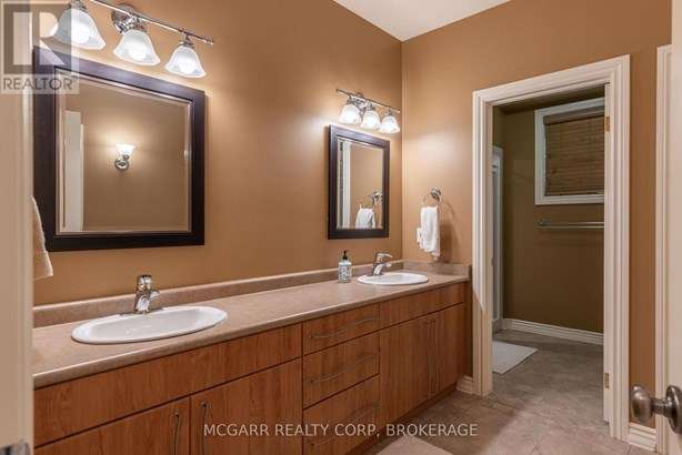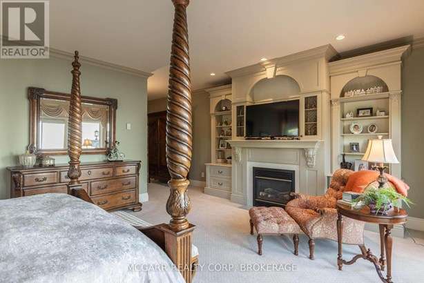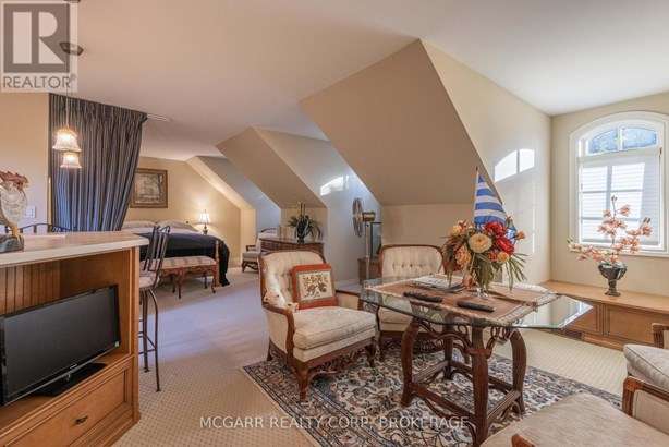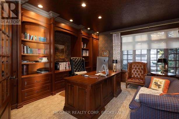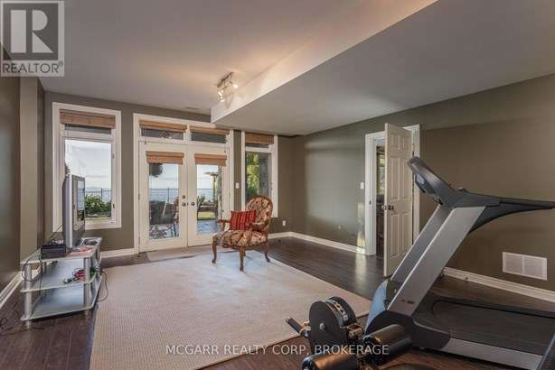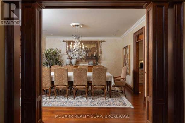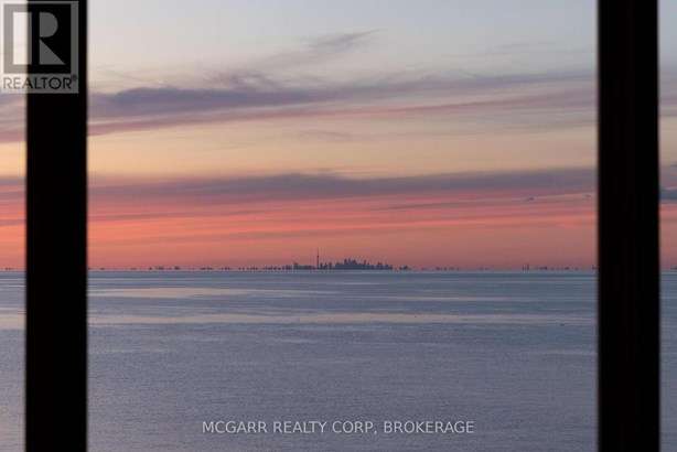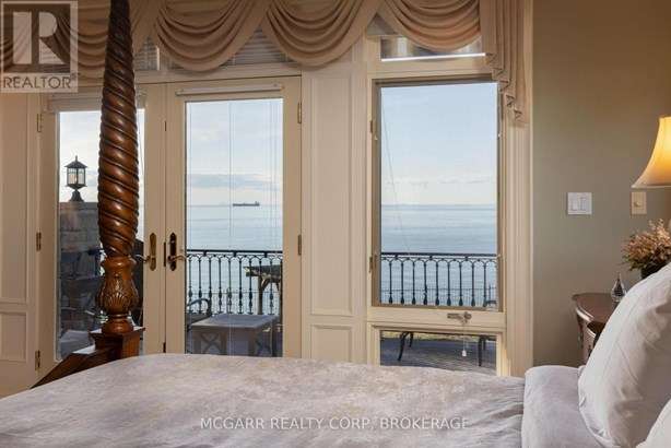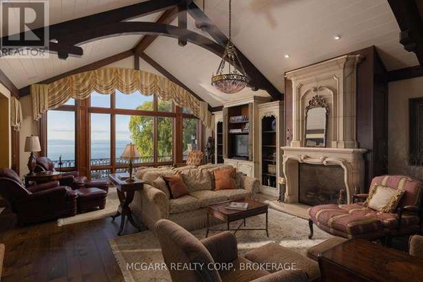 All bedrooms are above grade. Extraordinary, custom-built home on a quiet circle fronting onto Lake Ontario. A real oasis! Solidly built stone home with up to 5 bedrooms + over 5,000 sq. ft. but with the added advantage of a main floor primary suite allowing for all one floor living with the bonus for extended families. Spacious vaulted ceiling entry with porcelain floors & wide open views through to the lake. The grand elegant dining room is connected to the kitchen via a butler's pantry with appliances & sink. The custom Nucraft kitchen has heated porcelain floors, 8 ft x 3 ft 8 inch island, 2 sinks, 5 top of the line appliances & an open sitting area that has access to a large balcony All with stunning lake views. The European style great room has vaulted ceilings, Schaunberg engineered barnboard flooring & rich wood beamed arches. The den could be a bedroom. The primary suite has a real dressing room, large 5pc ensuite with steam shower & the bed/sitting area has a gas fireplace & walk-out to the lakefront balcony. Above the garage is a full contained in-law/nanny/teenage retreat. The lower level has a full walk-out all across the back & features a large family room & bar/kitchenette. Up to 3 bedrooms & a 4pc. The grounds are amazing with perennial gardens, open lakefront vistas, 18 x 36 in ground heated pool, 4pc bath, pool house with 3 appliances.