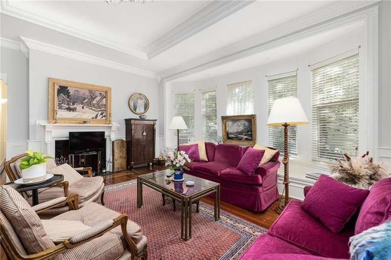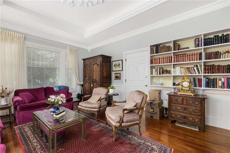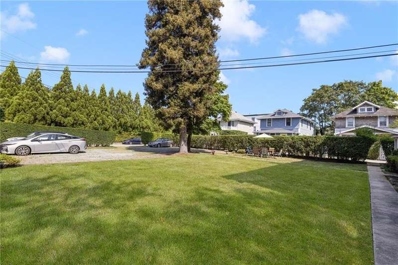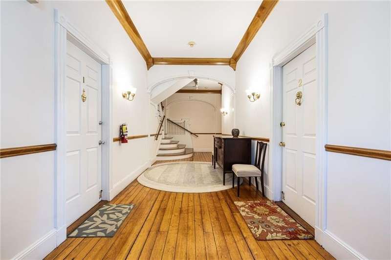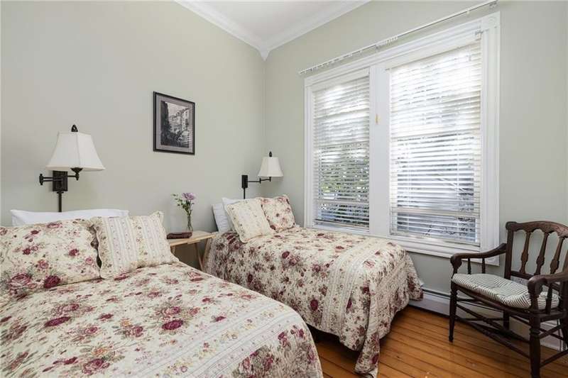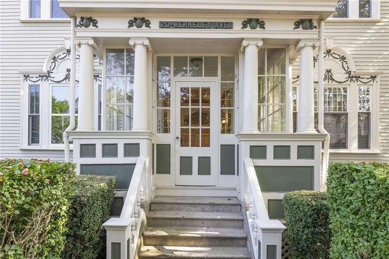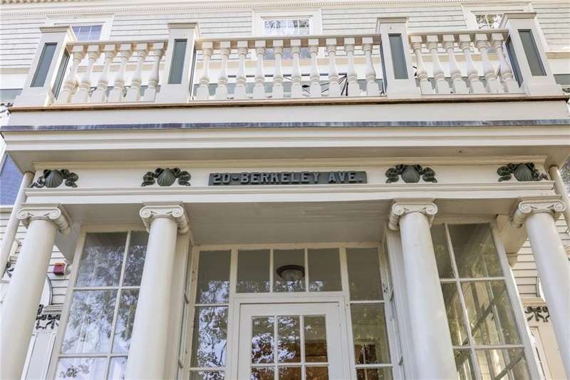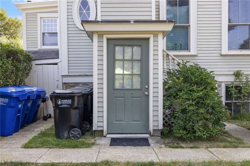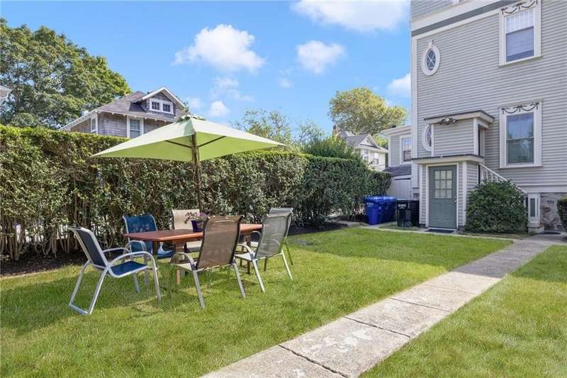 Dinsdale Cottage condominium with first level access is conveniently located within a short stroll to Bellevue Avenue, with markets, art museums, mansions, dining and more! This one level condo has two entrances, one is strictly for this unit! A beautiful communal garden area is the perfect spot to entertain in warmer months with an outdoor table, along with a parking area and assigned spot for this unit. Built in 1900, the grand entry leads into the living room with a 10 ft. tray ceiling and built in bookcase, window seat and brilliant light. The guest bedroom has a charming brick wall and cedar closet, with a full bath in the hall. The primary en suite has a large cedar closet and plenty of space for a desk or seating area! The kitchen is spacious and bright, with a generous dining area, two skylights, and its own private access. There is a stackable washer/dryer in the hallway. The lower level has locked storage space for each unit, and heat, hot water, and sewer are also included in the monthly fees. This one level, first floor unit with 2 BR and 2 full BA, along with its architectural details, is a rare find!