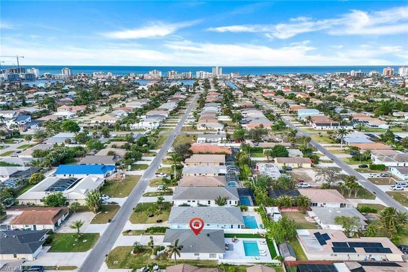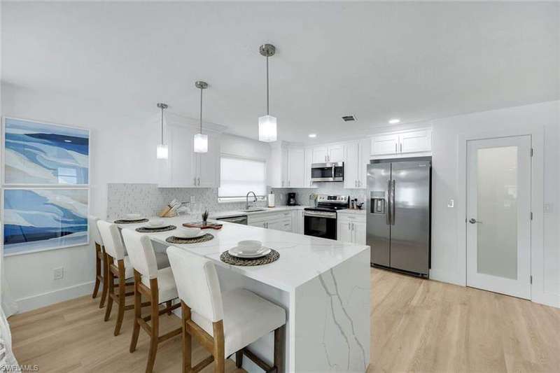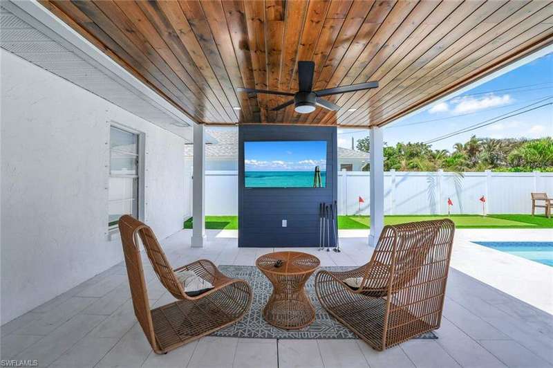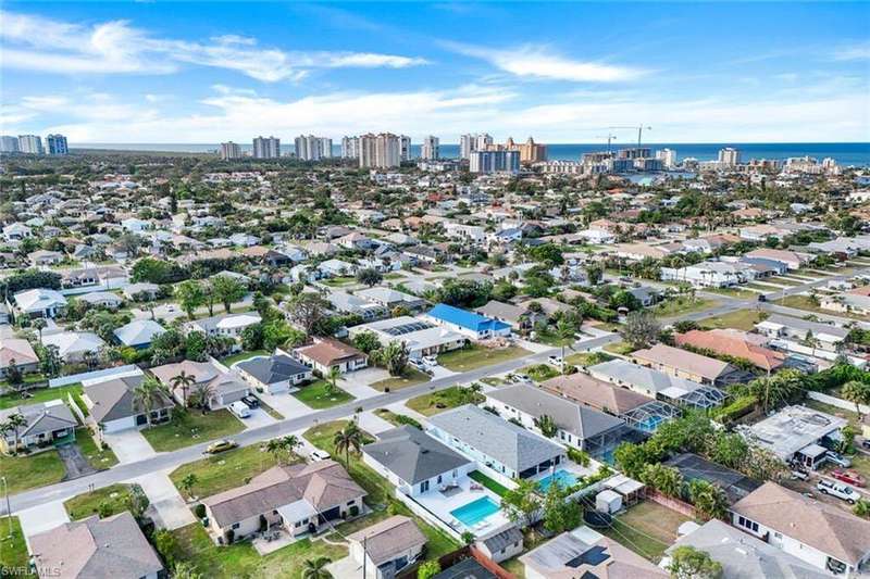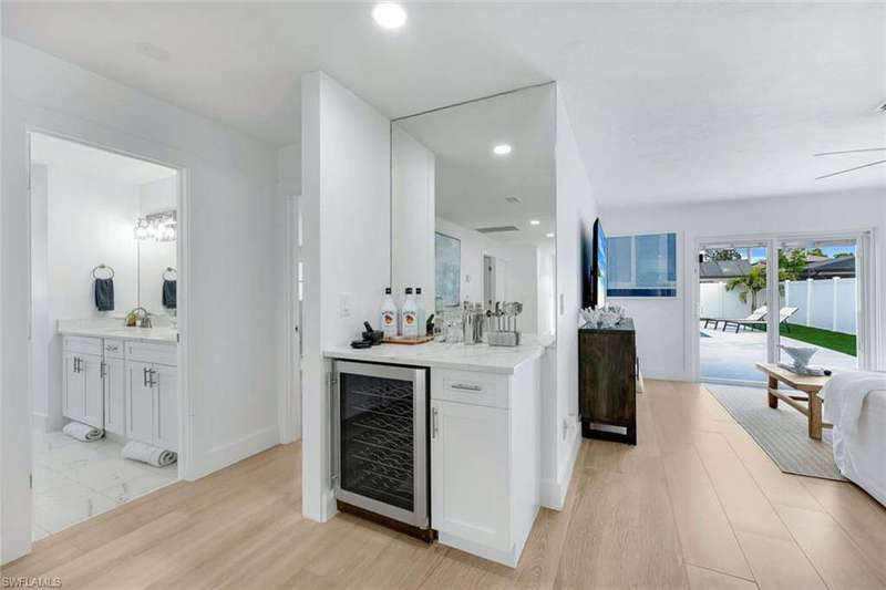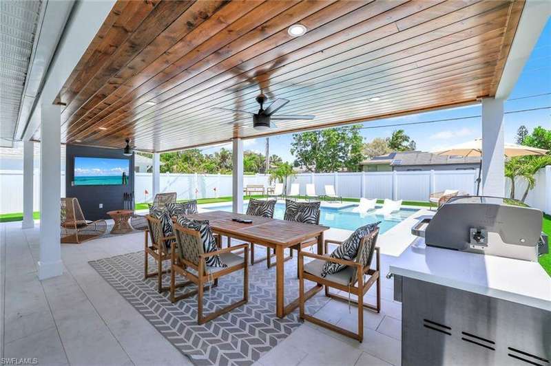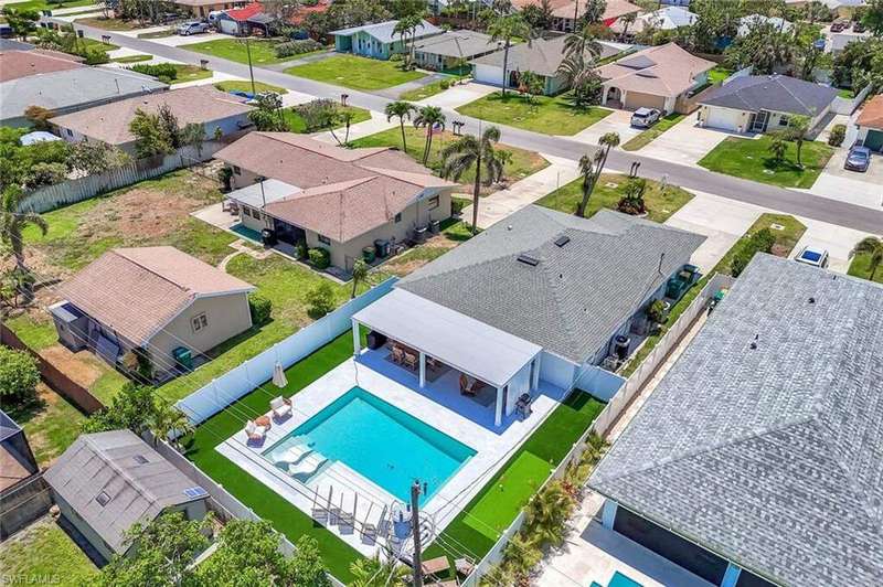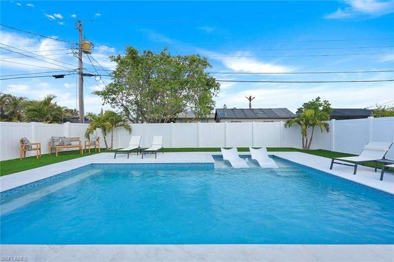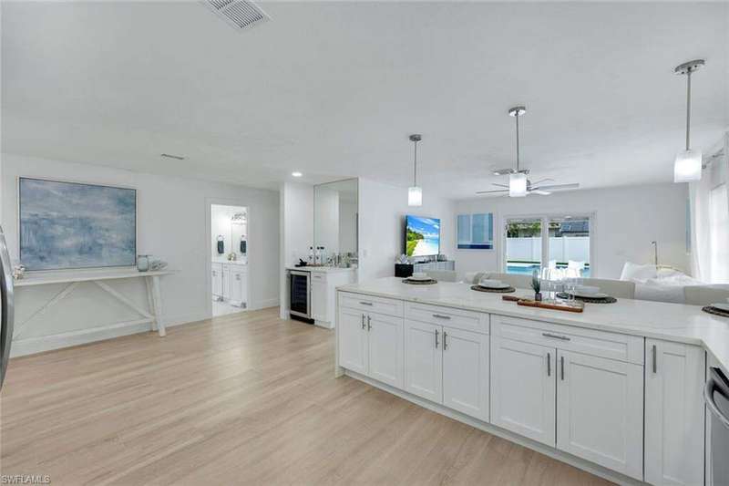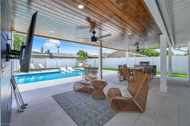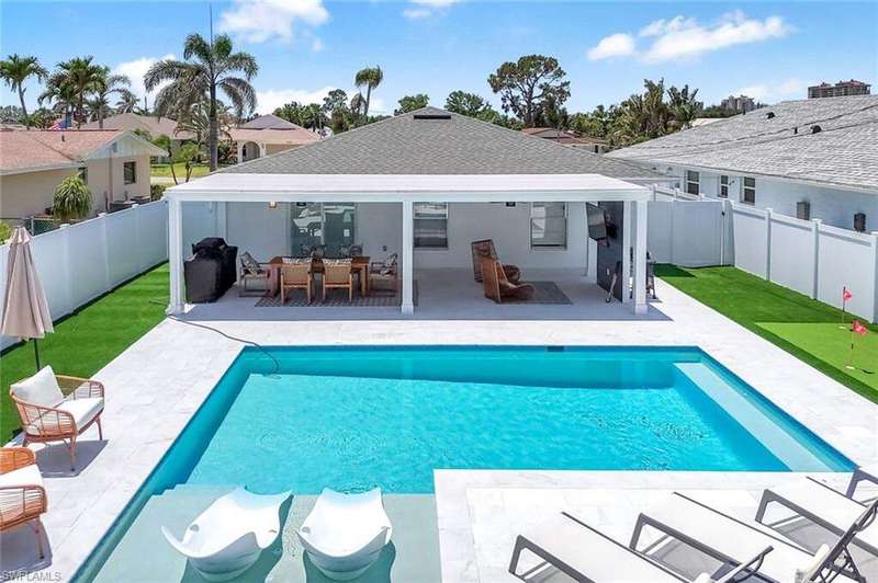 UPDATE----NEW OUTDOOR OVERHANG WITH KITCHEN IS NOW COMPLETED! Dream investment opportunity with proven rental history awaits with this fully remodeled 3-bedroom, 2-bathroom home in Naples Park and all the upgrades you've been searching for. Offered turnkey and fully furnished with brand-new furniture throughout, this residence is move-in or rent-out ready, delivering immediate returns for investors. Inside, the open-concept layout is designed for modern living and entertaining. The gourmet kitchen with upgraded countertops and hardware, an eat-in breakfast bar, and an adjacent bar with a wine cooler seamlessly blends with the living room. From there, the living space flows effortlessly through sliding doors to the resort-style backyard, making indoor-outdoor living a breeze. The resort-style backyard is a private oasis designed for relaxation and entertaining. It features a brand-new heated saltwater pool, new 12X30 overhang with outdoor kitchen, low-maintenance turf grass, and new vinyl fencing, creating the ultimate outdoor living space. Whether you envision lounging poolside or hosting gatherings, this backyard is ready to impress. Plans for a stylish overhang off in the rear of the home by the pool will add even more charm to this luxurious retreat. The upgrades continue with a new recreational space in the garage. This versatile area is perfect for a home gym, game room, or additional entertainment space, offering endless possibilities to customize the home to suit your lifestyle. Situated in the highly desirable X-500 flood zone, the property requires no flood insurance, offering peace of mind and cost savings. Located just over a mile from Vanderbilt Beach and Wiggins Pass and within walking distance of Mercato, where fine dining, luxury shopping, and vibrant nightlife await, the location is truly unbeatable. With no HOA or rental restrictions, this property offers unmatched flexibility for homeowners and investors alike. Whether you're seeking a lucrative rental property, a tranquil vacation retreat, or your forever home in paradise, this Naples Park gem has it all!
