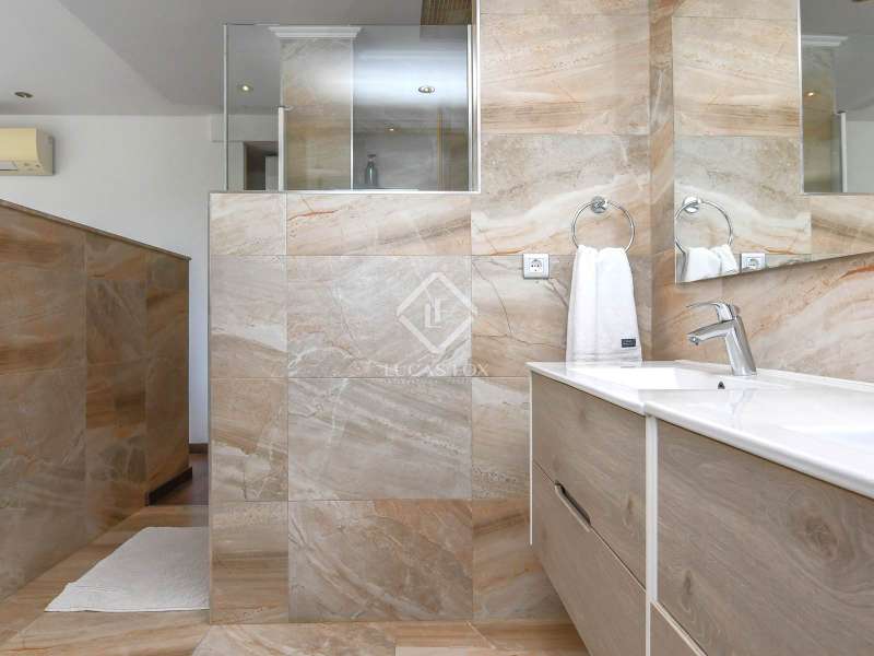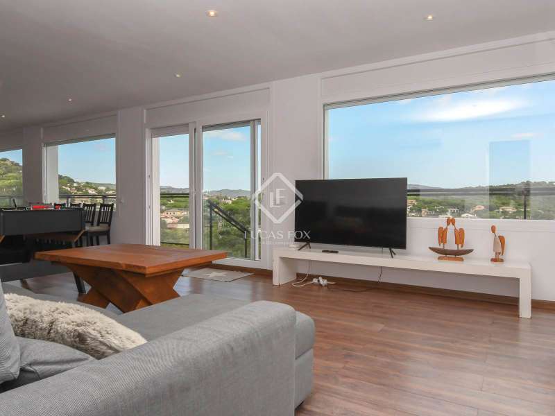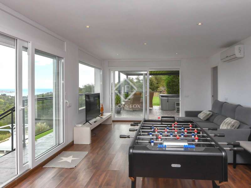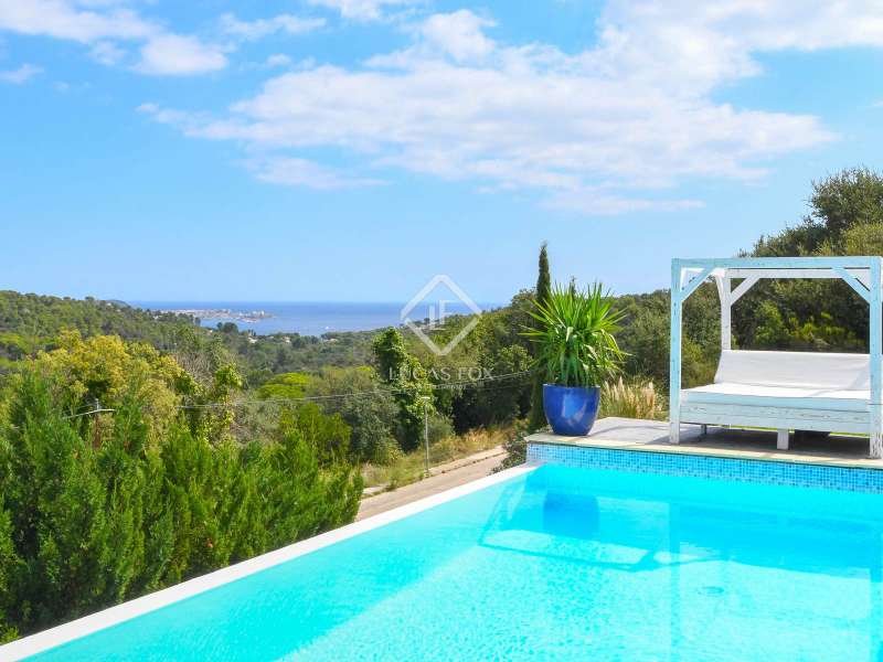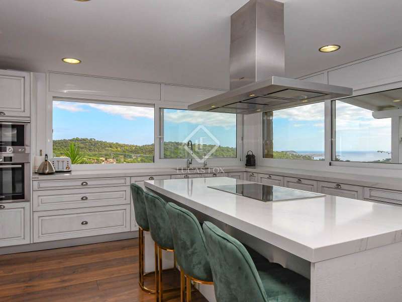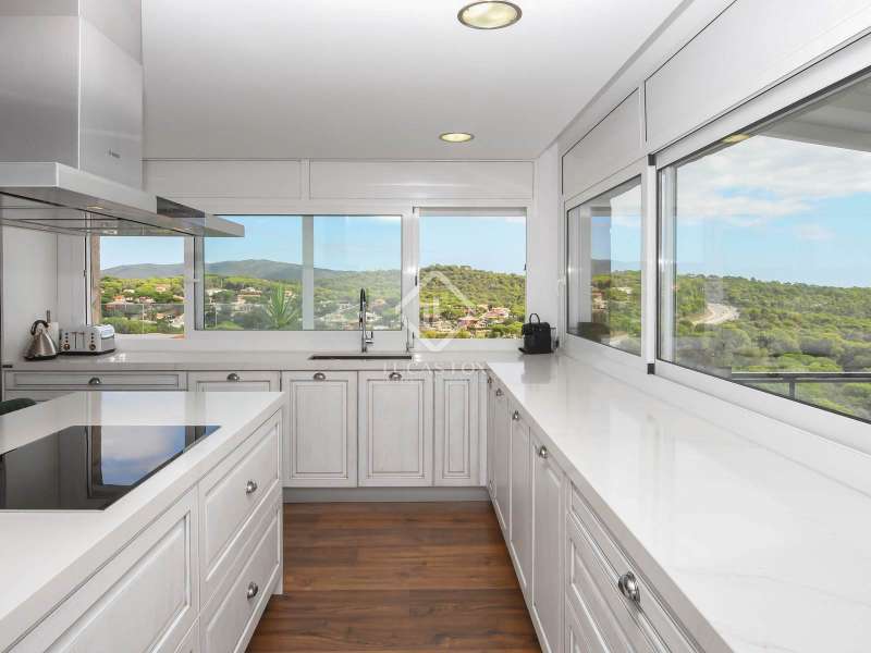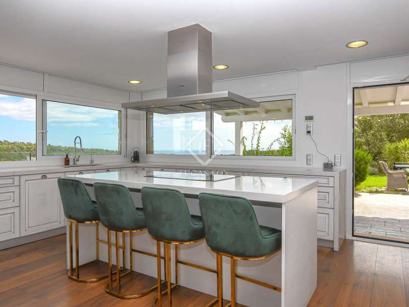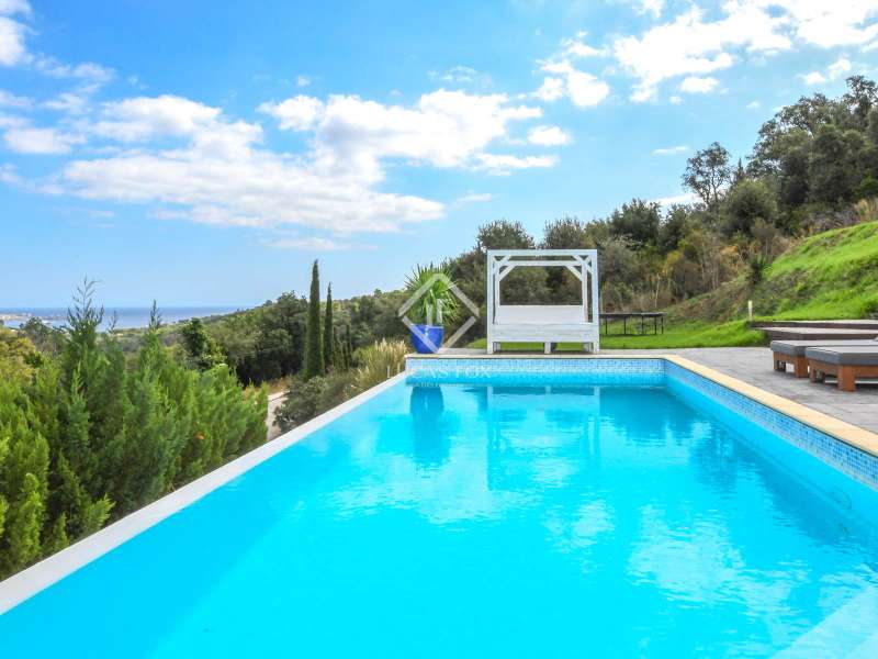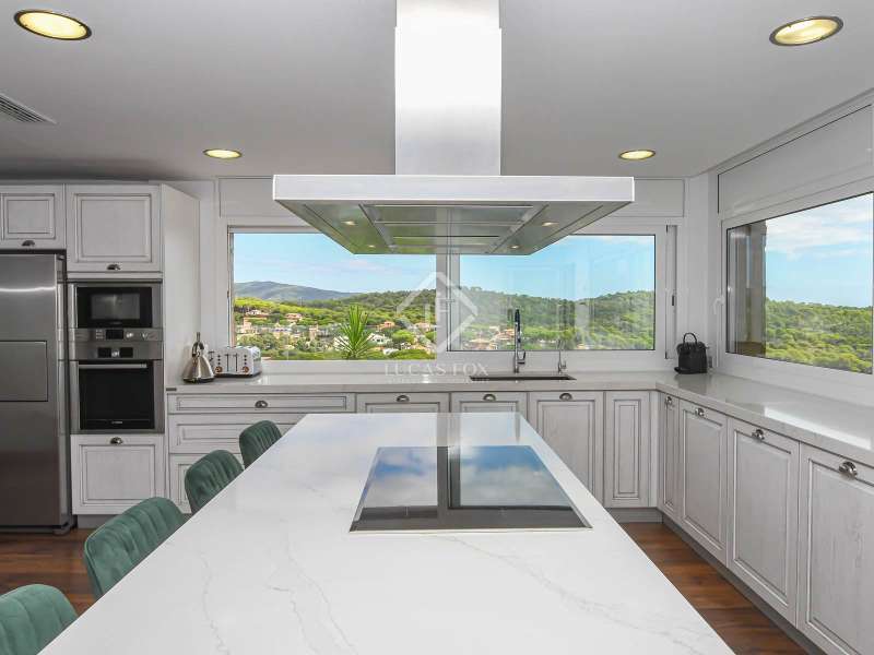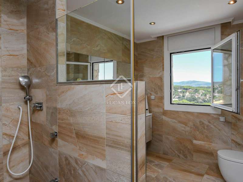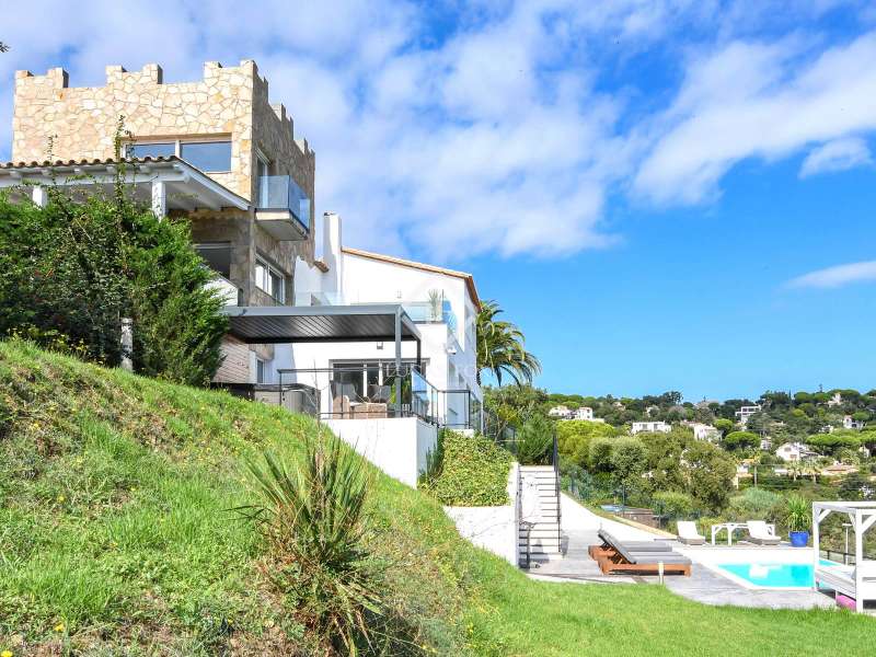 Lucas Fox presents Villa Bruna, a perfect summer property in Calonge, just minutes from Platja d'Aro and its beaches overlooking the Mediterranean Sea and the Gavarres Nature Reserve. The property boasts a modern style combined with a classic stone tower. The interior is very cozy and spacious. Renovated in 2018, it comprises 447 m² of built area on a 1,450 m² plot . Villa Bruna is divided into three floors. We enter the property through a terrace that leads to the main entrance and its entrance hall. On this same floor, on the right, we find a large open kitchen by Consentino with a Silestone countertop and a central island, fully equipped with Bosch appliances . It also has a separate storage space. From the kitchen, we can enjoy sea views thanks to its large windows. Next, we find a spacious living-dining room with a fireplace and access to a large terrace with views. From the kitchen, there is another access to another covered terrace. On that floor, we have three double bedrooms with a full bathroom , a guest toilet , and a laundry room room. This floor has parquet floor and a reversible ducted air conditioning system. There is also a garage converted into a storage space. We ascend to the upper floor via a marble staircase. Here, we find the main bedroom with incredible views from the double bed and a private balcony, a bathroom with a walk-in shower, and a dressing room. We descend to the lower floor via a parquet-style staircase. We reach another very spacious living room with views, two bedrooms with private bathrooms and walk-in showers, and another double guest bedroom . This floor has reversible air conditioning and wooden floors. It also offers access to the exterior area with its spacious terraces, an 8 x 4 meter saltwater infinity pool , a jacuzzi, and a double garage. The house is equipped with an alarm system, electric shutters, Wi-Fi, an osmosis water filtration system, Daikin reversible air conditioning, and double-glazed windows. The property is situated on two plots; a house of approximately 200m2 could be built on the garden plot . Villa Bruna is perfect for entertaining friends, large family gatherings, and enjoying the Costa Brava. Don't hesitate to call us to schedule a viewing or request more information.