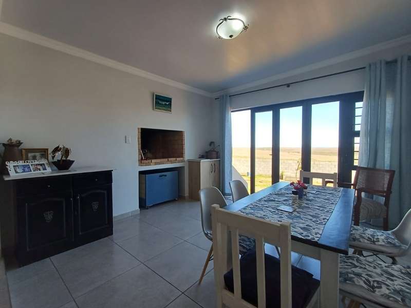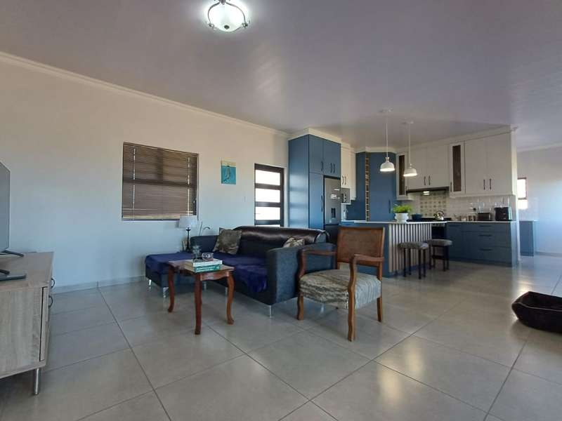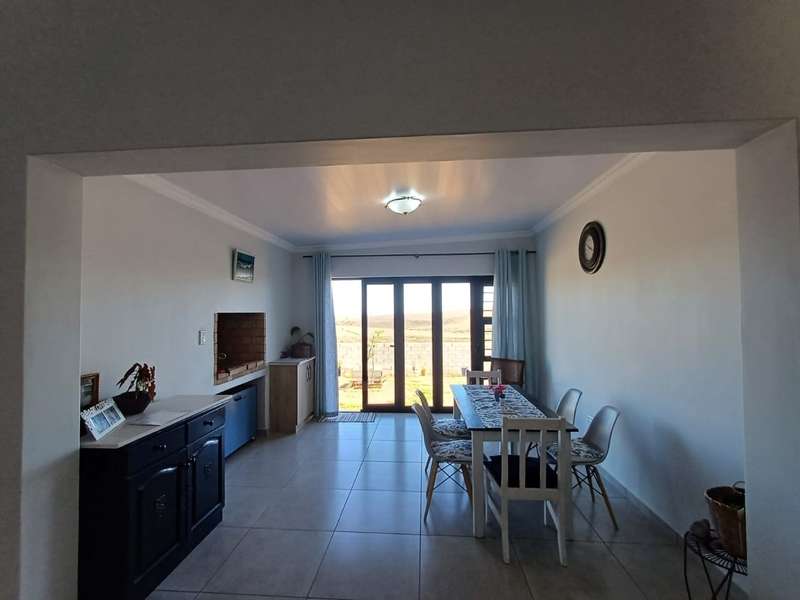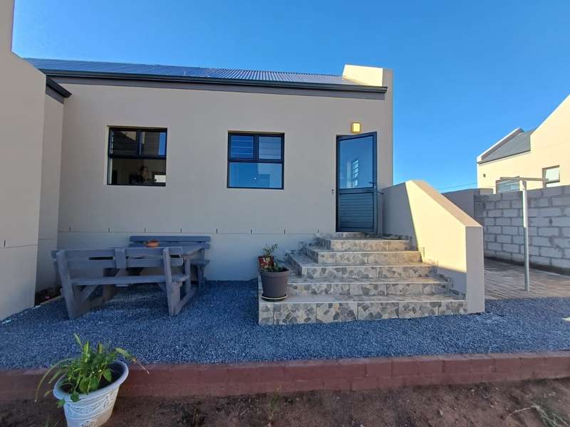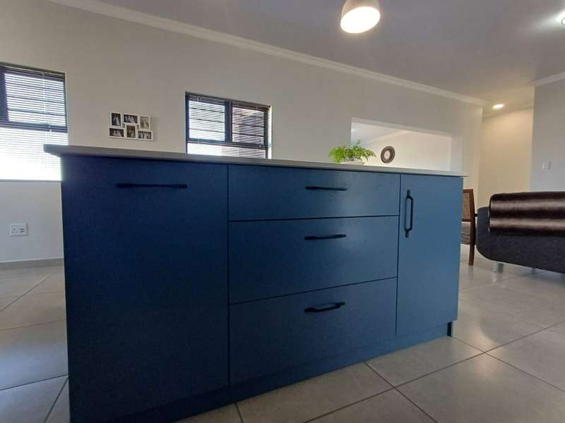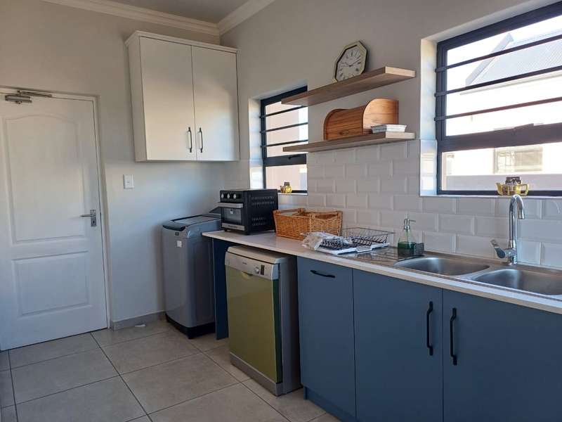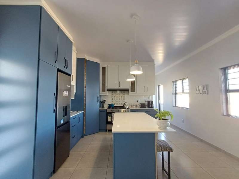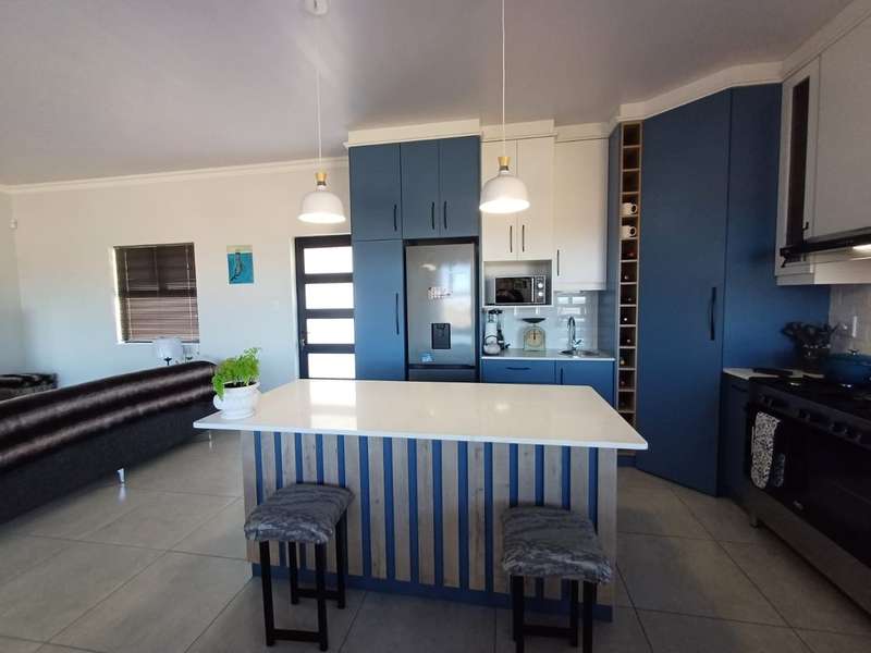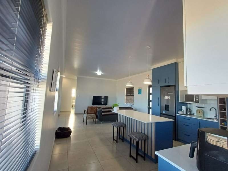 This home offers a calming atmosphere, highlighted by its unique soft blue finishes that evoke the serene hues of the ocean meeting the western horizon. The west-facing braai area is perfectly positioned to enjoy stunning West Coast sunsets while entertaining guests. An open-plan kitchen, dining, and lounge area creates a spacious and welcoming environment—ideal for family life, where everyone can be together while meals are prepared and homework is done. The kitchen features an island countertop for additional workspace, along with a gas hob and electric oven. A separate scullery and laundry area leads off the kitchen, with direct access to the backyard. The double garage conveniently connects to the scullery/laundry area and is fitted with an automatic garage door. The generously sized main bedroom includes an en-suite bathroom with a shower, toilet, and basin, designed for comfort and ease of access—particularly suitable for elderly residents. A full family bathroom includes a bath, shower, basin, and toilet. Two additional bedrooms are equipped with built-in cupboards. Additional features include a paved driveway and a fully walled property for privacy and security.