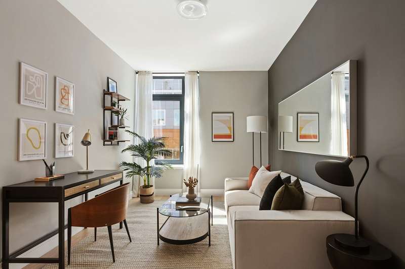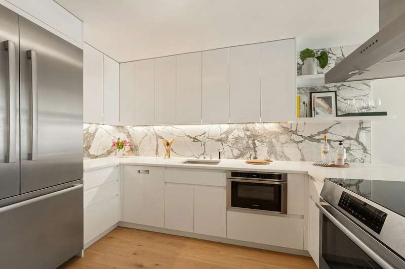 Experience sustainable luxury in this 3 bed, 2 bath residence at The Dovecote, where design, functionality, and Passive House converge seamlessly. Accessed through a private elevator vestibule, the home features premium interior finishes, sound-attenuating windows for natural light, timeless white oak flooring, and an efficient VRF HVAC system. The heart of the home includes a cook's kitchen with Caesarstone countertops, Porcelanosa backsplash, custom lacquered cabinetry, and a prominent Bosch stainless steel appliance suite. The recirculating hot water system adds efficiency and reduces waste. The primary bath is a clean design sanctuary with Persian white Porcelanosa floor tiles, Carrera Blanco wall tiles, a custom lacquered vanity with a Caesarstone countertop, and a walk-in shower with Grohe fixtures. The secondary bath combines Travertine-look porcelain floor tile, Italian glazed white porcelain wall tile, and a spacious soaking tub with polished chrome Kohler fixtures. Indulge in unparalleled sustainable living at The Dovecote.