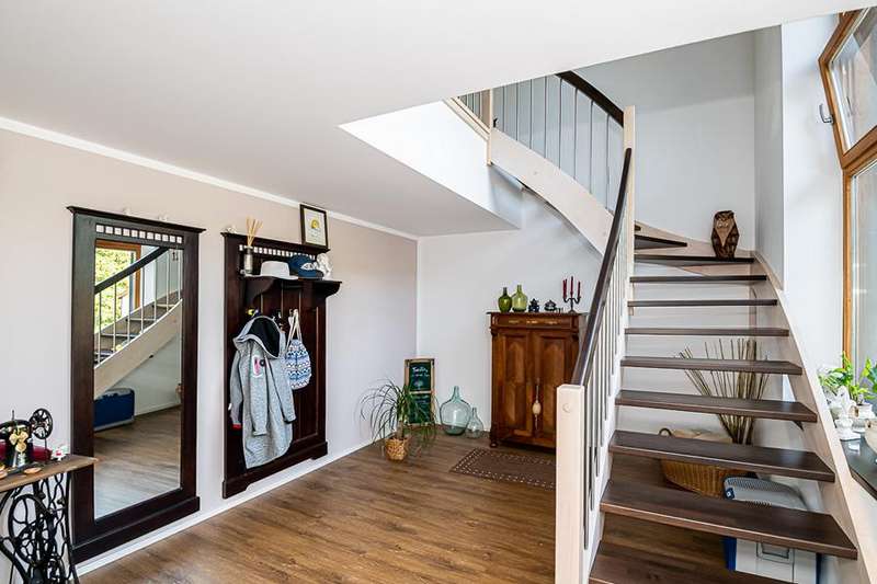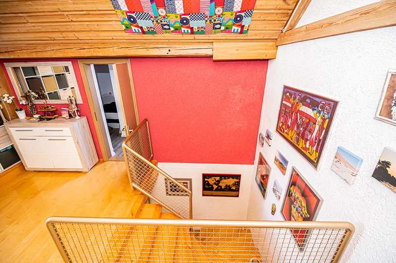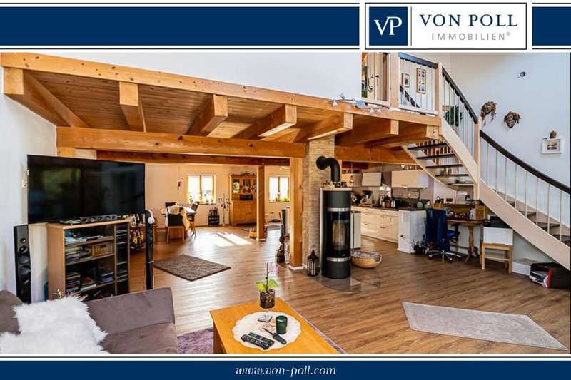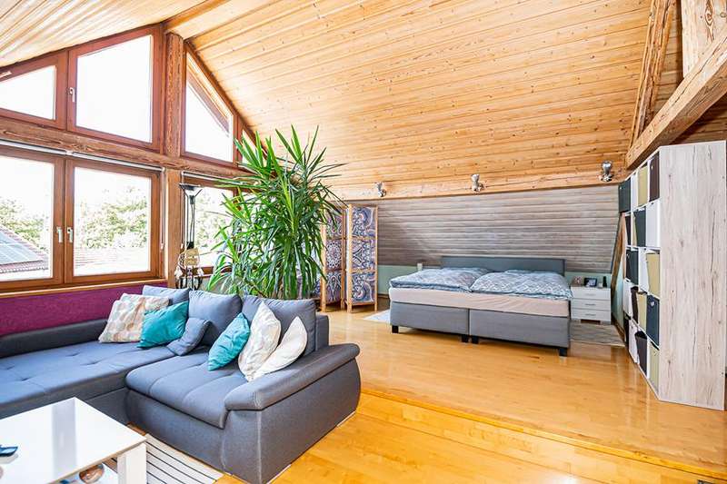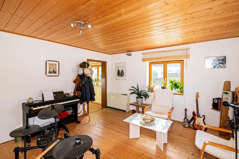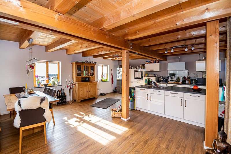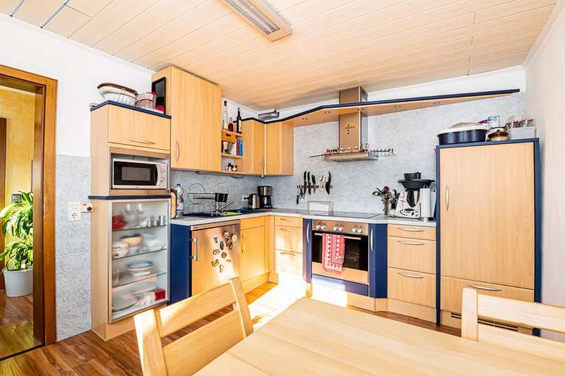 This well-maintained property is a two-family house with approx. 260 m² of living space, which has been renovated again and again in recent years and is ready for immediate occupancy. Entering the hallway and staircase on the first floor, you will find the newly renovated guest toilet and the staircase that leads you upstairs to the first apartment. Here are two children's rooms, a bedroom, the bathroom with tub and the kitchen. Via the hallway it goes into the converted attic, here everything is openly designed, so you can let your creativity play. In addition, here is still a bathroom newly renovated in 2019. Back on the upper floor it goes to the second apartment, which was completely redesigned in 2014. Here everything is set up to feel good. The complete room living, dining, kitchen have been designed very open and with a lot of wood and can be heated in cold days with a wood stove that provides soothing warmth. The staircase in the living area leads to the attic, which provides a pleasant ambience with the open roof truss. Here you will find the bedroom with dressing room and the spacious bathroom with tub and a very large open shower. A highlight of the house is the terrace of about 90 m², of which about 20 m² are covered, here you can relax in peace, barbecue or just enjoy the sun. This was built on the carport suitable for three vehicles. With the current owners, the first floor was used for storage rooms and workshop, but can also be converted into an apartment without any problems. Furthermore, there is a hall of about 360 m² on the property, which was currently used as a grocery store, but can also be converted for something new at any time. Parking spaces and a small garden are available on the approx. 1900 m² large property. If this property has aroused your interest, you are welcome to contact us.