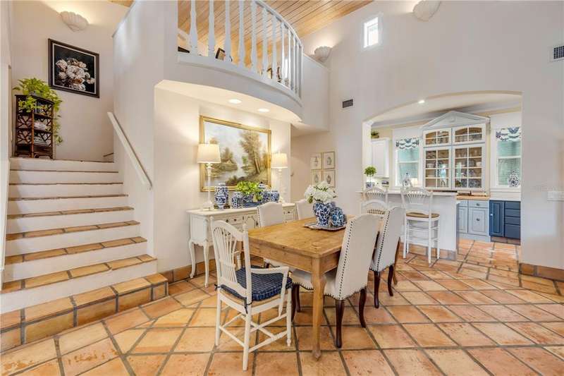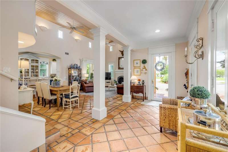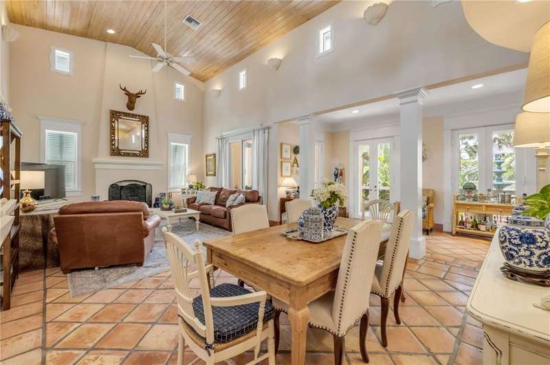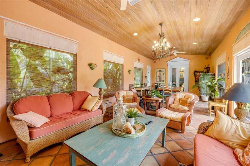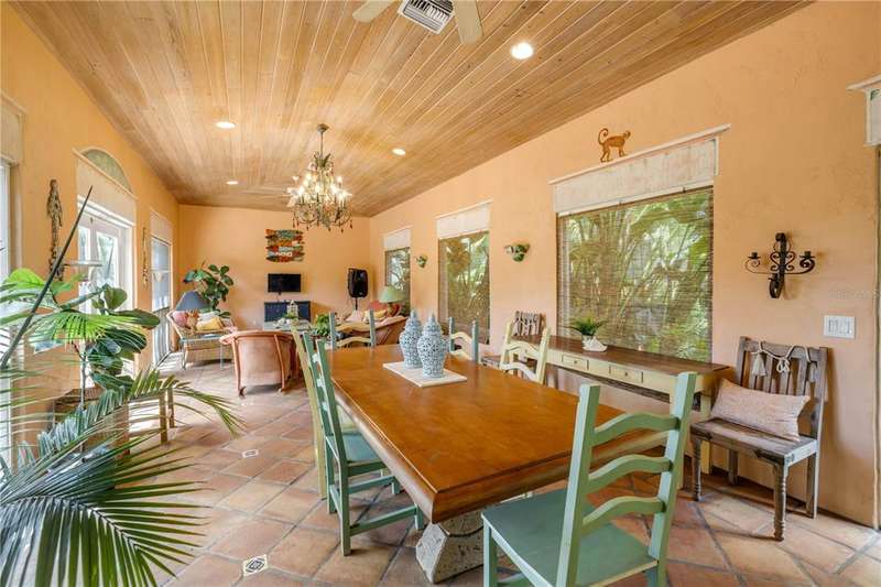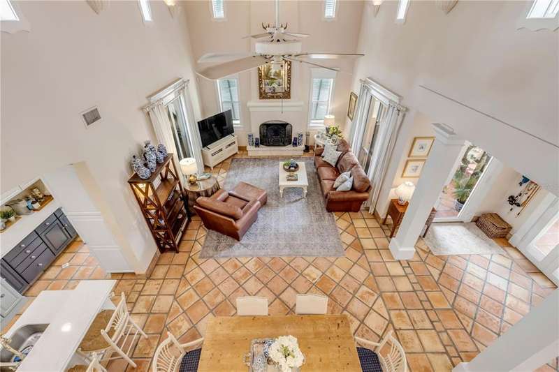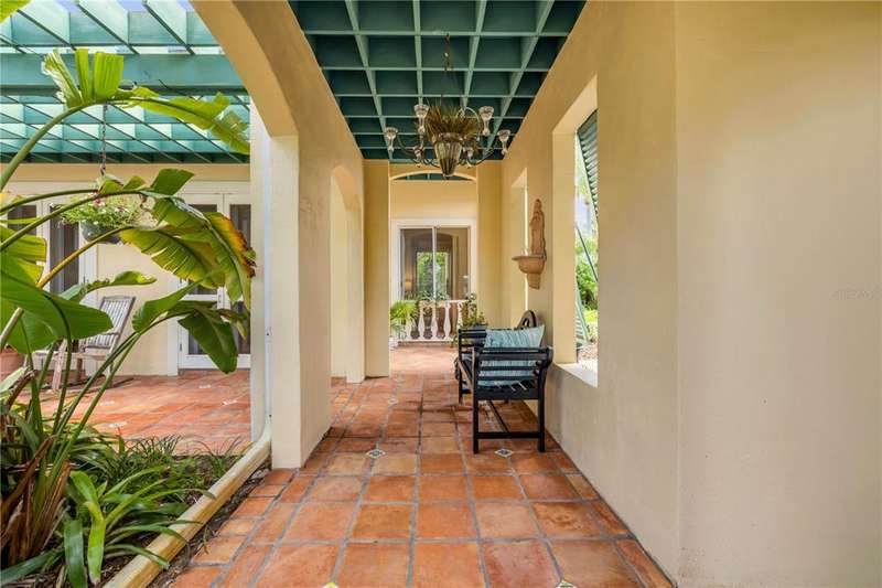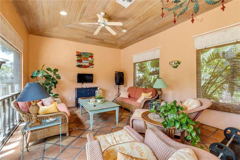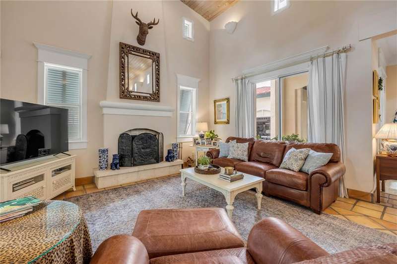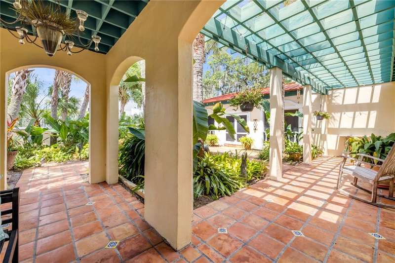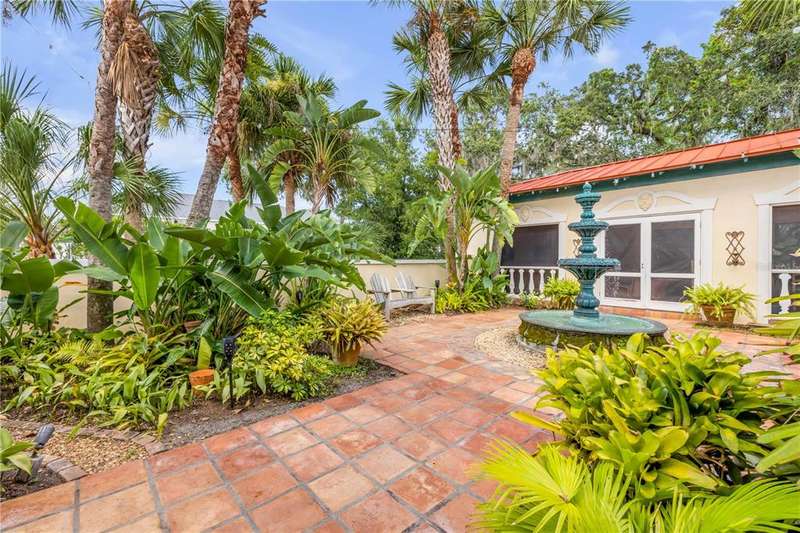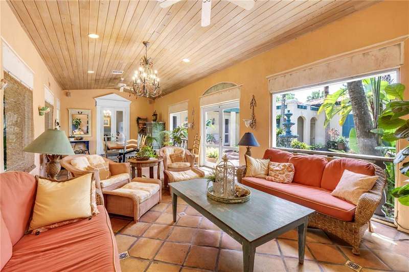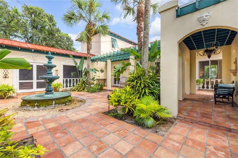 Under contract-accepting backup offers. Prepare to be wowed by this stunning 3 bedroom, 3 1/2 bath, Spanish inspired residence that exudes charm, warmth and casual elegance. Upon entering you are drawn to the large living area with vaulted ceilings, rich Mexican tile, a fireplace and charming clerestory windows inspired by Spanish hacienda design that allow for soft natural light. The thoughtfully designed layout includes a ground-floor primary suite for comfort and privacy, while each additional bedroom offers its own en-suite bathroom and French doors onto Juliet balconies. At the heart of the home is an expansive open-air/Lanai enclosed by a solid roof and walls, yet open to the breeze through large, screened windows. The home surrounds an open courtyard with lush landscaping and a beautiful Spanish-style fountain. Room for all of your toys in the extra deep 2 car plus golf cart garage. New metal roof, fenced yard, new LVP in bedrooms. This home offers a rare blend of style and serenity. A must see.