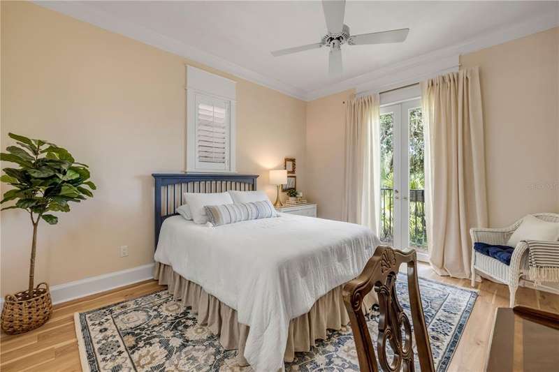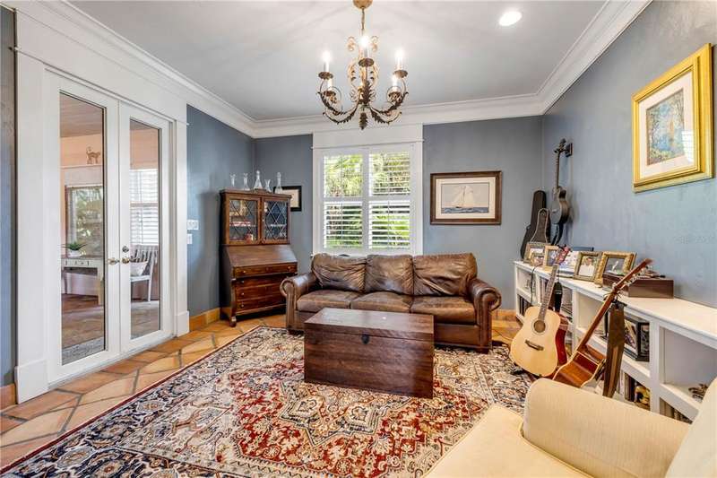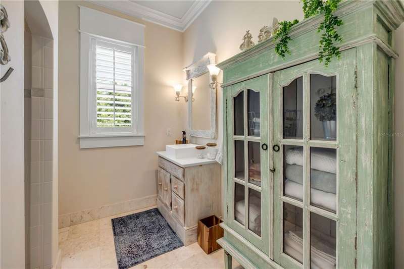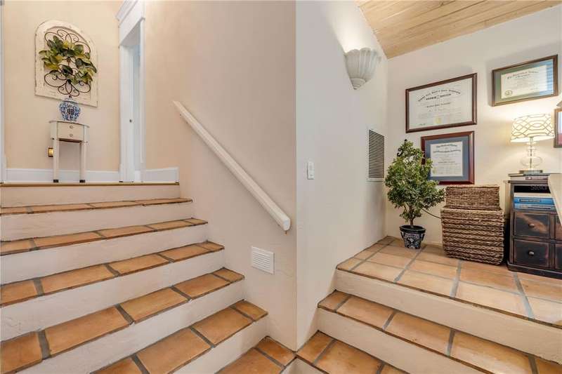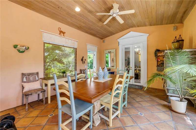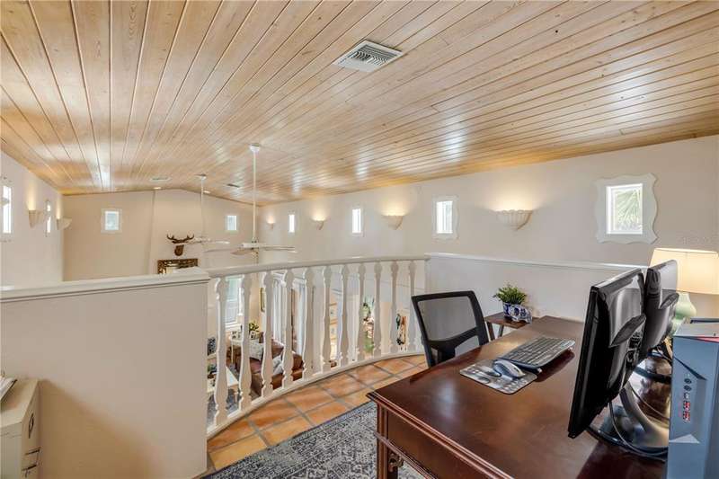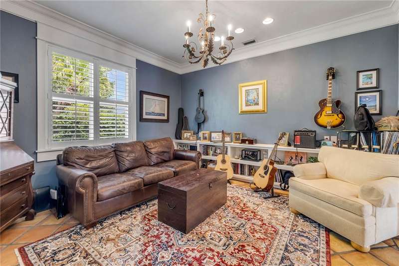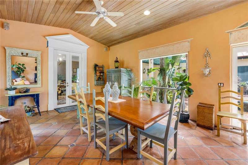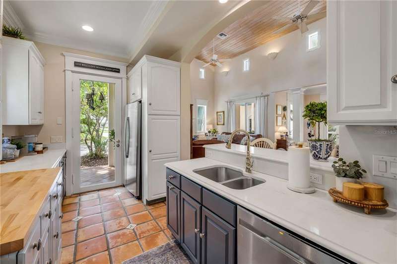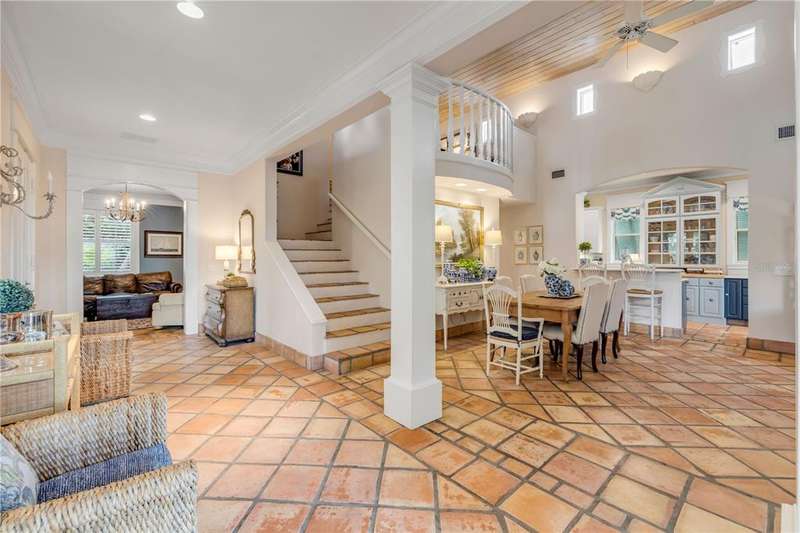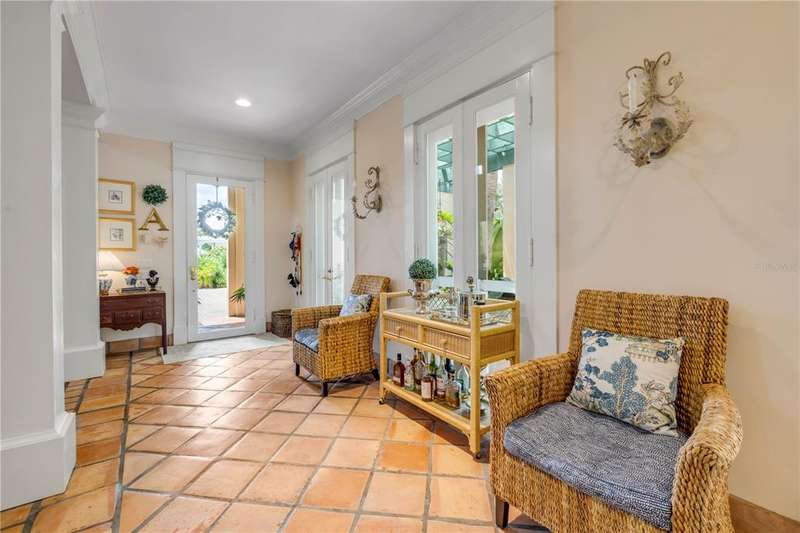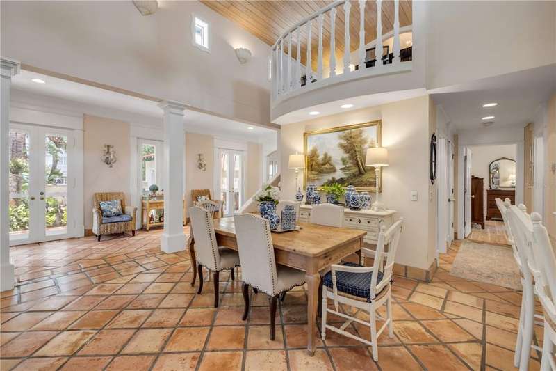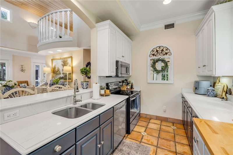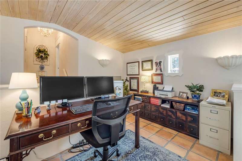 Under contract-accepting backup offers. Prepare to be wowed by this stunning 3 bedroom, 3 1/2 bath, Spanish inspired residence that exudes charm, warmth and casual elegance. Upon entering you are drawn to the large living area with vaulted ceilings, rich Mexican tile, a fireplace and charming clerestory windows inspired by Spanish hacienda design that allow for soft natural light. The thoughtfully designed layout includes a ground-floor primary suite for comfort and privacy, while each additional bedroom offers its own en-suite bathroom and French doors onto Juliet balconies. At the heart of the home is an expansive open-air/Lanai enclosed by a solid roof and walls, yet open to the breeze through large, screened windows. The home surrounds an open courtyard with lush landscaping and a beautiful Spanish-style fountain. Room for all of your toys in the extra deep 2 car plus golf cart garage. New metal roof, fenced yard, new LVP in bedrooms. This home offers a rare blend of style and serenity. A must see.