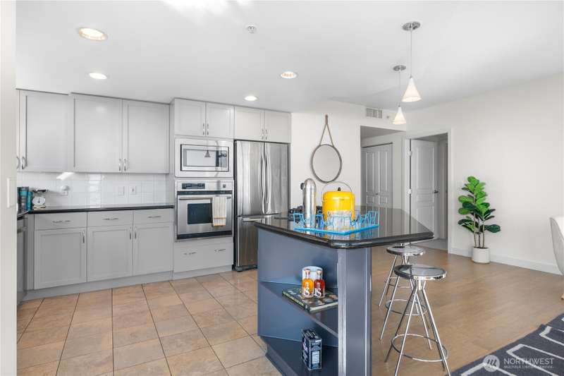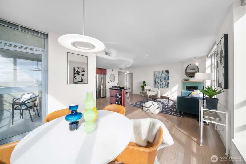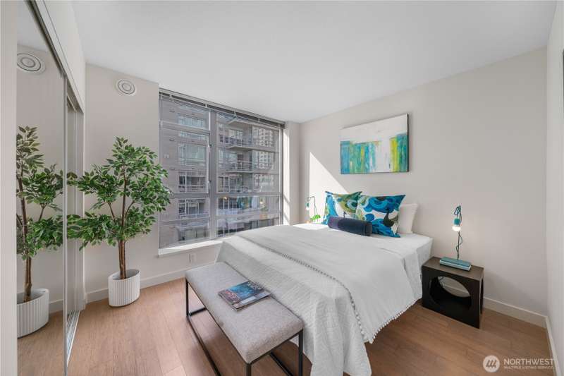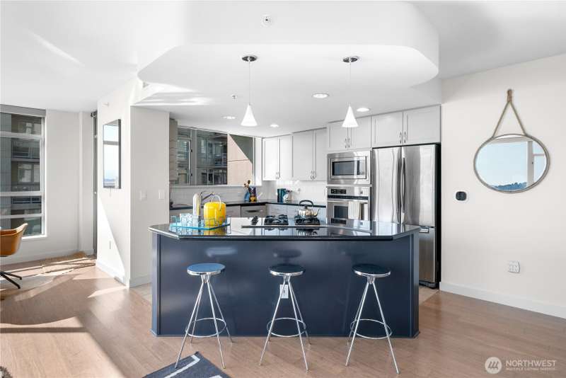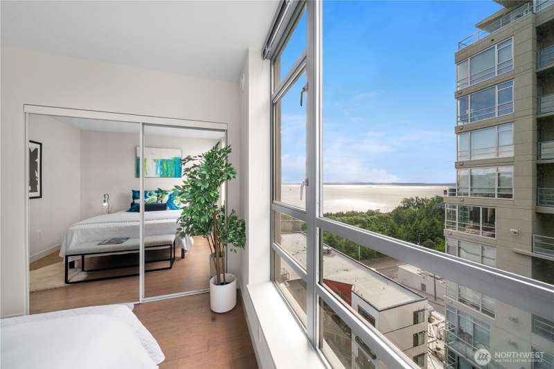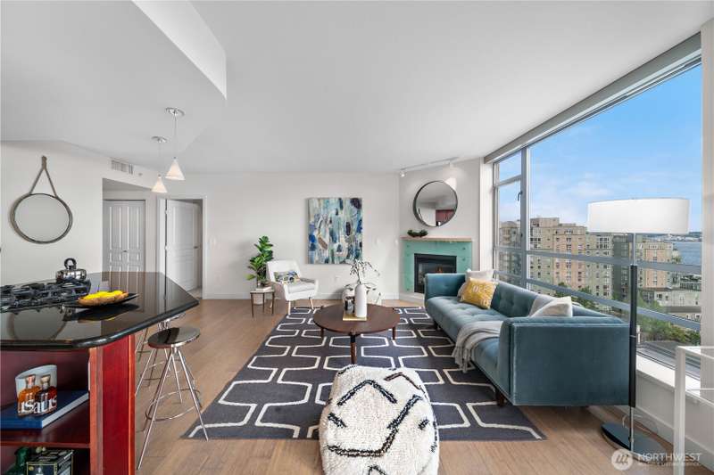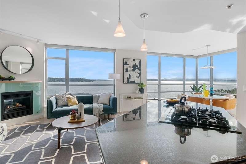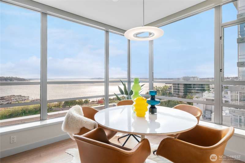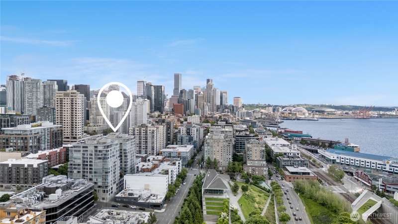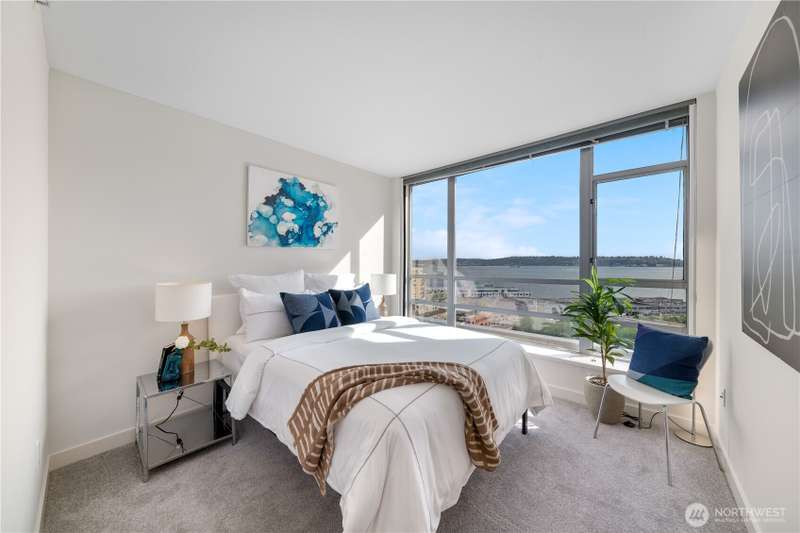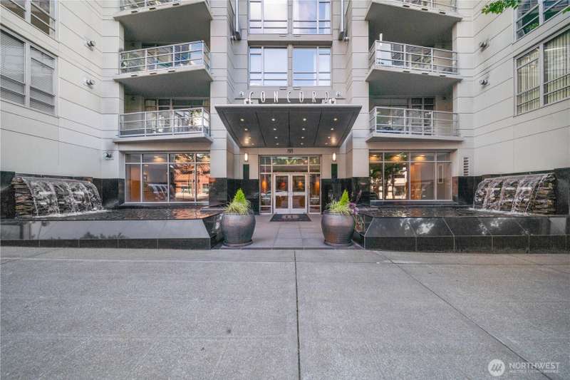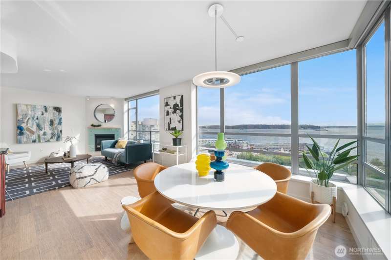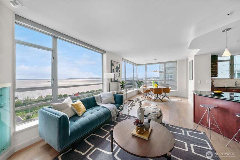 Perched above the Elliott Bay, this stunning corner 2-bedroom condo offers expansive windows with unobstructed views of Puget Sound and the Olympics, blending urban convenience with golden sunsets over the water. Thoughtfully designed with an open layout, and private balcony: perfect for both relaxing and entertaining. Smart home controls of blinds and heating with central AC. Enjoy living in a quiet part of Belltown and easy access to top-tier restaurants, vibrant nightlife, and the waterfront all just outside Concords front door. The building is pet friendly to bring your fury friend and luxury amenities abound. With a parking space and storage unit in private garage this condo delivers the ultimate Seattle living experience.
