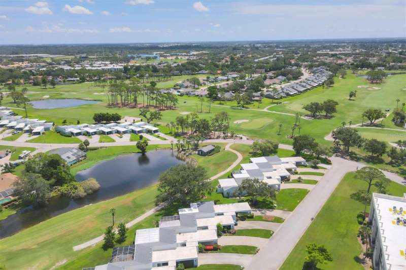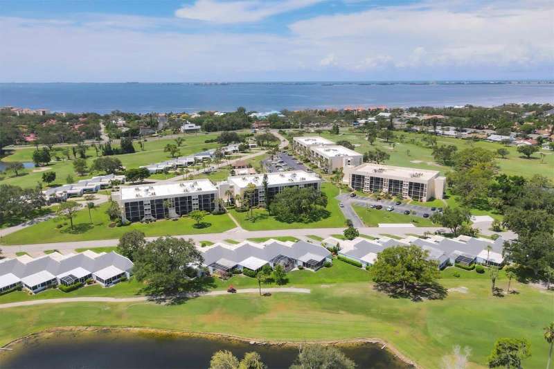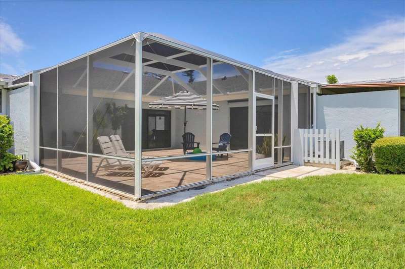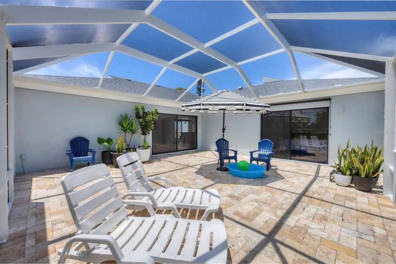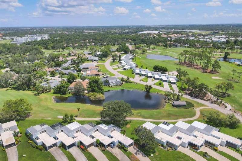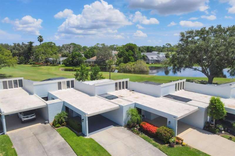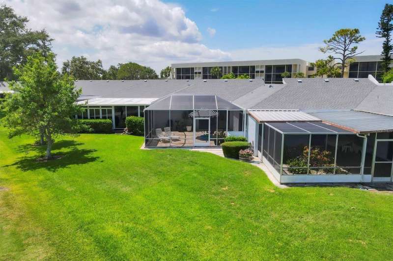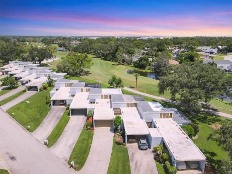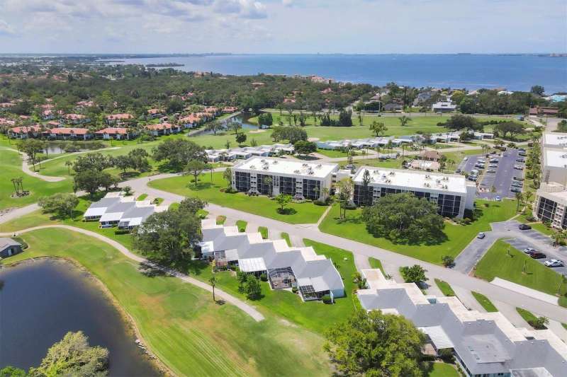 Step into this light-filled, freshly painted gem in the rarely available and highly sought-after El Conquistador Village. Ideally located on a quiet cul-de-sac just steps from IMG Academy, this beautifully updated condo offers sweeping golf course views. Past the oversized parking area and secure iron gate, a charming courtyard welcomes you, perfect for morning coffee. Inside, soaring ceilings and an open-concept layout seamlessly connects the living room and kitchen, ideal for easy entertaining. The kitchen features a butcher block countertop with seating for four, accented by a birch wood wall and stylish backsplash. Both bedrooms are generously sized, with the primary suite offering a built-in office nook and wall-to-wall closets. Bathrooms are finished with floor-to-ceiling tile for a sleek, modern look. Enjoy indoor-outdoor living from the new, spacious screened-in patio accessible from the living room, kitchen, and primary bedroom. A recently replaced roof, no flooding from last year's hurricanes, and full community amenities, including a heated pool and clubhouse. Nestled in the heart of El Conquistador and backing directly onto IMG Golf Course, you're minutes from shopping, dining, and our sugar sand beaches. HOA fees include landscaping, exterior maintenance, pest control, basic cable, master insurance. Please note the back patio is the responsibility of the owner for upkeep and replacement.