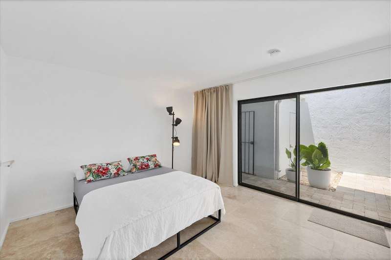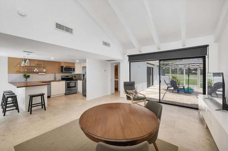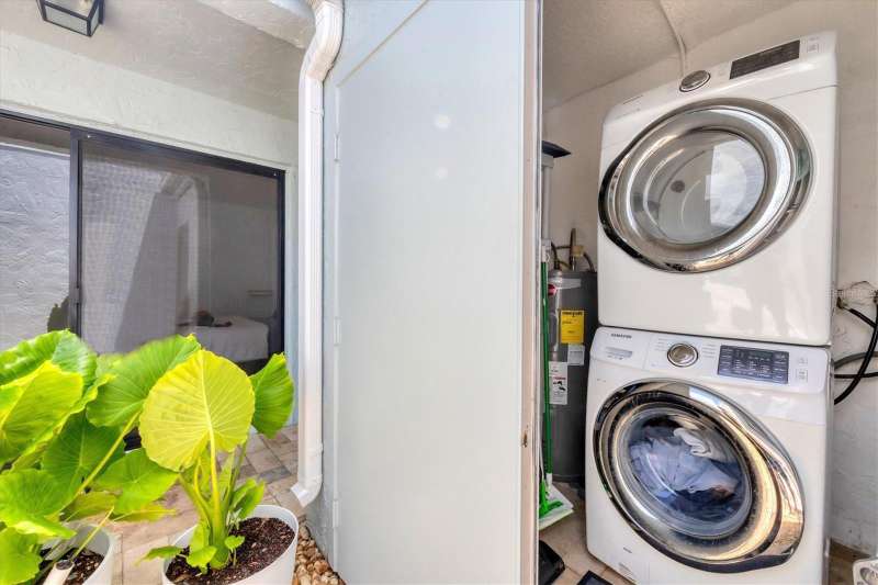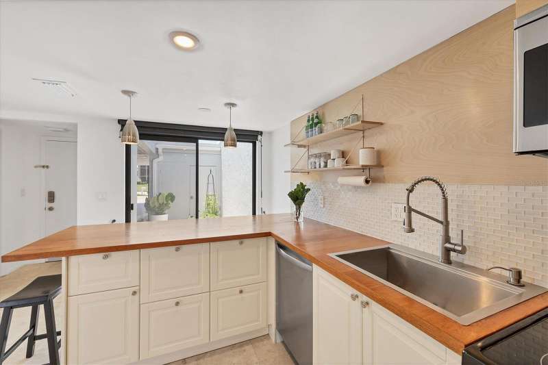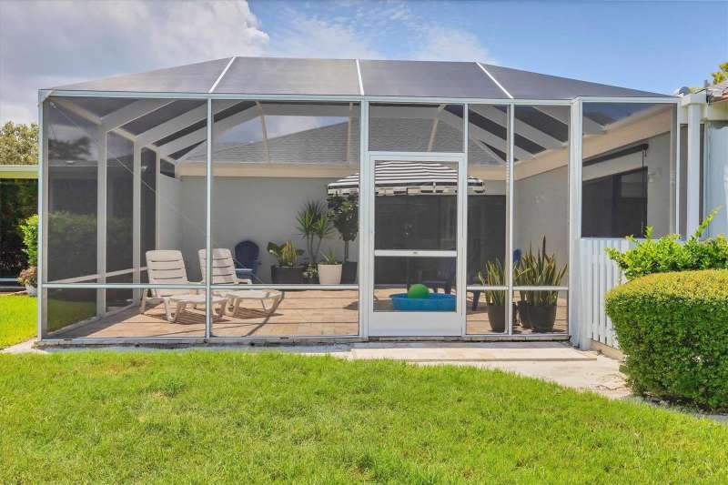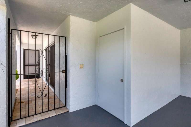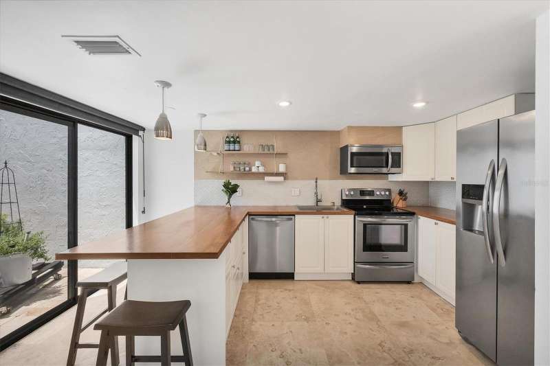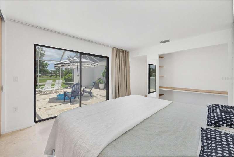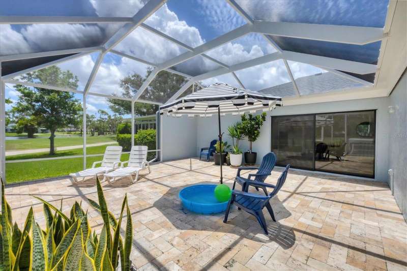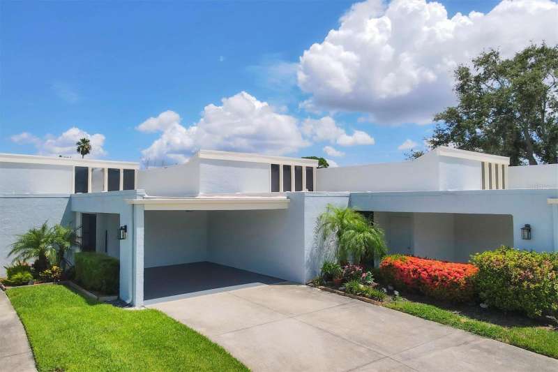 Step into this light-filled, freshly painted gem in the rarely available and highly sought-after El Conquistador Village. Ideally located on a quiet cul-de-sac just steps from IMG Academy, this beautifully updated condo offers sweeping golf course views. Past the oversized parking area and secure iron gate, a charming courtyard welcomes you, perfect for morning coffee. Inside, soaring ceilings and an open-concept layout seamlessly connects the living room and kitchen, ideal for easy entertaining. The kitchen features a butcher block countertop with seating for four, accented by a birch wood wall and stylish backsplash. Both bedrooms are generously sized, with the primary suite offering a built-in office nook and wall-to-wall closets. Bathrooms are finished with floor-to-ceiling tile for a sleek, modern look. Enjoy indoor-outdoor living from the new, spacious screened-in patio accessible from the living room, kitchen, and primary bedroom. A recently replaced roof, no flooding from last year's hurricanes, and full community amenities, including a heated pool and clubhouse. Nestled in the heart of El Conquistador and backing directly onto IMG Golf Course, you're minutes from shopping, dining, and our sugar sand beaches. HOA fees include landscaping, exterior maintenance, pest control, basic cable, master insurance. Please note the back patio is the responsibility of the owner for upkeep and replacement.