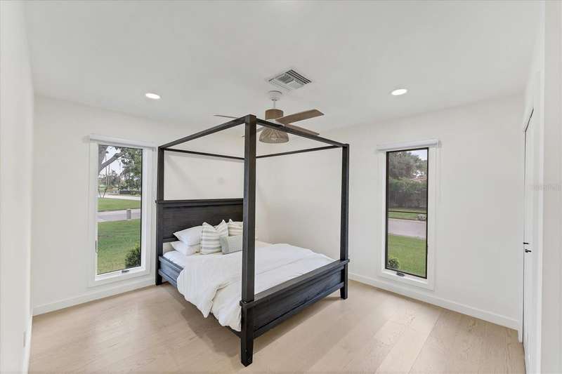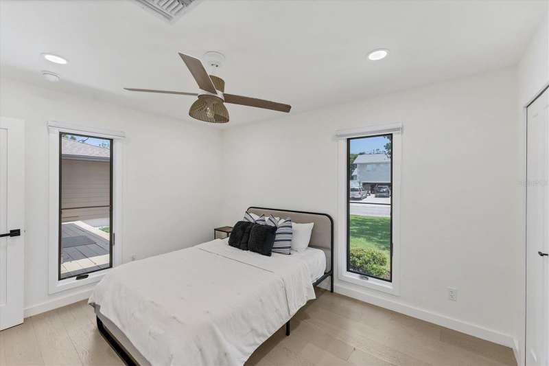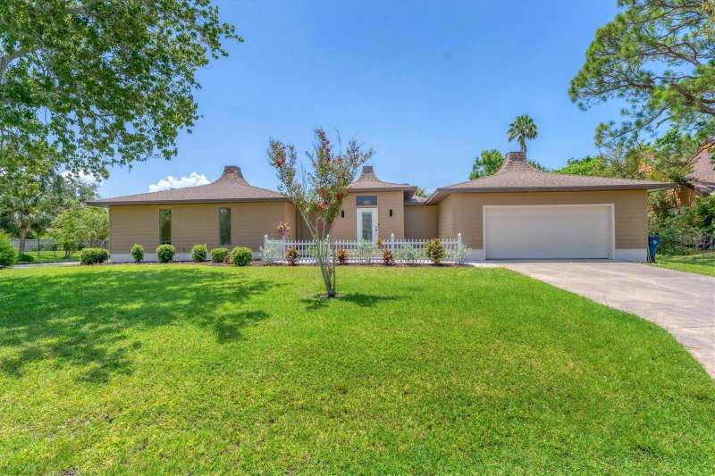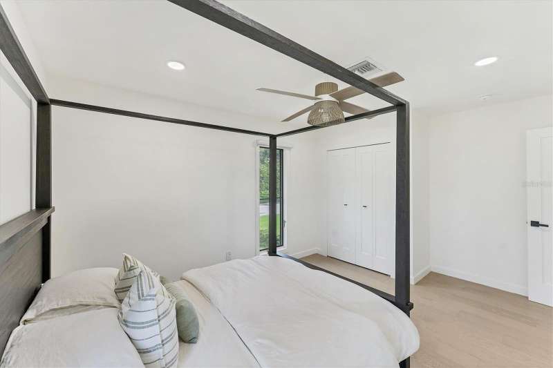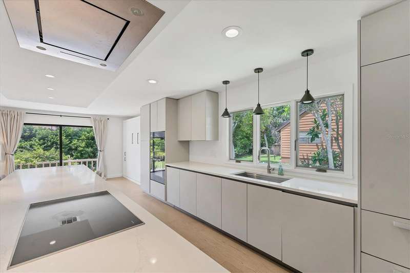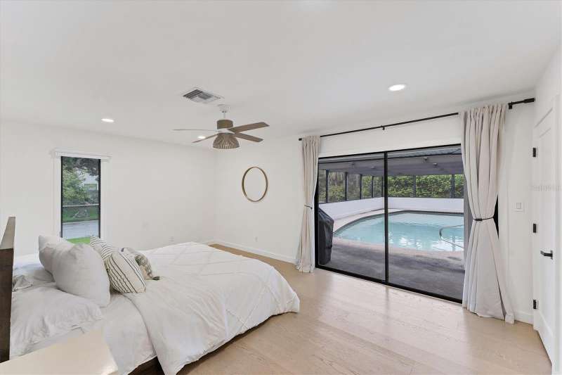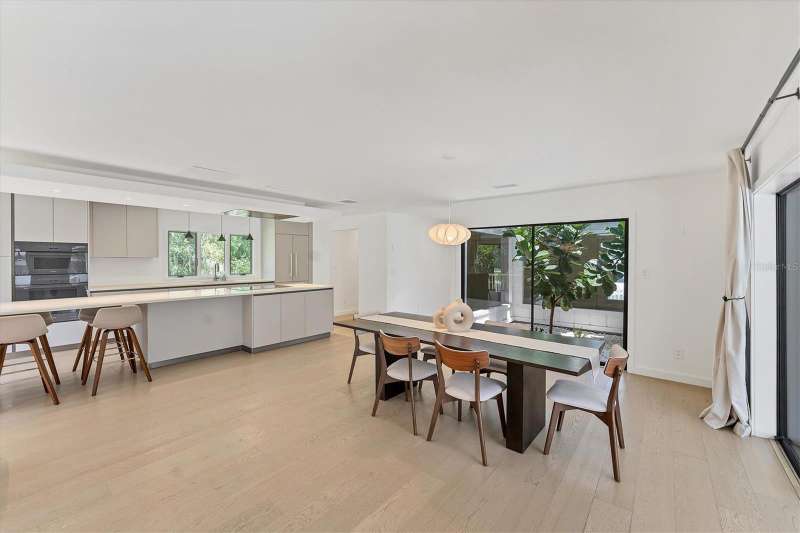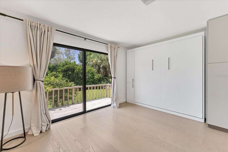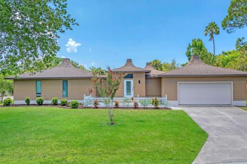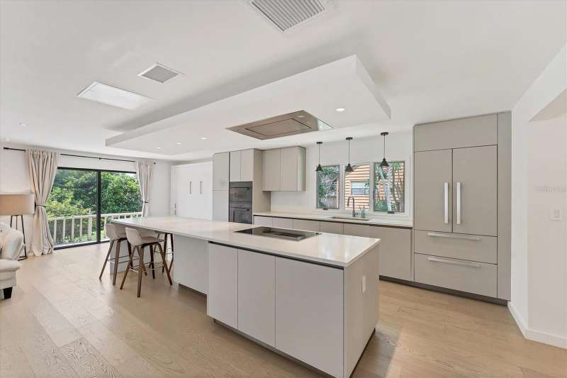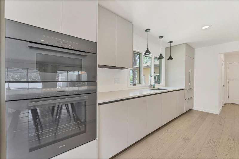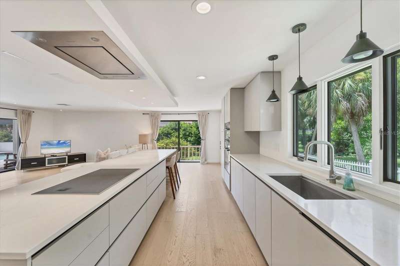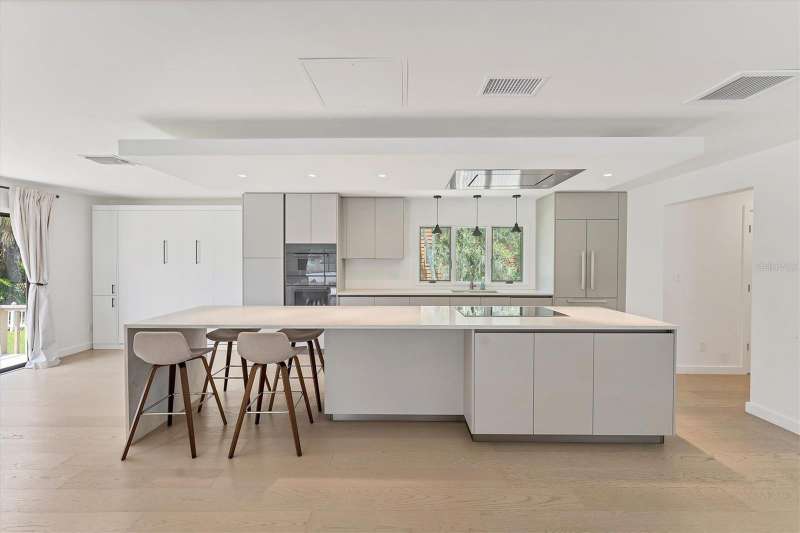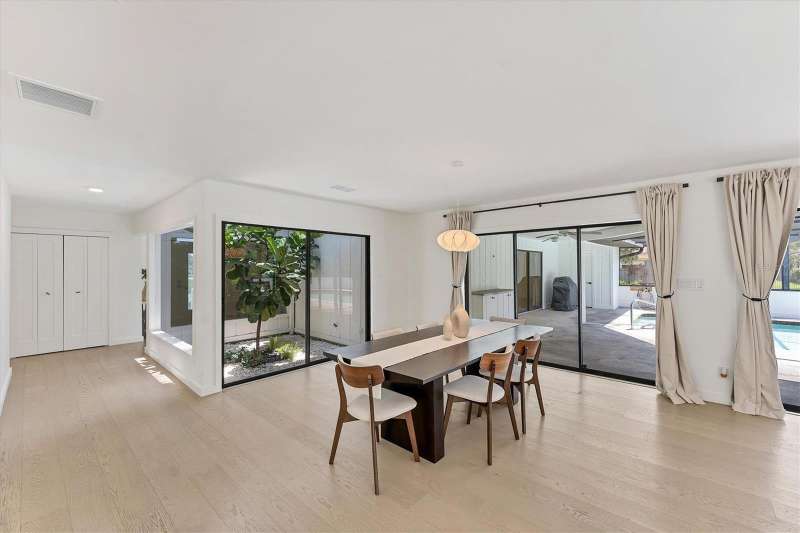 Exquisite Mid-century Modern gem on an oversized corner lot just minutes from IMG Academy. Stunning renovations enhance this home’s iconic architectural style, showcasing clean lines, expansive windows and sliders, open floor plan, and seamless connection to nature—all culminating in an elegant and luxurious living space. The expansive great room is filled with natural light and opens directly to the screened lanai, creating effortless indoor-outdoor flow ideal for entertaining. At the heart of the home, the custom kitchen boasts high-end Italian cabinetry, quartz countertops, premium Miele appliances, and a striking waterfall island with bar seating. The dining area sits just off the kitchen, perfectly integrated into the open layout for easy, elegant gatherings. The primary suite is a peaceful retreat with direct access to the lanai and a spa-style bathroom featuring a sleek vanity, lighted mirror, and walk-in shower. Two generously sized guest bedrooms provide comfort and flexibility for family or visitors, complemented by a stylish half bath and additional full guest bath. Relax and refresh on the expansive screened lanai with covered seating areas and a large pool. A rear deck and spacious backyard provide even more space to enjoy Florida’s natural beauty. With no HOA, the property allows for rental flexibility and pet-friendly living. Conquistador Bayside is a quiet neighborhood nestled along Sarasota Bay and only minutes to IMG Academy and golf course, the sugar sand beaches of Anna Maria Island, dining, and cultural attractions.