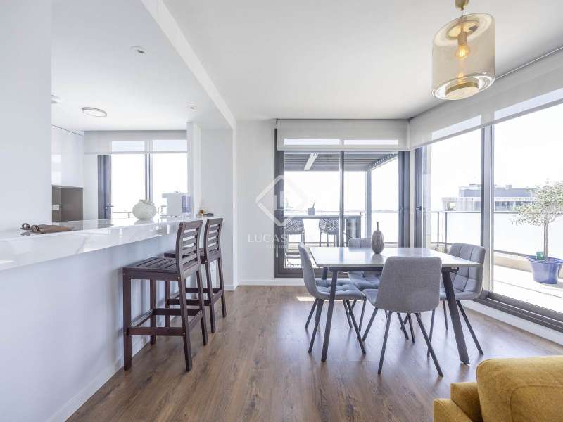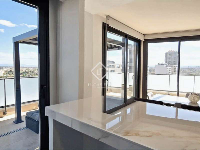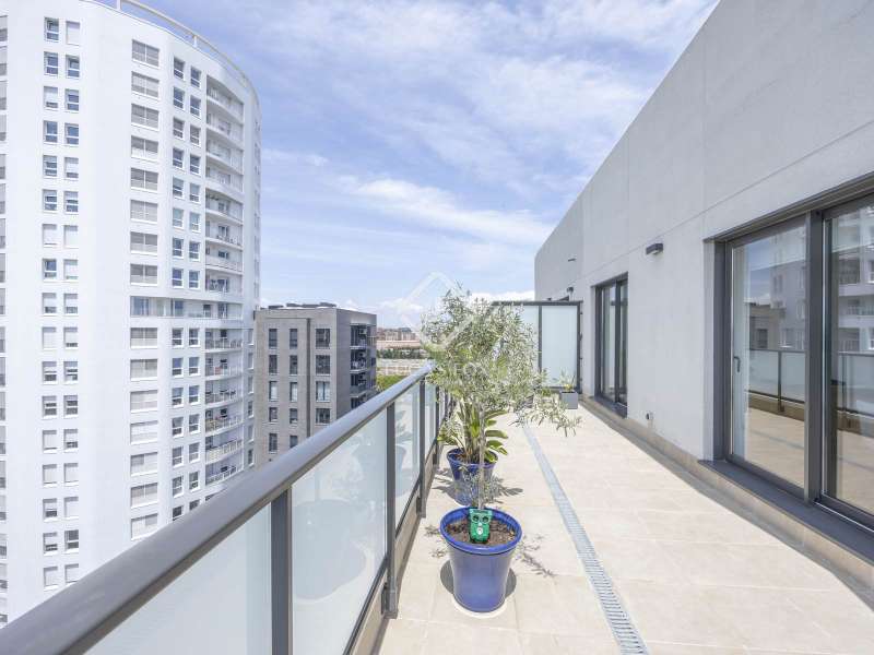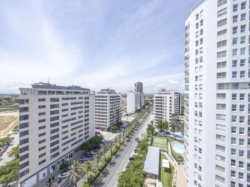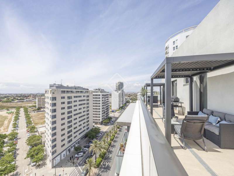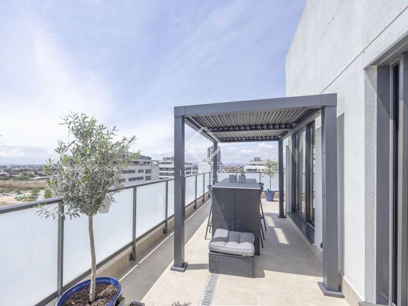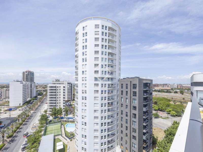 Lucas Fox presents this spectacular luxury corner penthouse, built in 2023, with a privileged southerly aspect that allows for year-round natural light. It is located in the new Las Moreras neighbourhood , the most sought-after area in Valencia, just minutes from the marina and the City of Arts and Sciences. This exceptional property comes fully furnished and includes a parking space and a storage room. Its private terraces, totaling 70 m², offer ample space for creating separate areas , such as a barbecue area, a practical storage room , and several pergolas with stunning sea and mountain views. The interior features a living-dining room seamlessly integrated with an open kitchen, two comfortable double bedroom , a full bathroom with a bathtub, and the main bedroom. Each room opens directly onto the terrace. The residential area where the property is located features a swimming pool, a garden with a children's area, and a social club. Contact us for more information or to arrange a personalized visit.