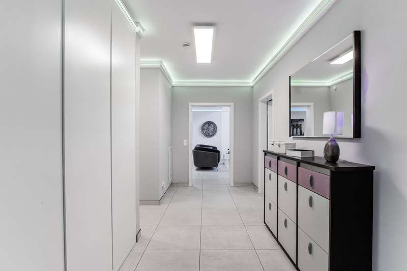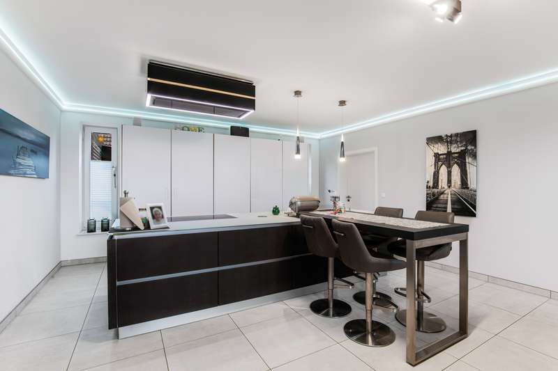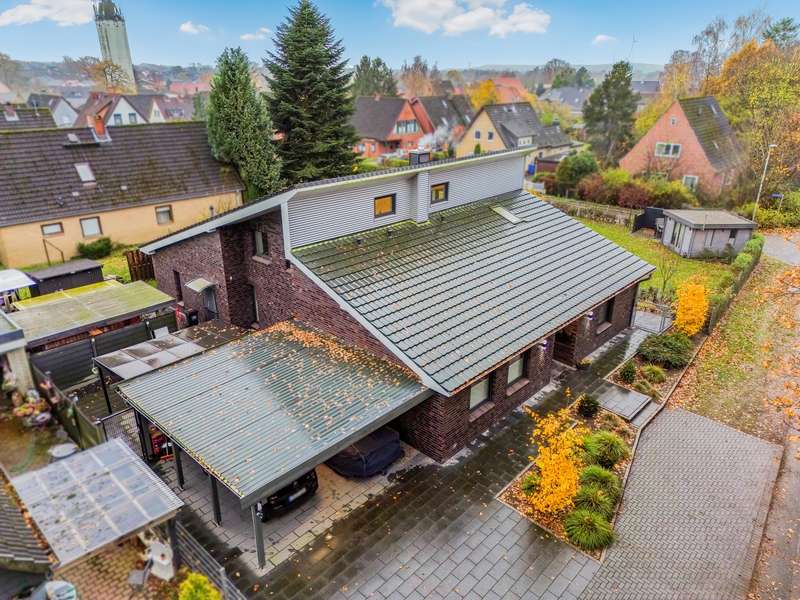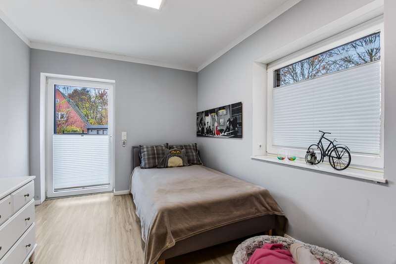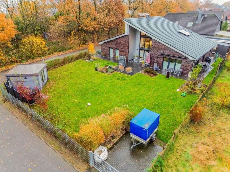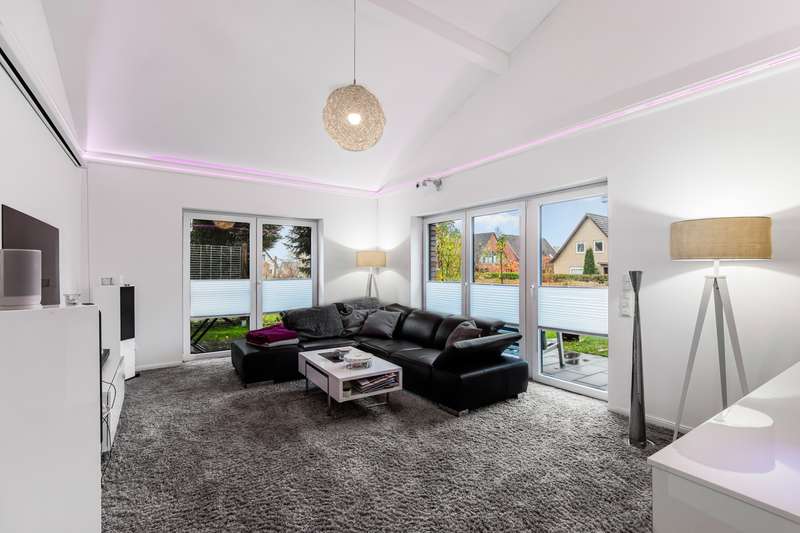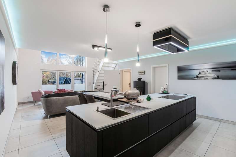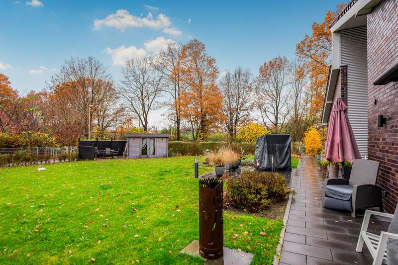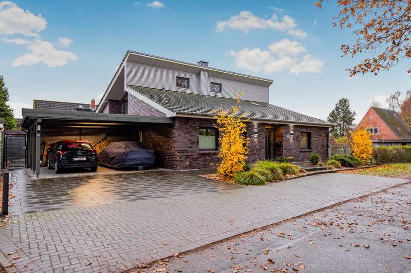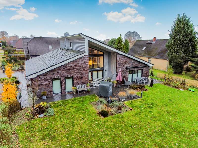 Welcome to a property that combines modern living with a rural idyll and meets the highest standards. This exclusive house from 2018 is located in a charming community of 3,000 people in the heart of Schleswig-Holstein, surrounded by nature and yet perfectly connected to Hamburg, Kiel, Neumünster and Bad Bramstedt. Here, style, comfort and tranquil surroundings merge to create a living space that inspires. The light-flooded house with a generous living space of 220 m² extends over a 950 m² plot with a sunny south-facing aspect. Large glass surfaces allow the interior to shine with natural light and create an inviting, open atmosphere. The luxurious furnishings with high-quality materials are evident in every detail - from the elegant kitchen in a light grey matt finish with premium Miele built-in appliances to a stylish stove that transforms the living-dining area into a cozy oasis of well-being on chilly days. With a total of seven rooms, including four flexibly usable bedrooms, the property offers plenty of space for families, guests or a home office. Two tastefully designed bathrooms, including a luxurious en-suite full bathroom, guarantee maximum comfort. The underfloor heating throughout the house, powered by a future-proof Bosch hybrid gas boiler, is not only efficient but also already prepared for operation with a heat pump. Solar thermal energy is installed, and a future connection to a biomass power plant has already been laid in the street within easy reach. On the upper floor, you are greeted by a spacious gallery that is currently used as an office - a flexible space that also offers room for sports, hobbies or a private library. Practical side rooms provide additional storage space or expansion reserves. The well thought-out lighting concept for the house and garden immerses the property in an atmospheric ambience, even in the dark. Roller shutters on almost all windows on the first floor, an automatic irrigation system for the garden, a built-in cupboard in the hallway and several sheds and shelters at the rear of the property make everyday life particularly convenient. A carport with two parking spaces, four outdoor parking spaces and an additional parking space for trailers or a motorhome are available for your vehicles. The house is also characterized by the fact that it is barrier-free. For example, extra-wide doors without thresholds have been provided in the parents' wing. There is also the possibility of creating two separate residential units from the living area and the parents' wing at a later date, each with its own access, in case the children leave home or the house becomes too large to manage on your own in old age. This dreamlike property combines modern living with sustainable furnishings and a perfectly thought-out room concept. Nestled in the idyllic surroundings of a lively community, you will enjoy a quality of life that is second to none. Discover your new home - a place where every day is a little bit of a vacation, even when working from home. We look forward to receiving your inquiry and, if you are seriously interested, to our joint viewing.
