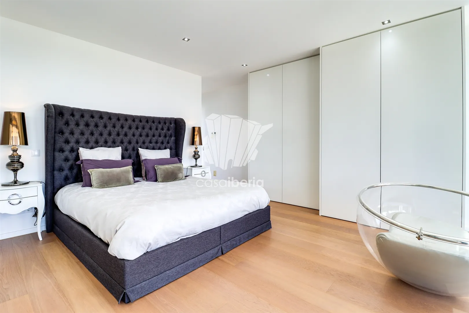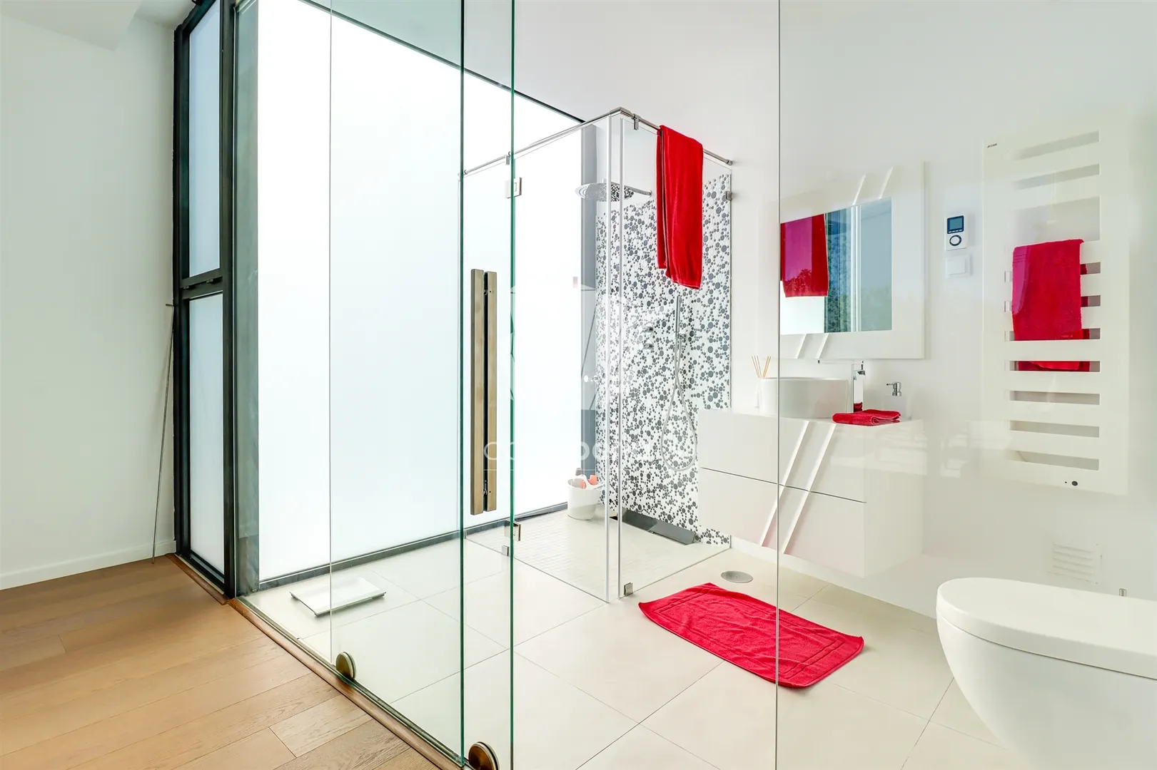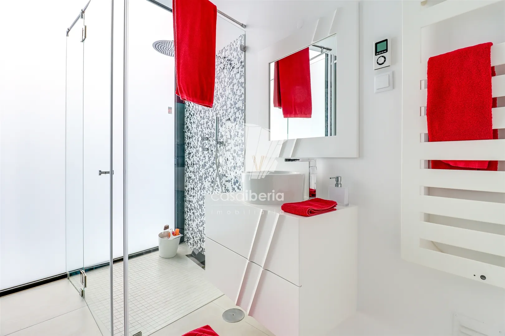 On the ground floor, you'll find a spacious and bright living room with a fireplace and high ceilings, creating an unparalleled sense of space and sophistication. The fully equipped kitchen includes a practical pantry and combines functionality with modern design. This level also features an office — perfect for remote work or as a multifunctional space — two large suites with built-in wardrobes and private bathrooms, and an additional guest bathroom. The villa is equipped with underfloor heating and air conditioning, ensuring year-round thermal comfort.