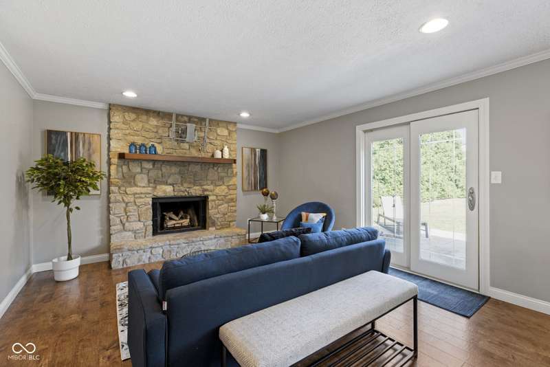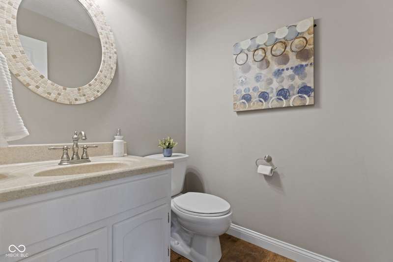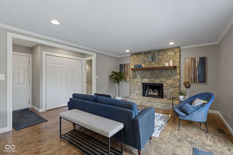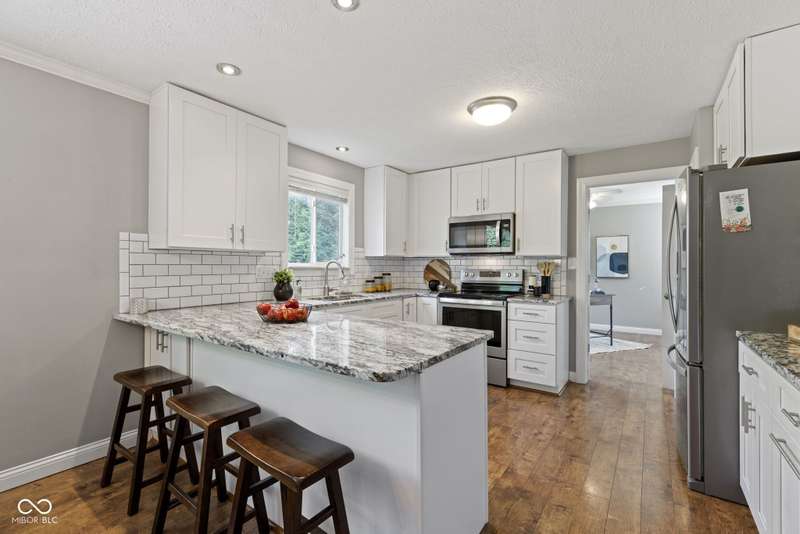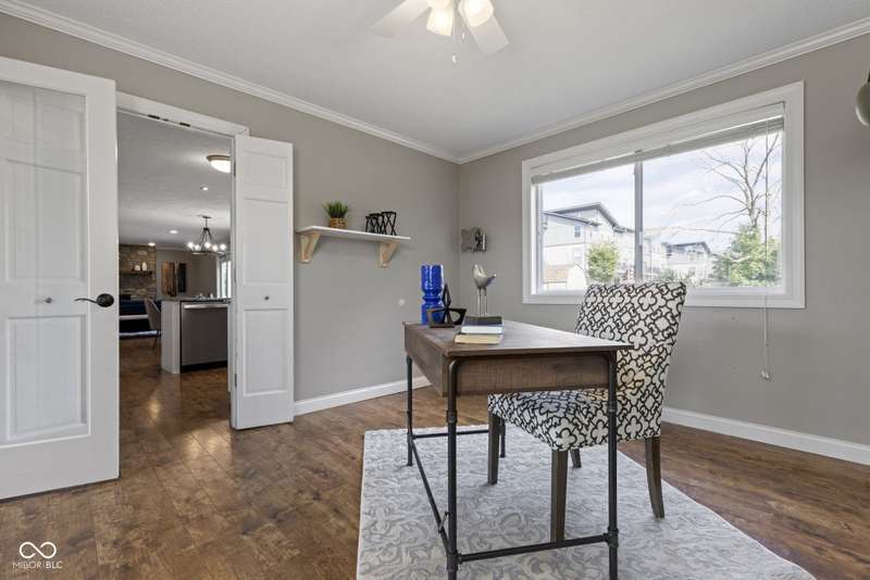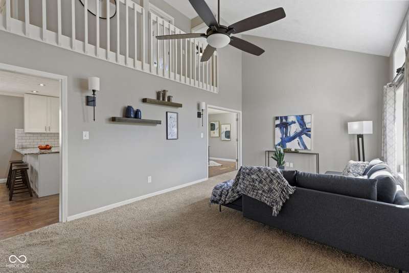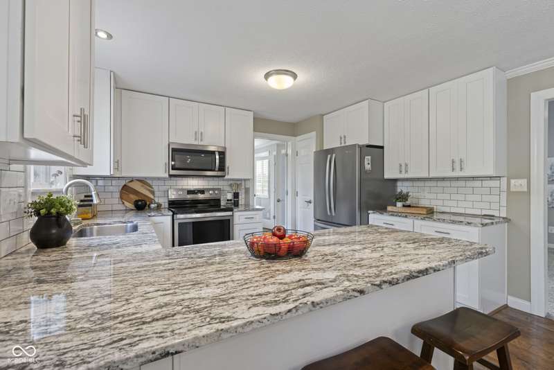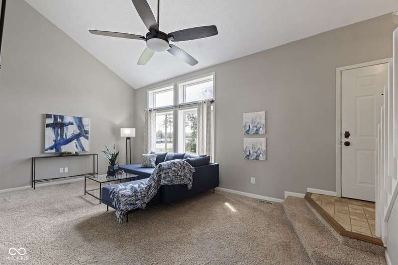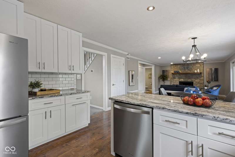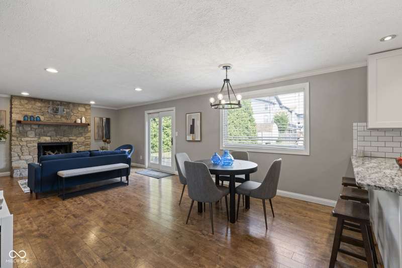 LOCATION doesn't get better than this! Walk to Nickel Plate district & all it has to offer +/- 15 minutes & Roy G. Holland Park in the center of the neighborhood* This fabulous contemporary updated home has so much to offer including a 1/2 acre lot with NO HOA & well manicured landscaping* Just step inside and you'll fall in love with the vaulted 2 story ceiling in the living room with views of the upstairs white craftsman style railing plus floor to ceiling windows which stream tons of natural light* Glass french doors open into the office/flex room* Fully remodeled kitchen ('19) boasts new white 42" cabinets w/soft close dove tailed construction drawers & cabinets, subway tiled backsplash, granite tops w/additional seating & all stainless appliances stay* Kitchen opens into the spacious breakfast nook with large picture window overlooking the beautiful fully fenced backyard & cozy family room with floor to ceiling stone fireplace w/gas insert* Laminate wood flooring runs through those rooms* Washer & dryer stay too* Upstairs has 3 beds & 2 full baths* Primary suite w/walk in closet & en suite bath offering double vanity & walk in shower w/custom tile* Crown molding in FR, breakfast rm, beds 2 & 3* Replacement vinyl windows thruout* Newer mechanicals incl. gas furnace ('23), A/C ('22), gas water heater ('23)* Outside you'll find great outdoor living/entertaining space on your covered front porch & oversized concrete back patio* Private backyard surrounded by large mature Evergreens which give privacy year around* Shed w/loft & electricity + playset* Hard to find a private 1/2 acre lot walkable to downtown Fishers in a move in ready home at this price!