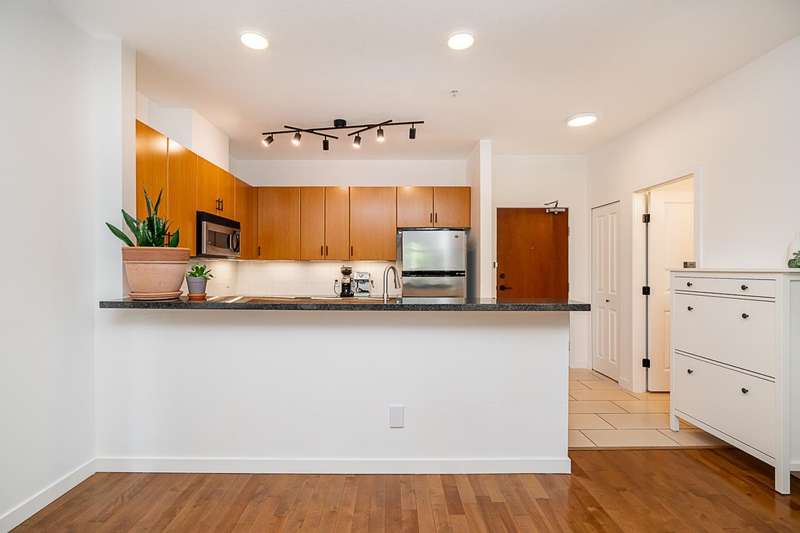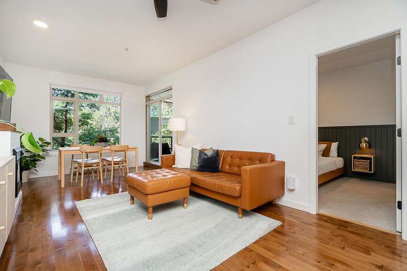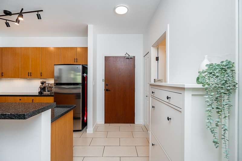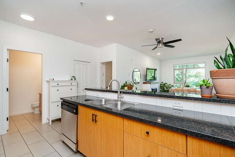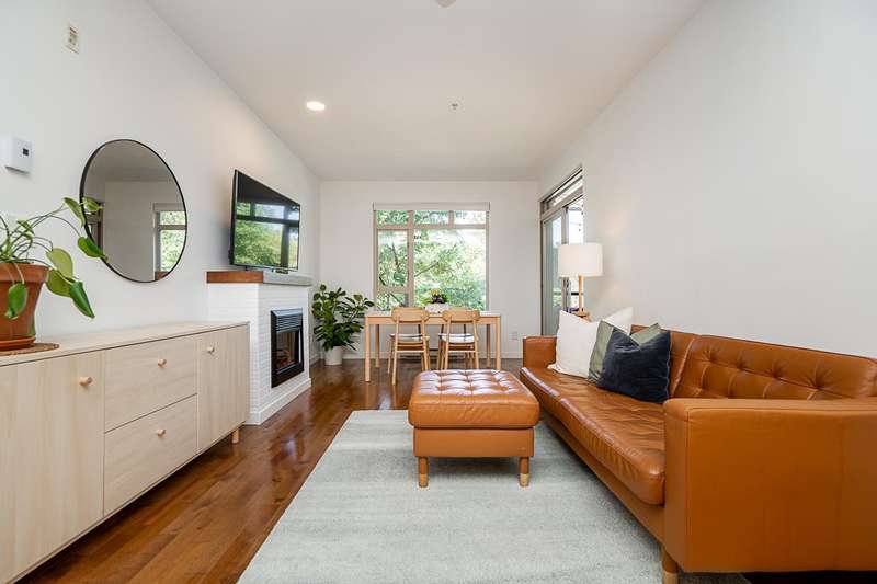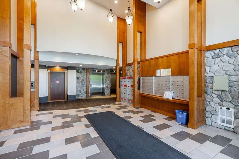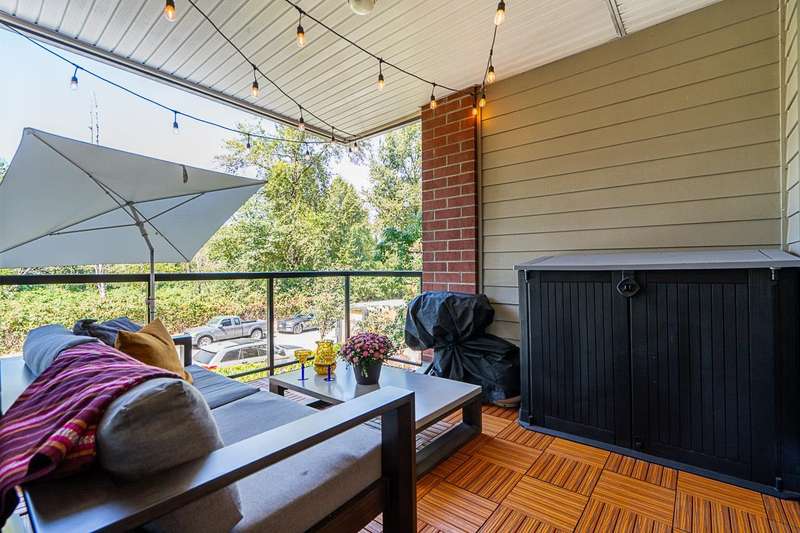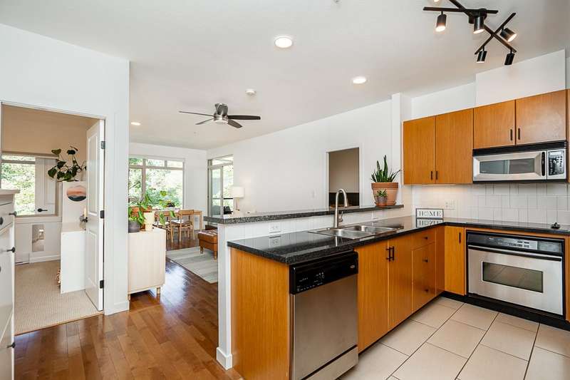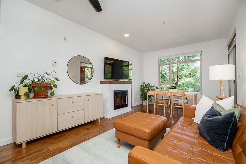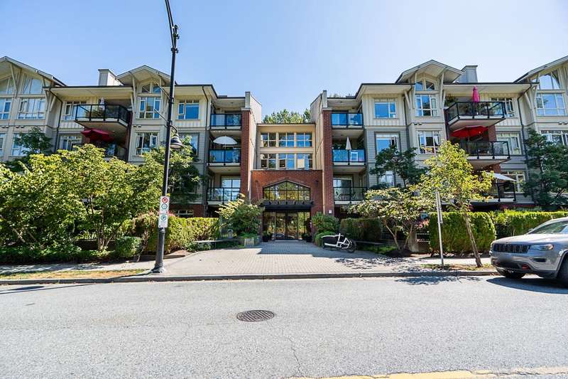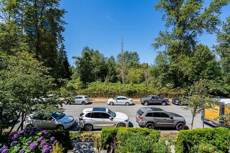 "Suter Brook" in the heart of central Port Moody is the perfect blend of nature & modern living. Surrounded by forest greenbelts & nature trails, this 2-bdrm + den apt offers flex space for an office or hobby room. Oversized windows & 9-foot ceilings provide abundant natural light. The 120 sq ft covered balcony offers year-round outdoor living. Owner's pride shines throughout this immaculate apartment, featuring granite countertops & S/S appliances. The primary bdrm has a feature wall & a walk-through closet. Cozy fireplace with a faux brick finish & mantle highlight the spacious Lvgrm. Recent painted walls, ceilings, updated blinds & lighting make this apartment move-in ready. Tandem parking for two vehicles & additional secure bike rack with a separate storage locker.