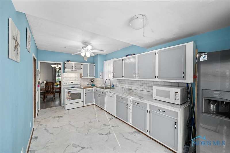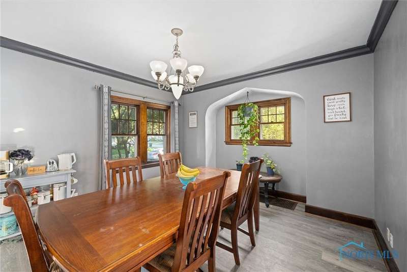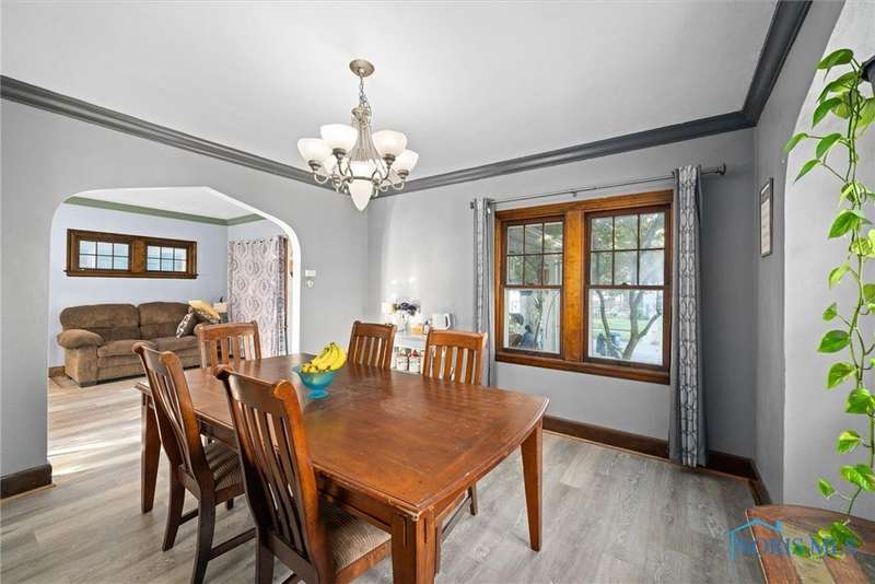West Toledo Gem!! This home offers 3 spacious bedrooms plus a bonus room that can be used as a 4th bed or office. The enormous living room has vinyl plank flooring, coved ceilings, and a fireplace. Formal dining room with natural wood trim. Recently updated kitchen includes fresh paint, new floors, and tile backsplash. With a great layout and ample room, this home offers comfort, convenience, and welcoming space for everyday living. Bonus features include a full basement, 2-car detached garage, and huge yard. Backyard veers off to the left and has two additional spaces.