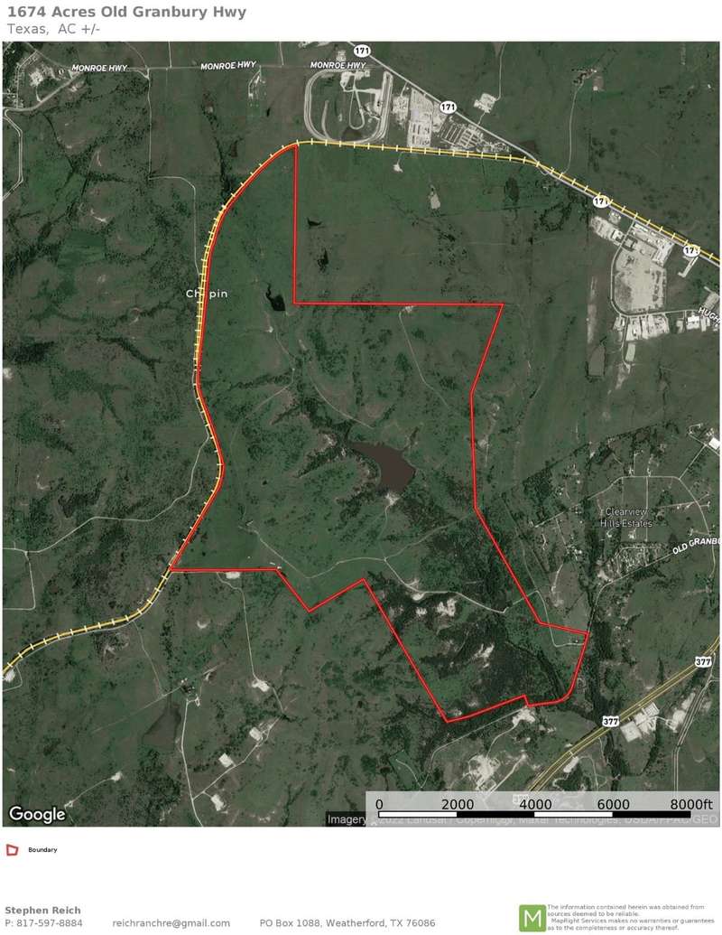 Tremendous development opportunity located in the heart of the westward movement. This hard to find 1,674 plus or minus acre parcel is prime for a mixed use development and is locatd only 30 miles from downtown Fort Worth, Texas. Cresson is a rapidly growing area due to its convenient location to Fort Worth via Highway 377, a new loop and ease of railroad accessibility. This tract features rollling terrain and scattered hardwoods providing perfect settings for residential development. 1,300 feet of road frontage and being located less than 1.5 miles from the new loop makes accessibility extremely easy. Over two miles of Atchison, Topeka and Santa Fe rail frontage make the industrial opportunities endless.