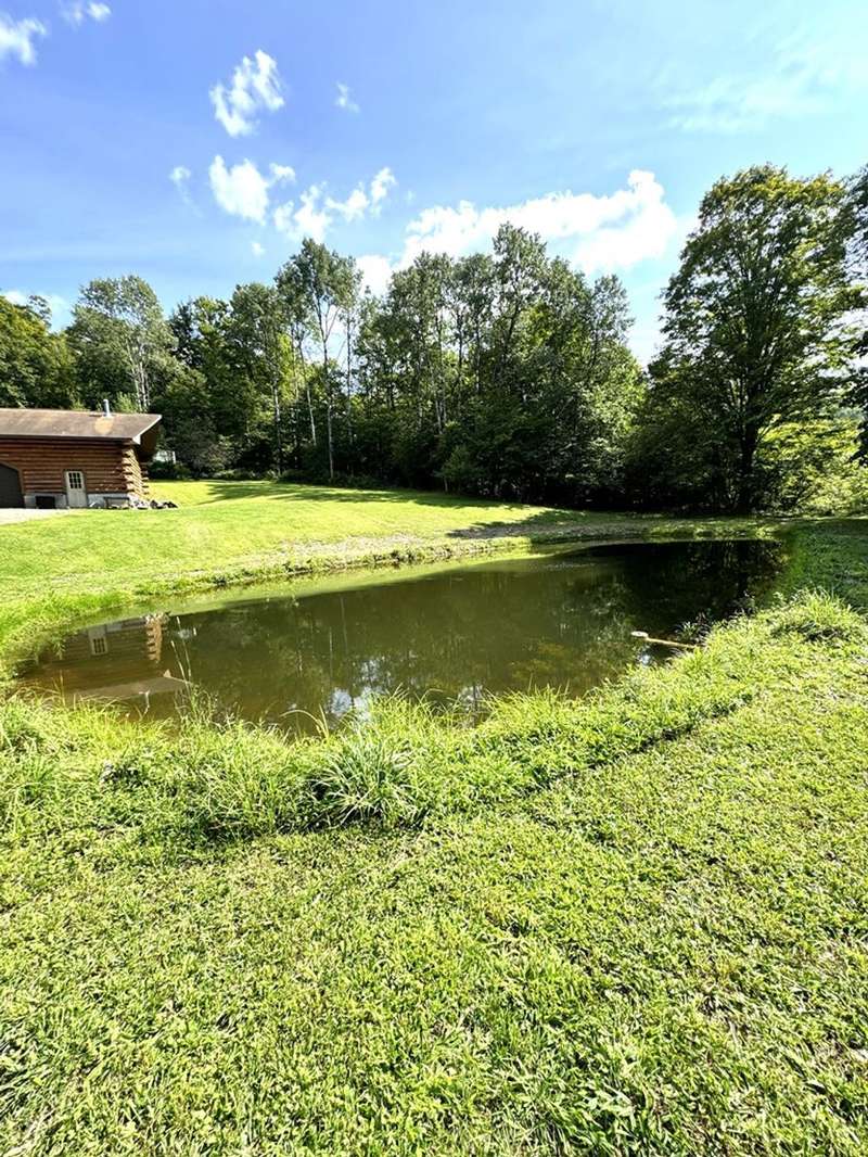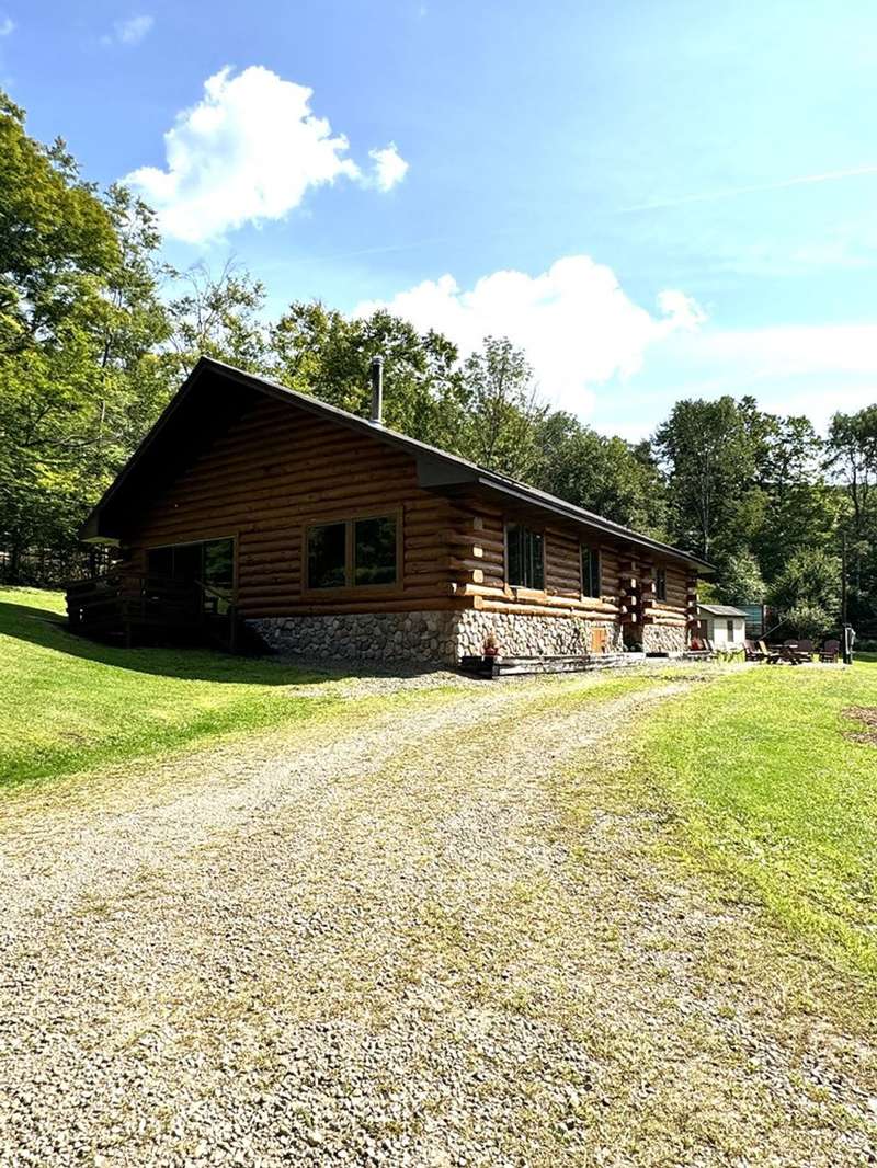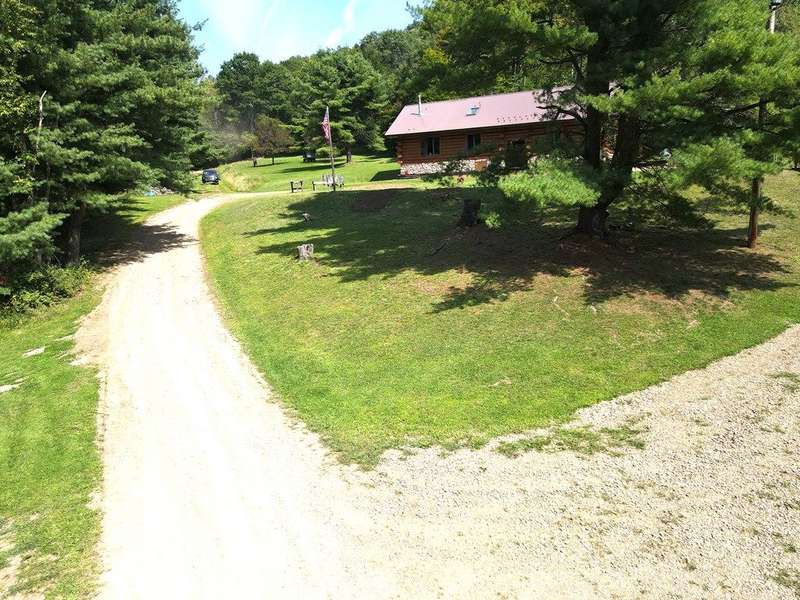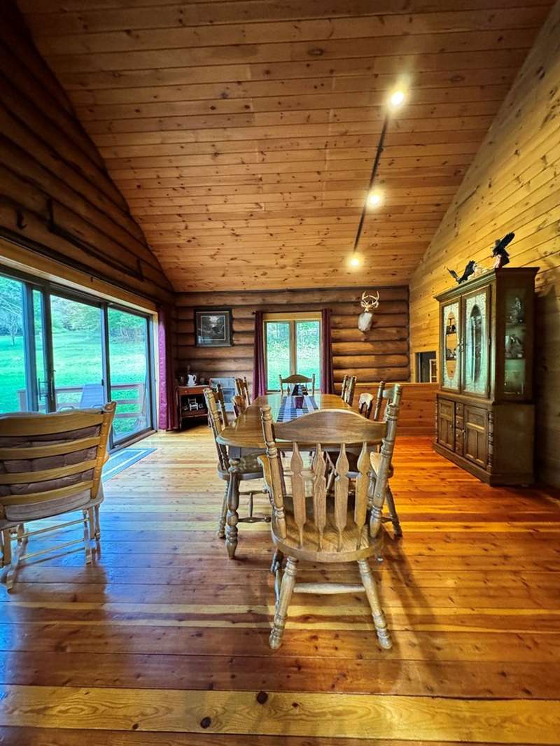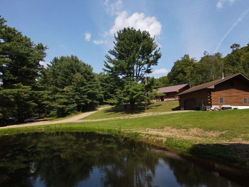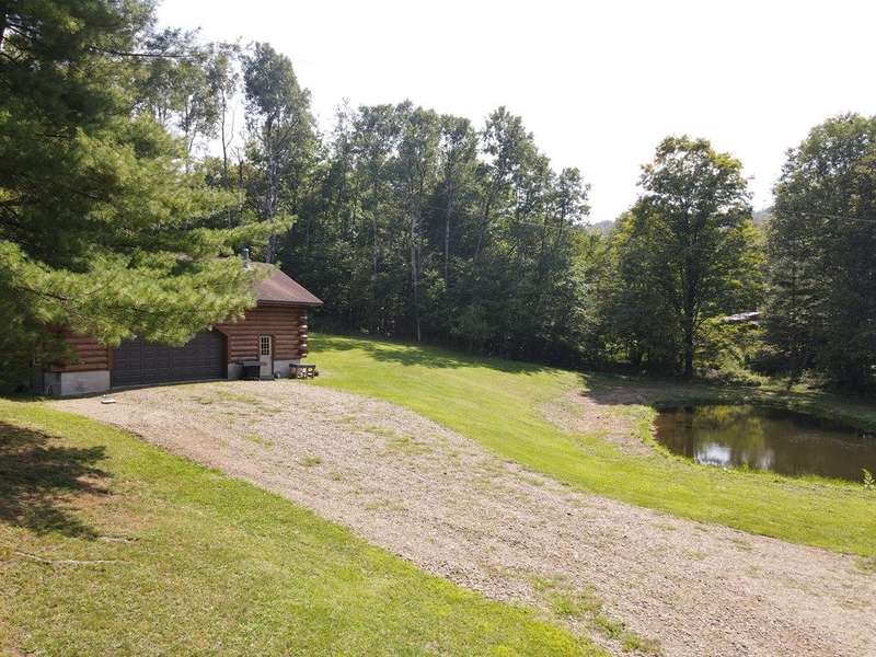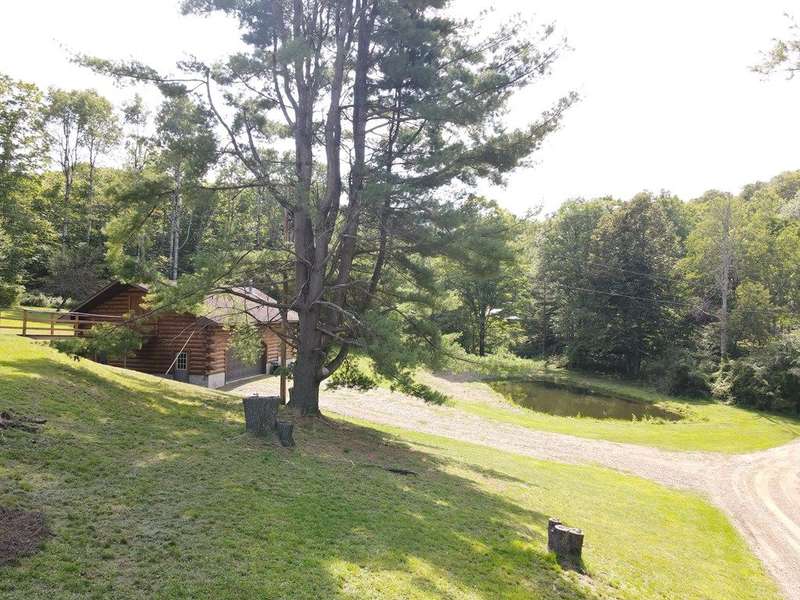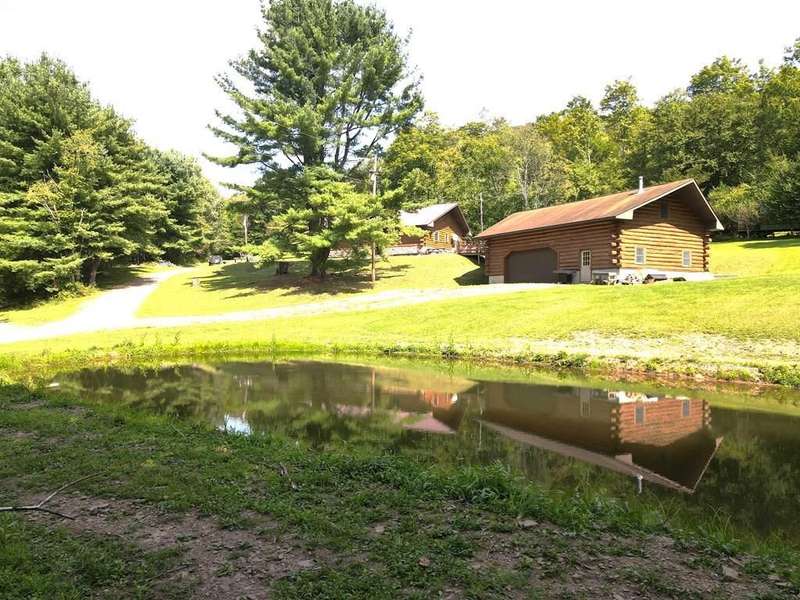 Nestled in a secluded and private dead-end road, discover this meticulously picturesque log home sitting on 90+ acres overlooking the stocked pond. While driving up the winding grass centered graveled road, time slows you down to admire the beauty of the area. The wildlife wondering with the sense of being so relax and no fright as tho they have ownership over the land with their food plots, apple trees and several springs. This custom designed log home is built to ensure durability and quality, energy efficiency and aesthetic appeal. The main house, was built around the center of the home, composing of two bedrooms, 2 full bathrooms, formal dining room, enormous living room, gourmet kitchen and home office space. In the spacious living/dining room are large full-length windows to admire the wildlife frequently frolicking around. Detached two story two car garage with large workshop area and additional storage on the second level. Numerous trails throughout. Surveyed/Clean and Green.