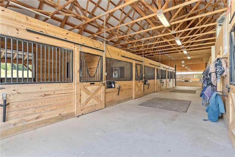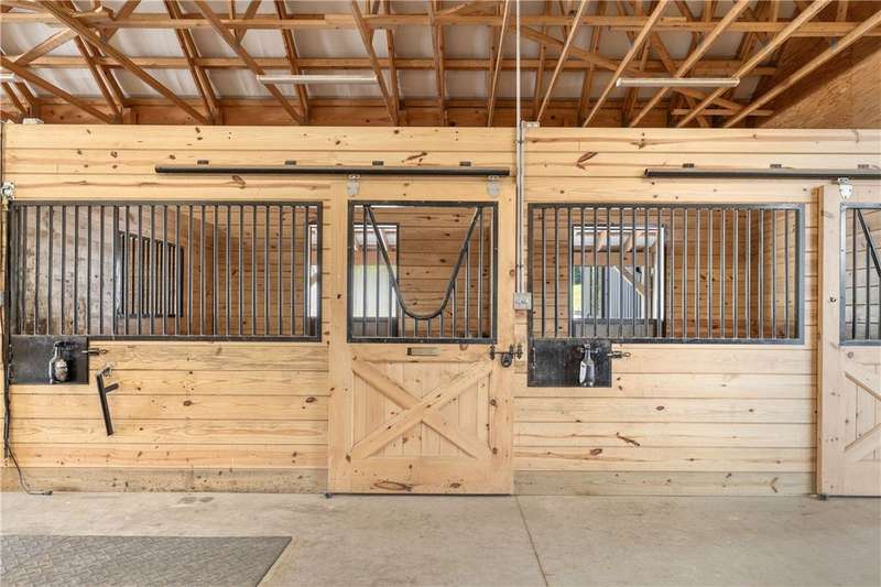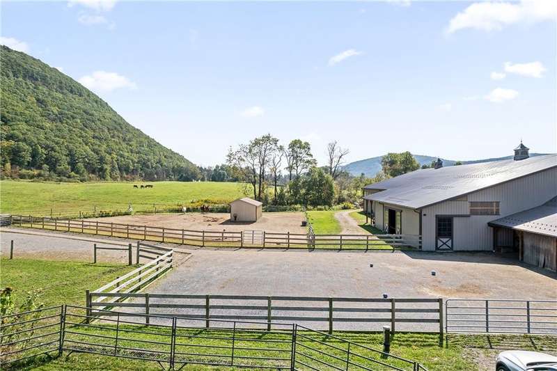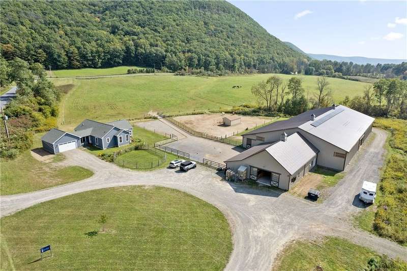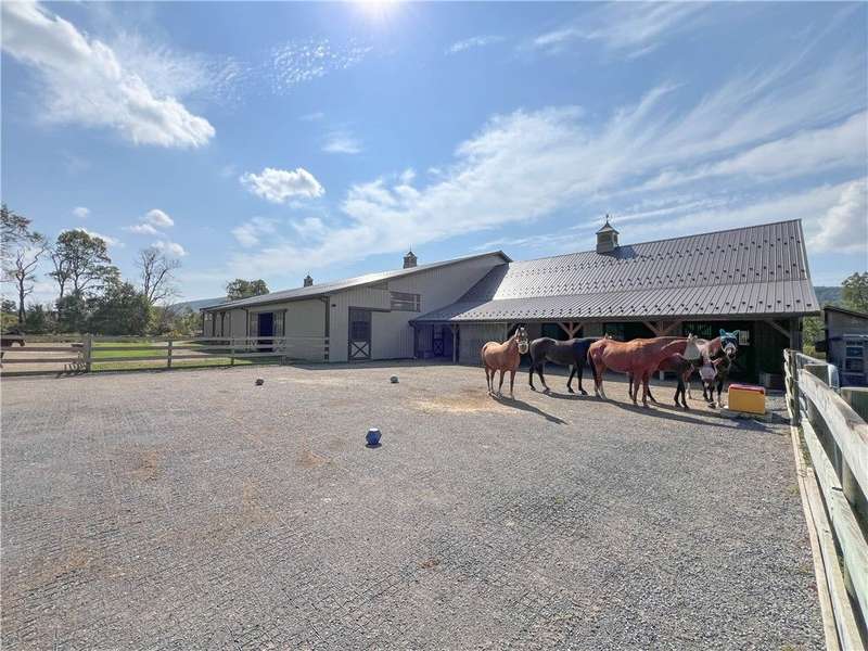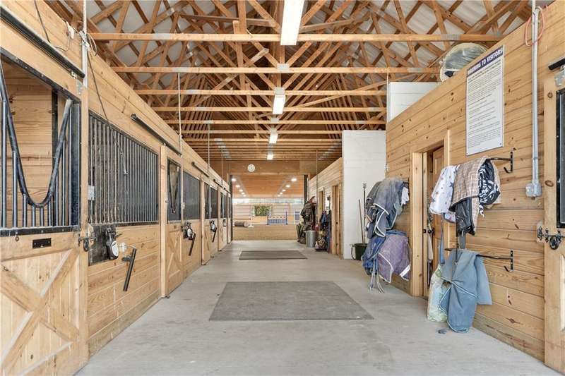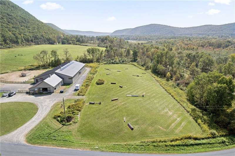 This exceptional equestrian property offers a rare combination of features. Set on 30 acres only 15 minutes from Cornell University in the Finger Lakes region, this facility's amenities are top of the line! The barn features 6 stalls, all with 12x12' mats, outlets and automatic waterers, a wash stall, heated bathroom, feed room, and heated tack room with observation area. 5 stalls have Dutch doors to the run-in shed and dry lot paddock that leads to a 20-acre pasture. The 80 x 160 indoor arena is perfect for year-round equestrian needs and the professionally built turf riding field with cross country jumps offers even more riding space. An additional paddock with run-in and large storage area off the arena round out this elite facility. Relax and watch your horses through the wall of windows in your 2020, 3-bedroom home with an open floor plan, 9 ft ceilings, lots of light, a perfect primary suite and plenty more space in the basement to expand or use for gym/rec activities. Geothermal heat for the home and solar for the house and stable result in very low utilities. Currently an income producing boutique boarding business. Continue a business or use it all for your own horses! Listed Taxes based on full amount but currently ag exempt so only paying $10,765 total annually for property taxes.