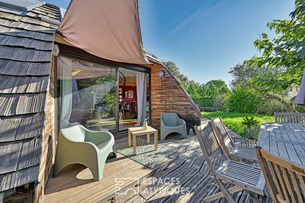 Outside, the architecture continues: the swimming pool nestles in a large wooden terrace, an invitation to relax. The garden, designed as an intimate landscape, offers a breath of serenity to every gaze.