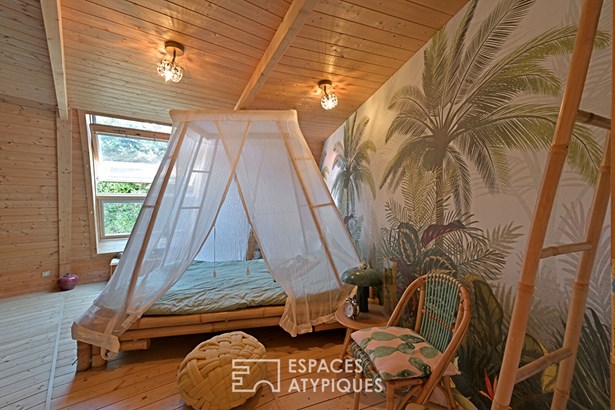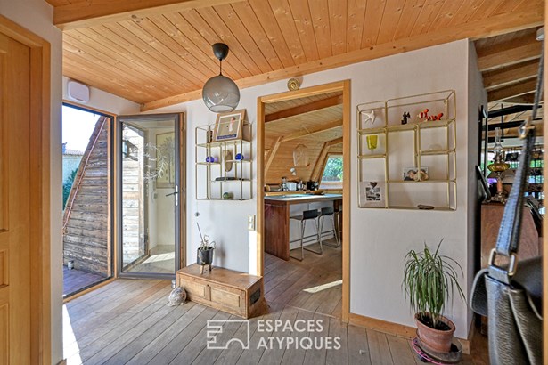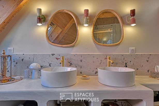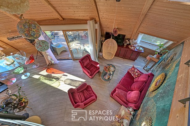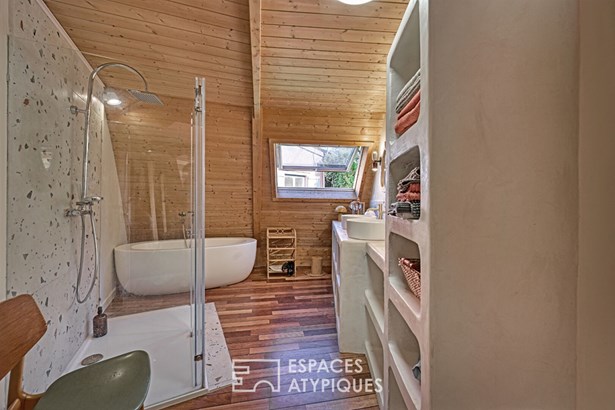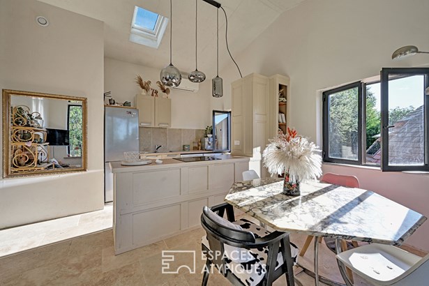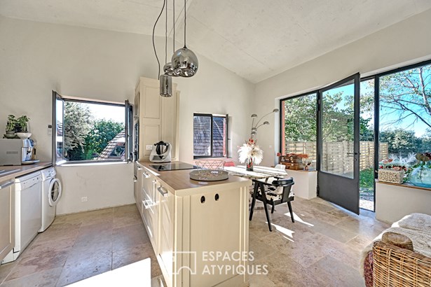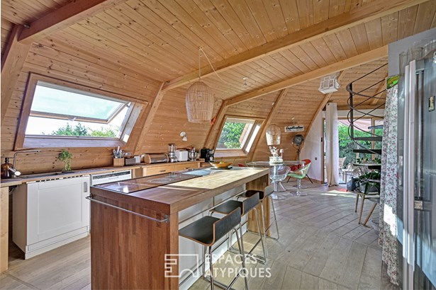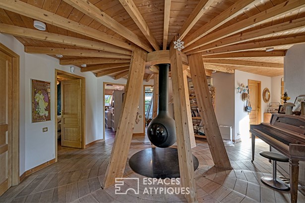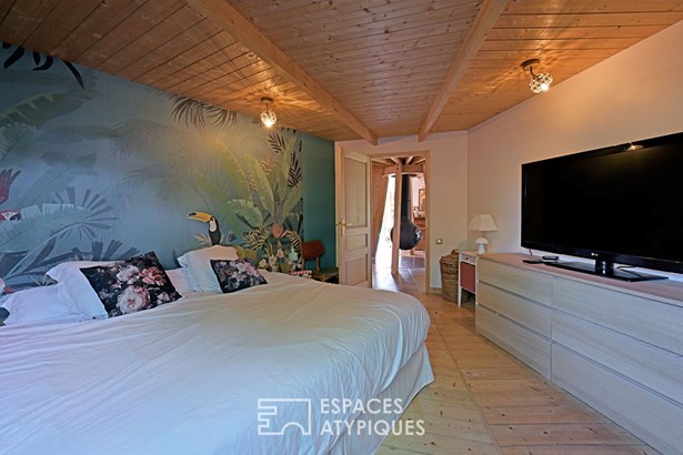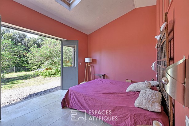 And then, like a house within a house, a delicate and contemporary outbuilding extends the living experience. It offers a living room with a fitted kitchen, a bedroom, and a bathroom with a toilet. A 30 sqm workshop completes the ensemble. Here, everything has been designed for sustainable and harmonious living: a central stove, a Canadian well, reversible air conditioning, solar panels, red cedar floors, and pine bedrooms.