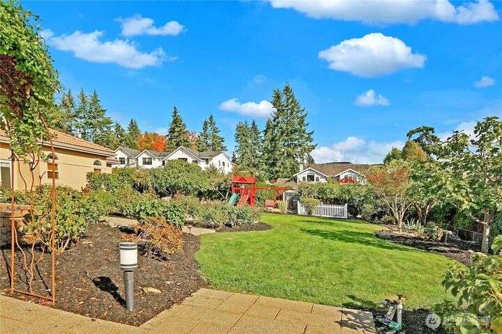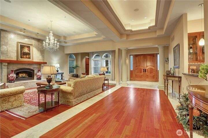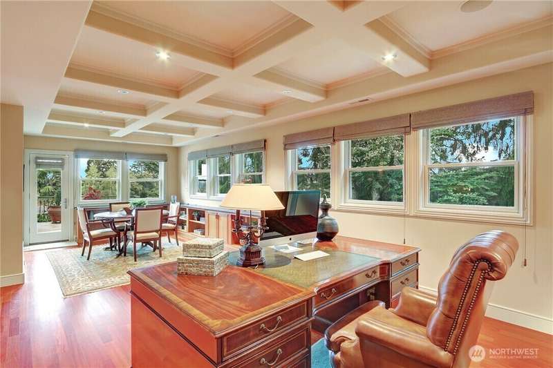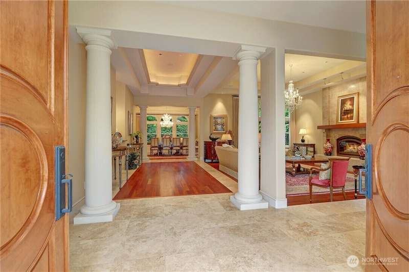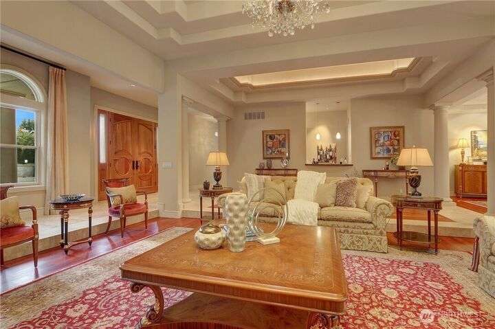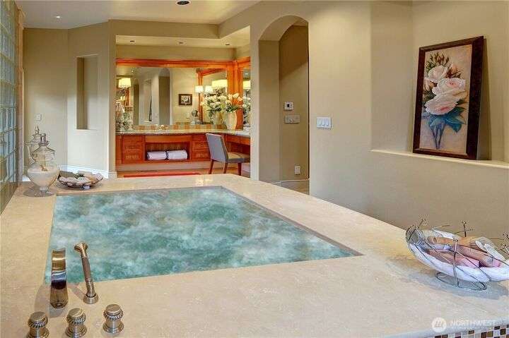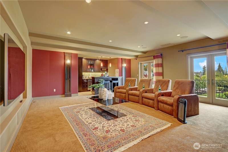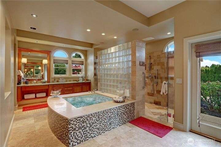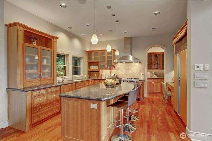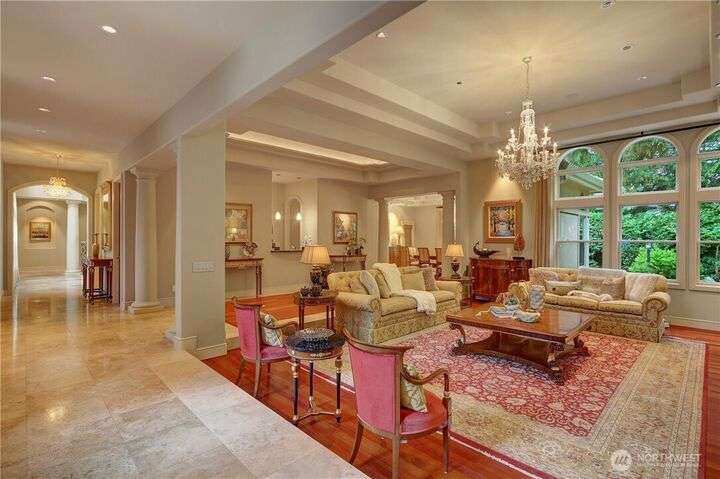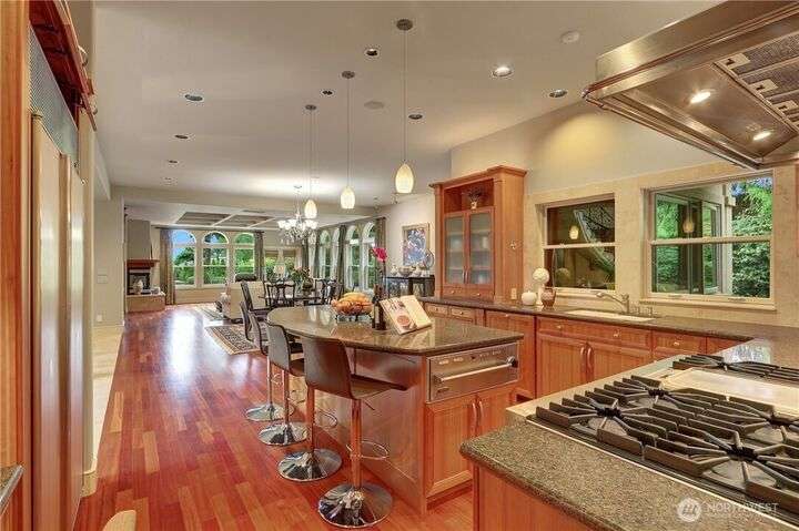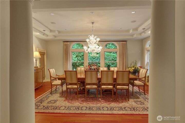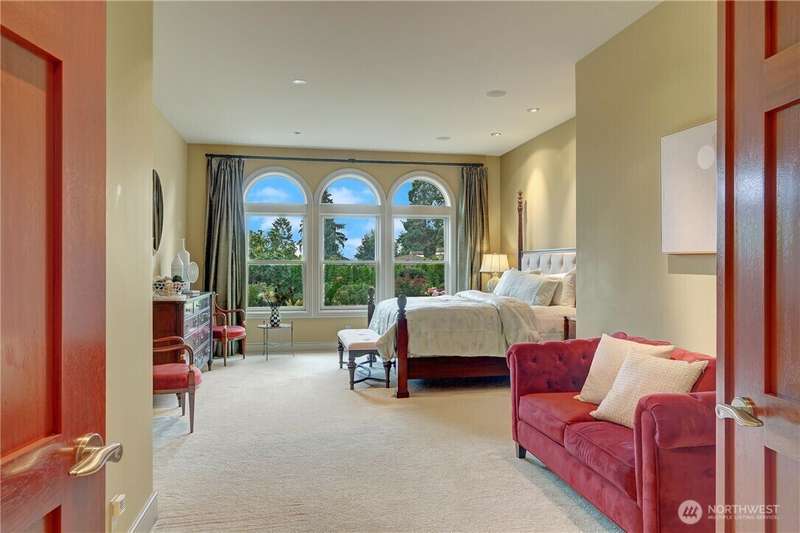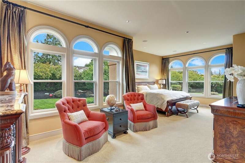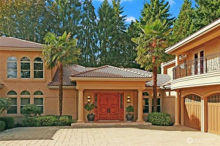 Magnificent Mediterranean estate rests at the quiet & private cul de sac, close to parks, lake & downtown Bellevue. Exquisitely built home sits in a shy of ¾ acre leveled lot/w expansive southerly yard featuring variety of fruits ripening from June to Dec. rose garden & year round flowers, play ground & lush lawn. Grand entry leads to a large living rm & formal dinning. A huge skylight hovers over an indoor garden next to the artistic wrought iron staircase. S facing family room seamlessly flows inside out. Primary STE/w walls of arch windows overlooking the garden. Executive office, theater & 2 chief’s kitchens. Designed/w good fengshui both for peaceful living & joyful entertaining. A quintessential resort like Home!
