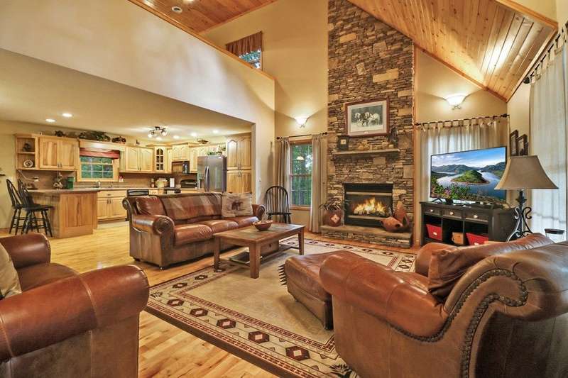 Beautiful custom cabin tucked inside The Highlands At Big South Fork (GATED EQUESTRIAN COMMUNITY), offering both privacy and charm. Home sleeps 12 or more people, Features include vaulted ceilings, hardwood floors ,Full Finished Basement and a stone firep