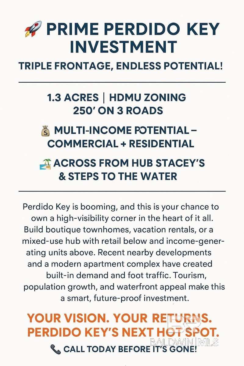 Unlock an exceptional investment opportunity in one of Perdido Key's fastest-growing corridors. This 1.3-acre property offers an unparalleled mix of visibility, access, and flexibility, with 250 feet of frontage each on Innerarity Point Road, Galvez Road, and Cruzat Way. Zoned HDMU, it is primed for both residential and commercial development, creating multiple income streams from a single site. Originally platted into 10 residential lots, the property is ideal for boutique townhomes, upscale vacation rentals, or a mixed-use destination that combines ground-floor retail with high-demand upper-floor Airbnb units. Imagine the rental income from a thoughtfully designed complex featuring a coffee shop, boutique retail, or wellness studio below, paired with luxury short-term or long-term rentals above?perfectly positioned to capture year-round tourism and steady local demand. The location is unbeatable: across from the popular Hub Stacey's, next to picturesque Innerarity Point Park, and steps from Galvez Landing for boating, fishing, and waterfront recreation. Residents and visitors alike will appreciate the ability to walk to restaurants, entertainment, and essential services. The neighborhood's momentum is undeniable, with several new residential communities and a modern apartment complex recently completed, increasing foot traffic and creating a ready-made customer base. The combination of tourism growth, a booming residential population, and the area's coastal charm makes this a rare chance to secure a high-performing asset in a market poised for continued appreciation. Whether your goal is steady cash flow, long-term equity growth, or both, this prime location offers the versatility and demand drivers that investors seek. Act now to claim your place in Perdido Key's dynamic future. NO BEACH MOUSE PERMIT NEEDED! Buyer to verify all information during due diligence.