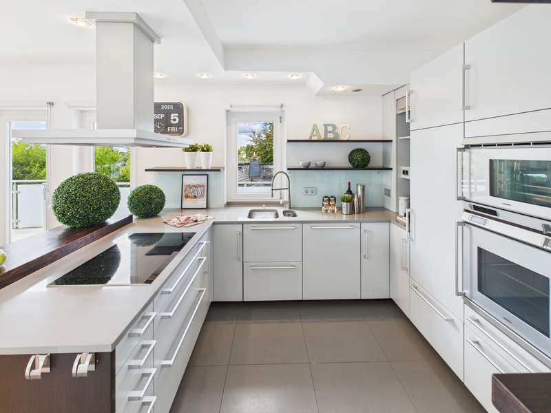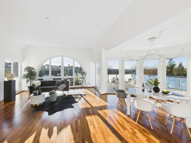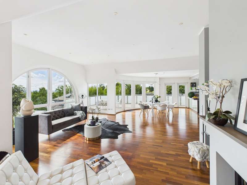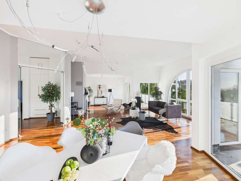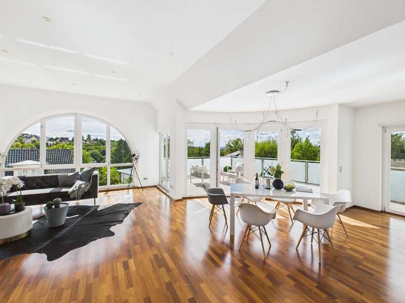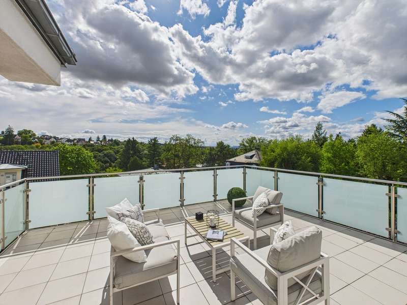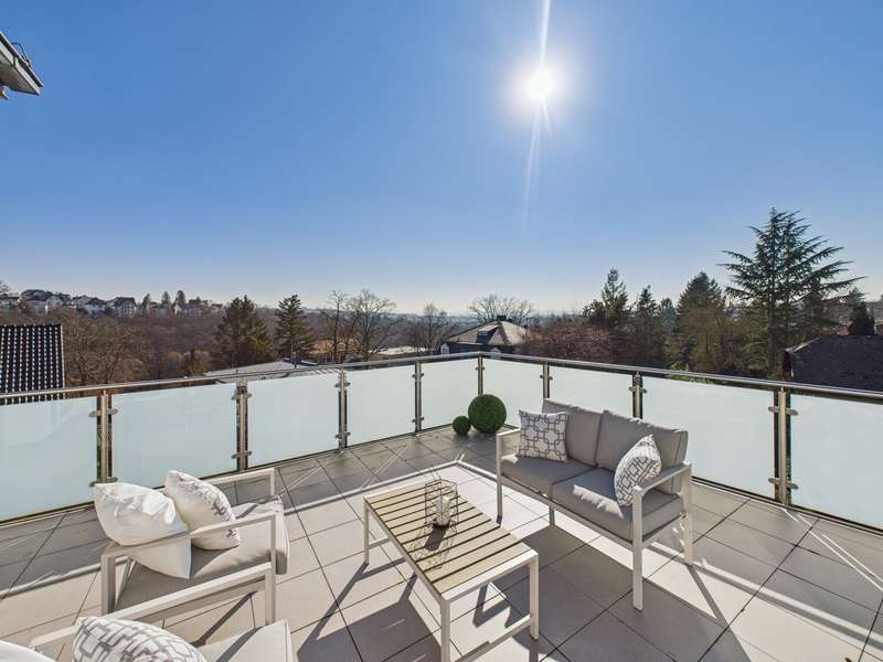 The penthouse maisonette for sale combines elegance and functionality on approx. 218 m² of living space in a sought-after Sonnenberg location. Built in 2005, the apartment is characterized by a tasteful maisonette layout and offers exceptional living comfort. The living level on the second floor is easily reached directly by elevator and is welcomed by a central hallway. There you will find practical built-in wardrobes for your clothes and access to a room with en-suite bathroom, guest WC and the spacious living area. The living area impresses with its spaciousness, openness and a remarkable view over the city of Wiesbaden to Mainz. The high-quality fitted kitchen offers all amenities and is perfectly integrated into the interior design. An adjoining utility room and a practical storage room offer additional storage space. The almost completely wrap-around roof terrace offers you many possibilities and, with two larger, optimally oriented areas, provides the best conditions for enjoying the view and the sun. These outdoor areas invite you to spend sunny days and relaxing evenings in the open air. The "more private" bedroom level is located on the second floor and can be reached from within the apartment via a staircase. This level also has an apartment entrance door and can also be reached by elevator via the communal staircase. In addition to the bedroom, the master area includes a dressing room, a spacious bathroom with bathtub and shower as well as a home office area in front, so that living and working can be harmoniously combined. A comprehensive modernization was last carried out in 2014, including a new gas central heating system in 2022, which meets modern energy standards. The apartment's fittings are of the highest quality, with exclusive features including parquet and granite floors, a bus system for intuitive control of the building services and integrated built-in wardrobes in the dressing room and hallway, which provide ample storage space. All windows are fitted with shutters or blinds to allow individual shading. The apartment is located in a small, well-kept community of owners, which guarantees privacy and a quiet living environment. The property includes a spacious single garage and a duplex parking space, ensuring a convenient parking situation. A separate cellar room is also available. This property is perfect for singles, couples or small families who appreciate spacious living and a quiet yet central location. It combines modern construction with a practical layout and a high standard of comfort that meets the demands of modern living. Arrange a viewing appointment to see the quality and appealing living ambience for yourself.