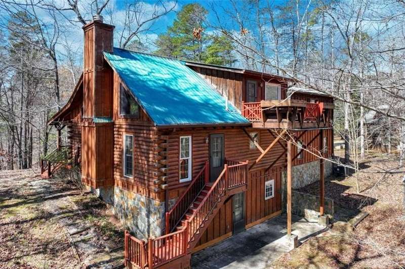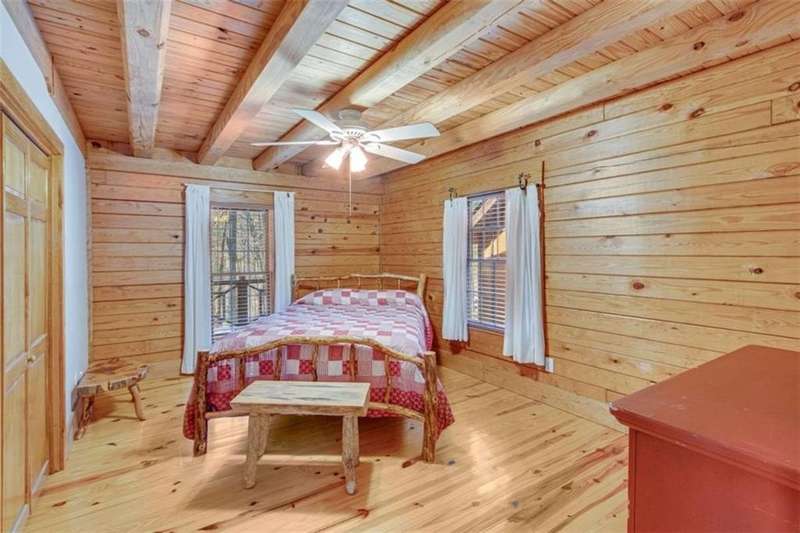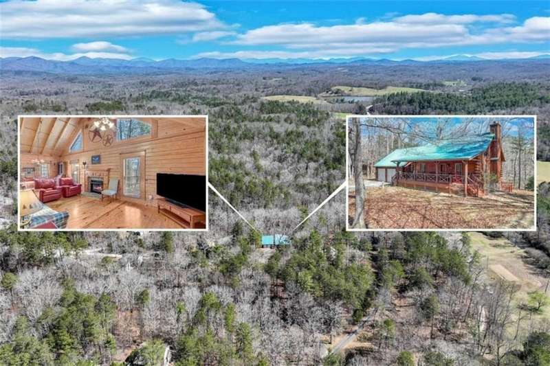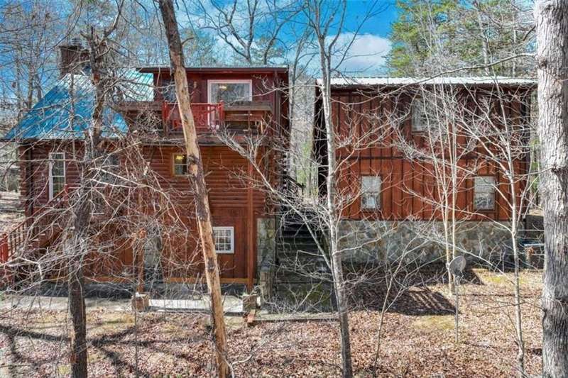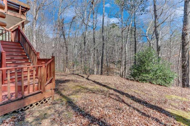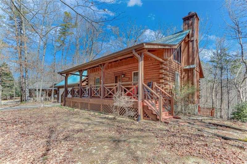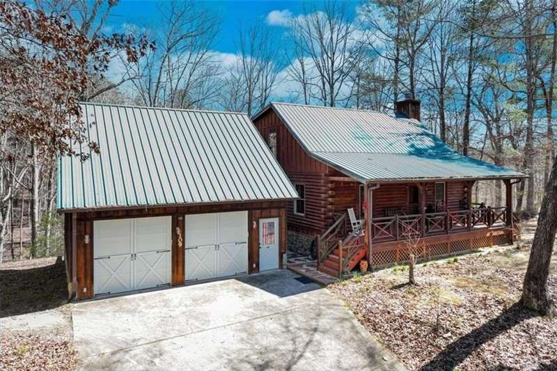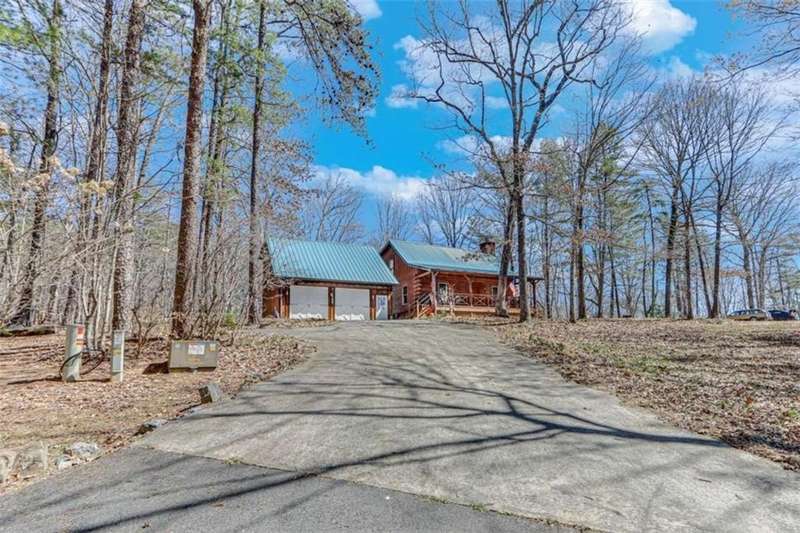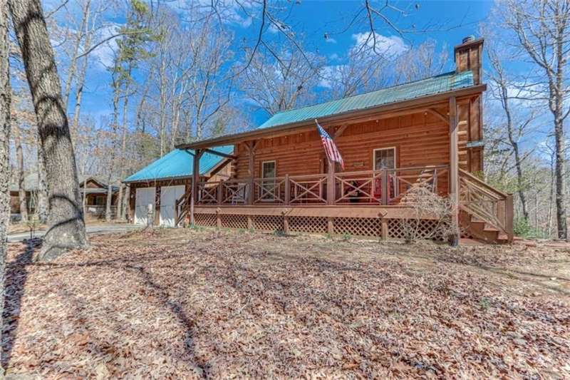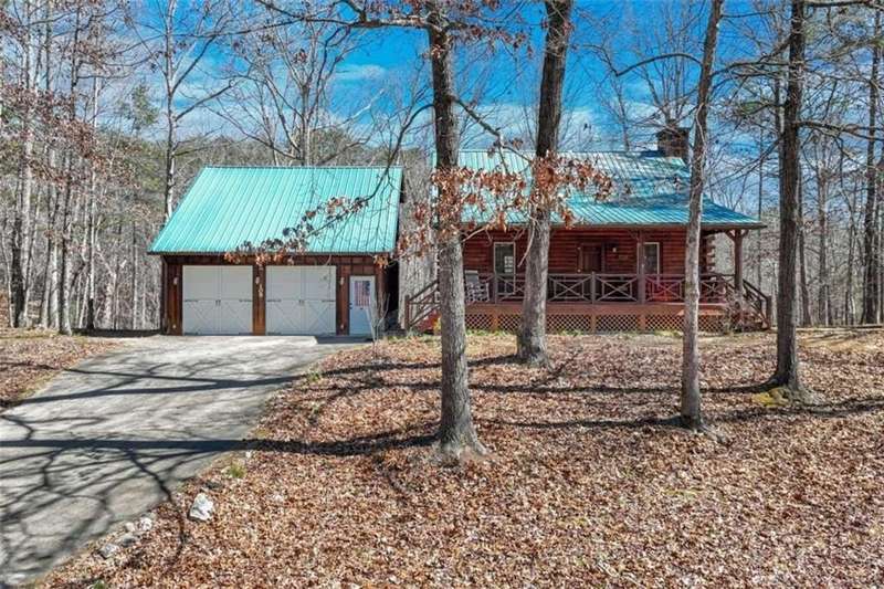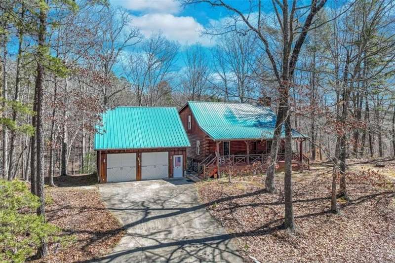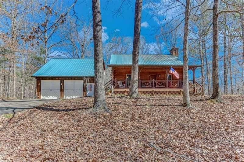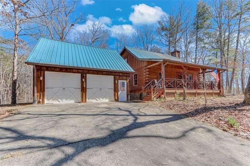 Discover your dream retreat with this stunning custom-built log home, perfectly situated just 10 minutes from downtown Dahlonega and conveniently close to Hwy 400. No HOA on this turnkey property. This charming cabin features a bedroom and bathroom on all three levels, ensuring privacy and comfort for everyone. The detached two-car garage offers ample workshop space and a finished room upstairs, ideal for hobbies or guests. Enjoy relaxing moments on the inviting rocking chair front porch, where you can sip your morning coffee or unwind with a glass of wine in the evening. Inside, the home boasts beautiful pine floors on the main level and upstairs, complemented by beamed pine ceilings that add warmth and character. A cozy gas log fireplace creates a welcoming ambiance for family gatherings. Loved by a family as a vacation getaway, this home is now ready for its next owners. Whether you're seeking a primary residence or a serene vacation spot, this cabin is the perfect choice, and is sold completely furnished. Schedule a visit today to view one of Dahlonega's unique cabins in the woods!