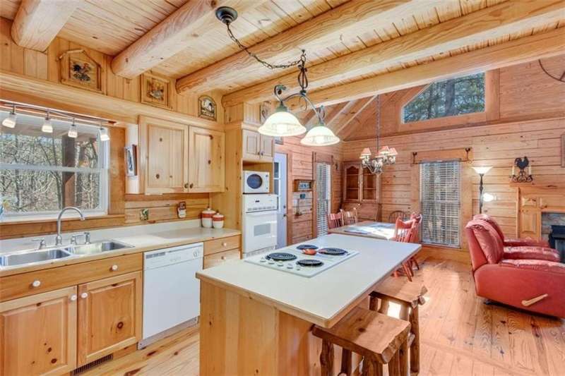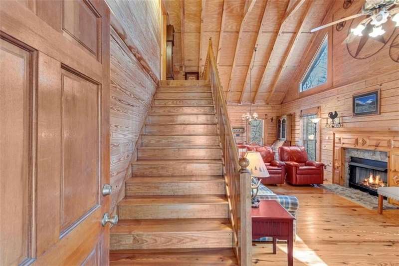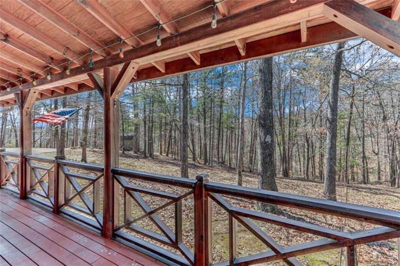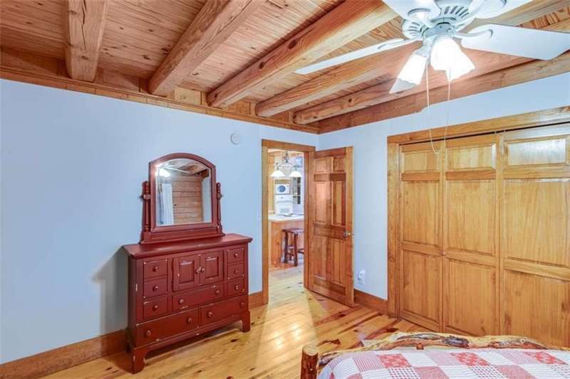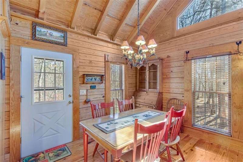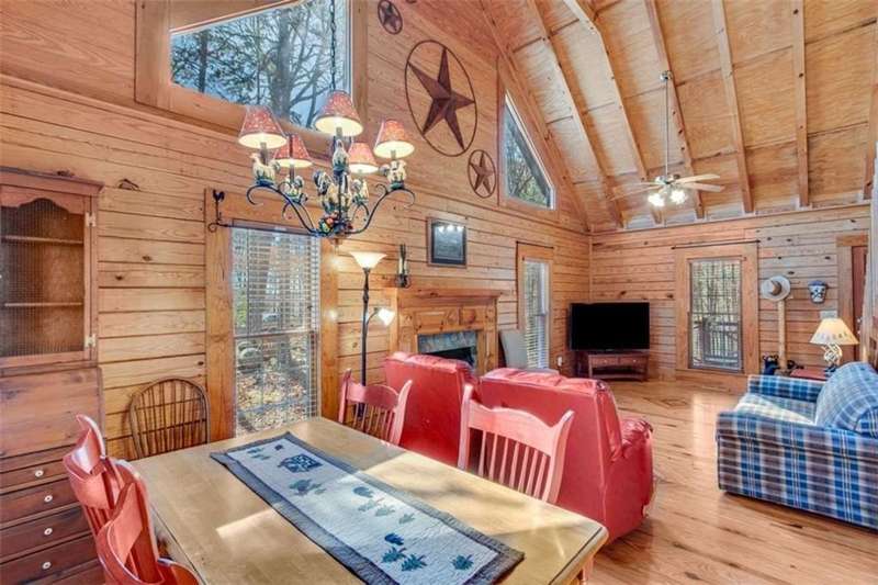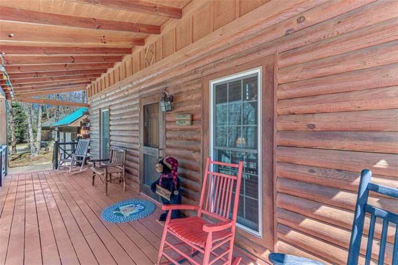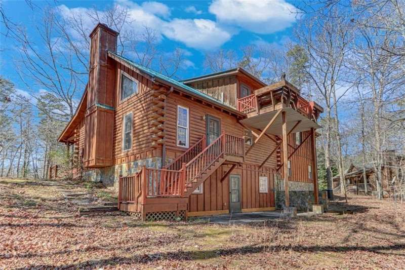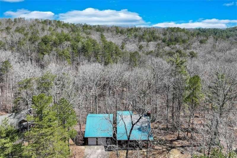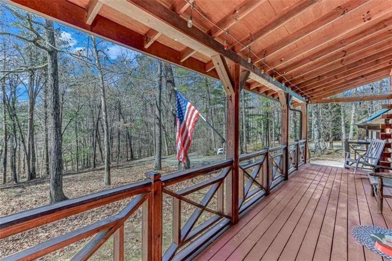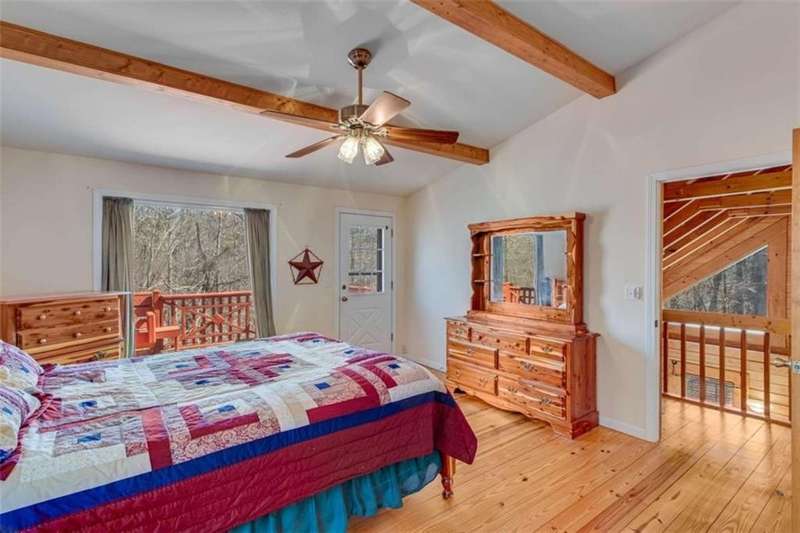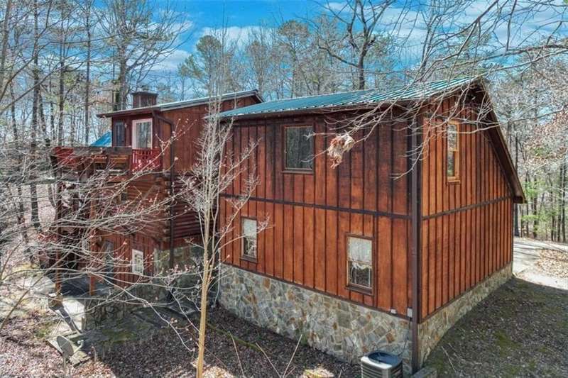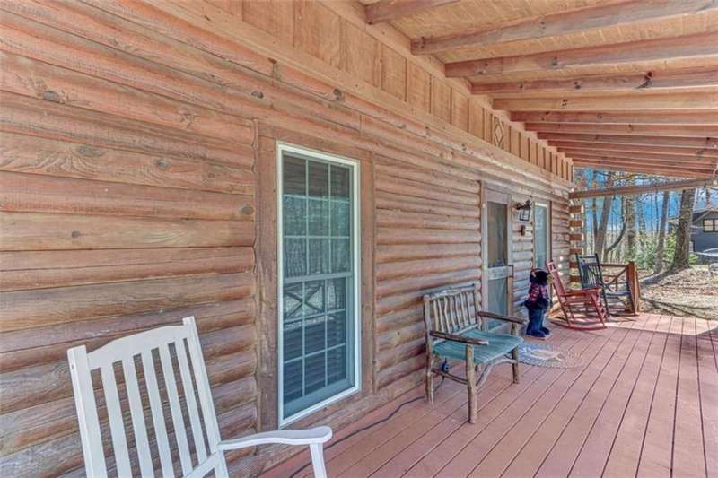 Discover your dream retreat with this stunning custom-built log home, perfectly situated just 10 minutes from downtown Dahlonega and conveniently close to Hwy 400. No HOA on this turnkey property. This charming cabin features a bedroom and bathroom on all three levels, ensuring privacy and comfort for everyone. The detached two-car garage offers ample workshop space and a finished room upstairs, ideal for hobbies or guests. Enjoy relaxing moments on the inviting rocking chair front porch, where you can sip your morning coffee or unwind with a glass of wine in the evening. Inside, the home boasts beautiful pine floors on the main level and upstairs, complemented by beamed pine ceilings that add warmth and character. A cozy gas log fireplace creates a welcoming ambiance for family gatherings. Loved by a family as a vacation getaway, this home is now ready for its next owners. Whether you're seeking a primary residence or a serene vacation spot, this cabin is the perfect choice, and is sold completely furnished. Schedule a visit today to view one of Dahlonega's unique cabins in the woods!