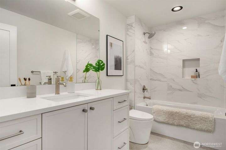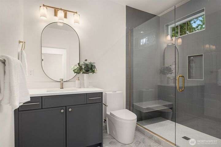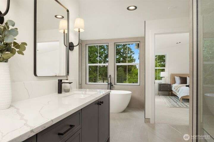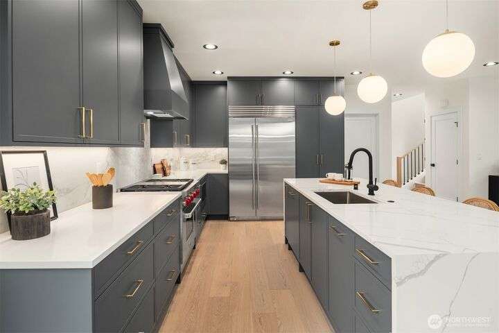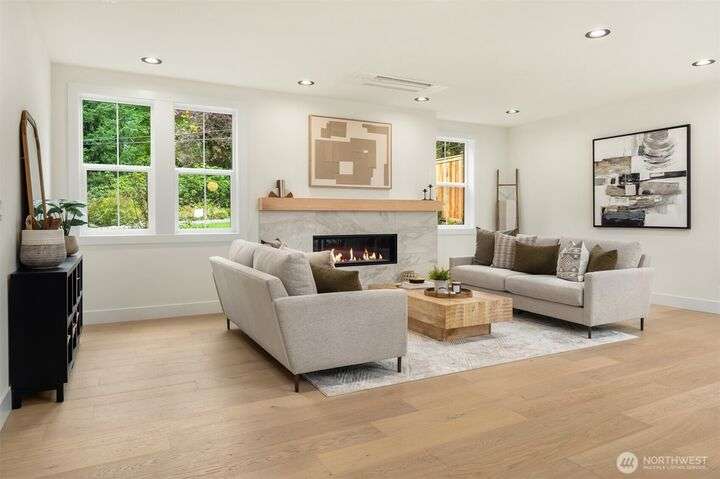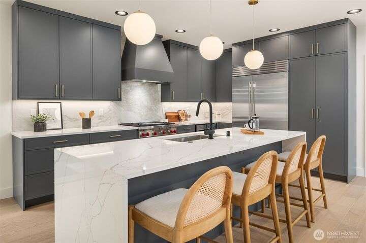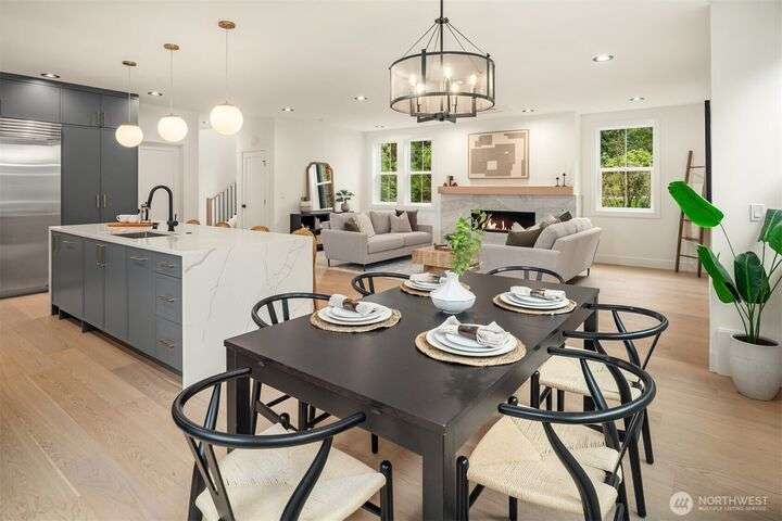 Prestigious Builds presents Kirkland’s latest luxury new construction. Nestled on a quiet dead-end street in the coveted Norkirk community, this exceptional residence boasts a sundrenched interior loaded w/chic & sophisticated designer finishes. Crafted for effortless entertaining, the warm & inviting main level offers an open concept great rm w/dedicated living & dining areas, chef’s epicurean kitchen & rare 5th BR/office. Expansive upper level provides 4BRs incldg sumptuous primary suite w/private veranda & stunning sunset views. Sought-after location in the premier East of Market community: just steps from incredible parks & award-winning Lake WA schools, w/easy access to vibrant shopping/dining, DT Kirkland waterfront & Juanita Village.